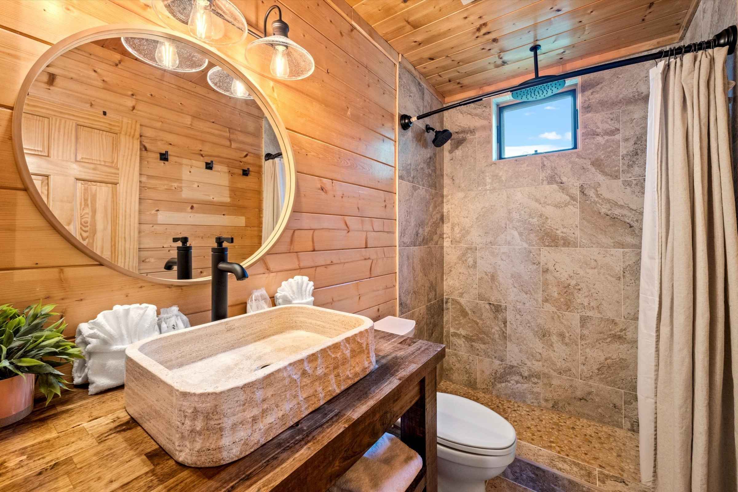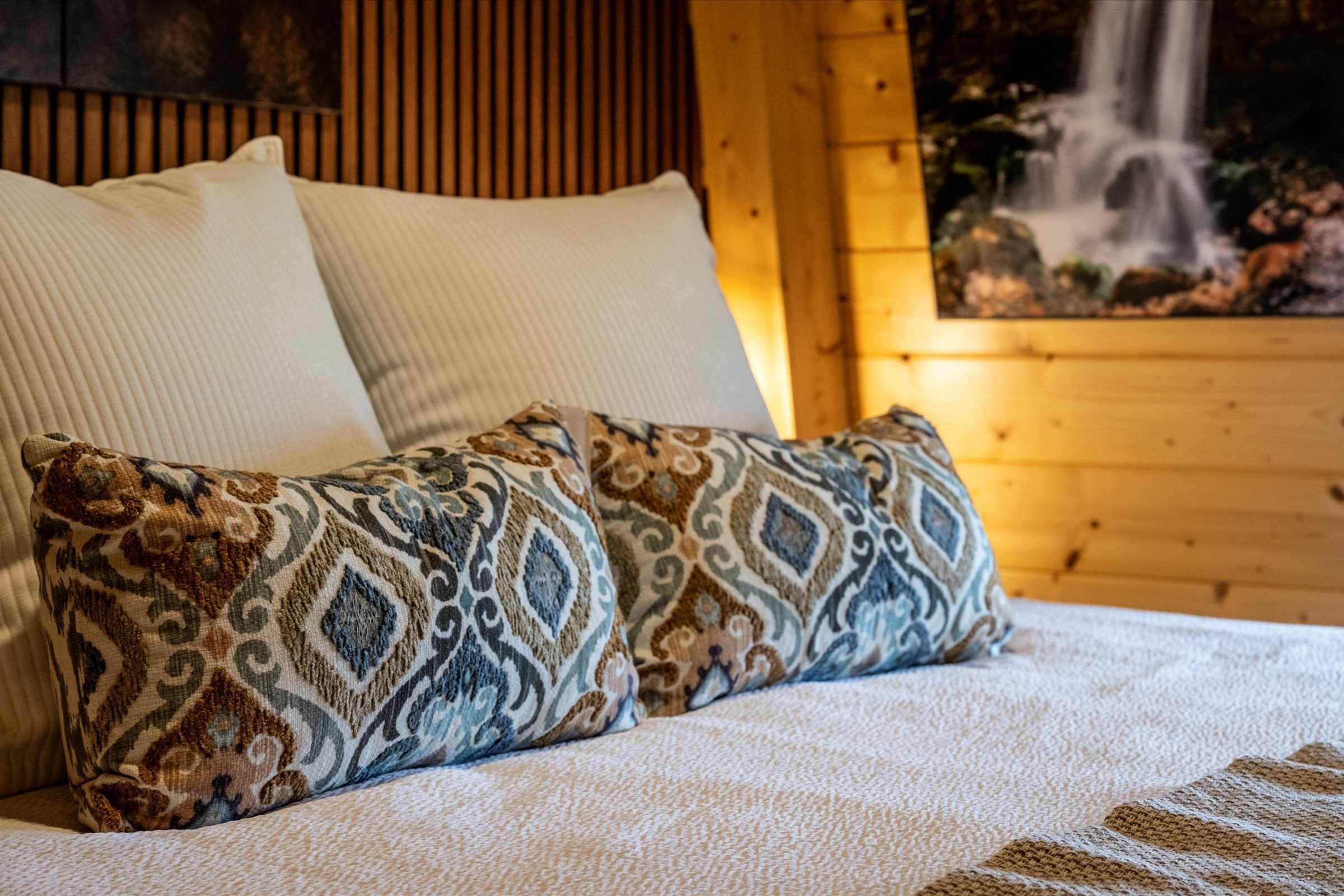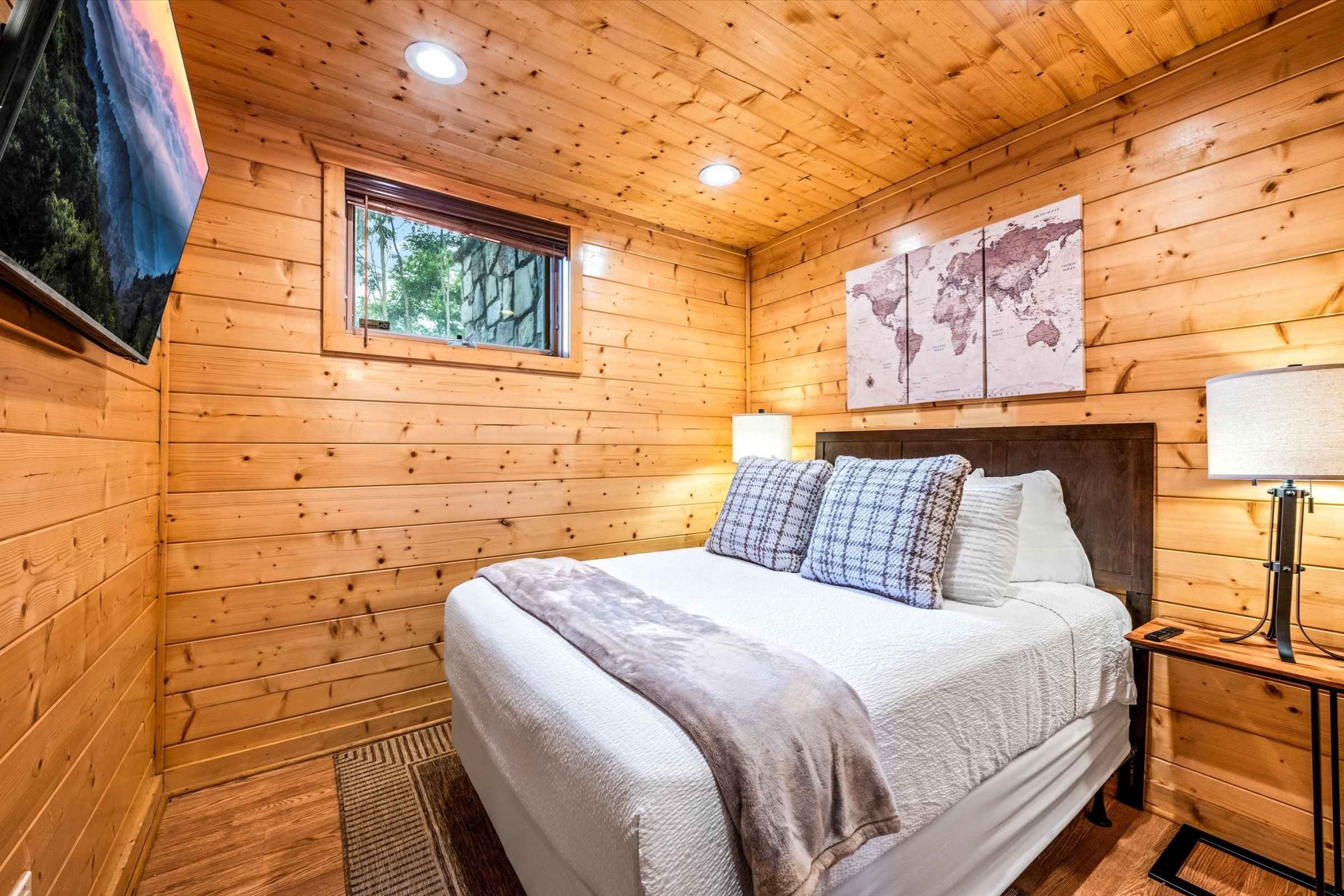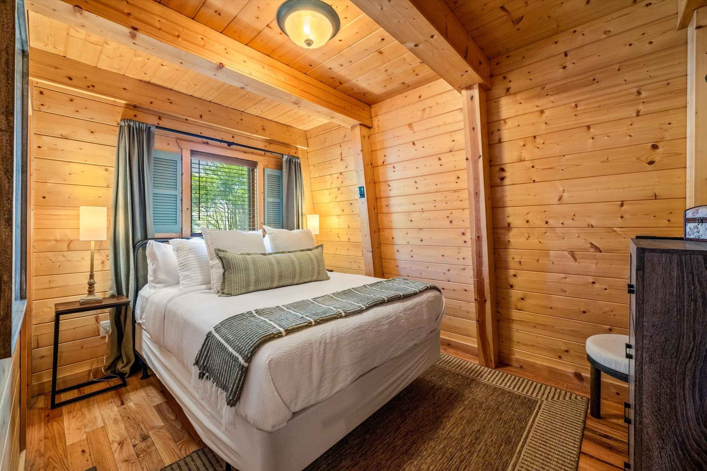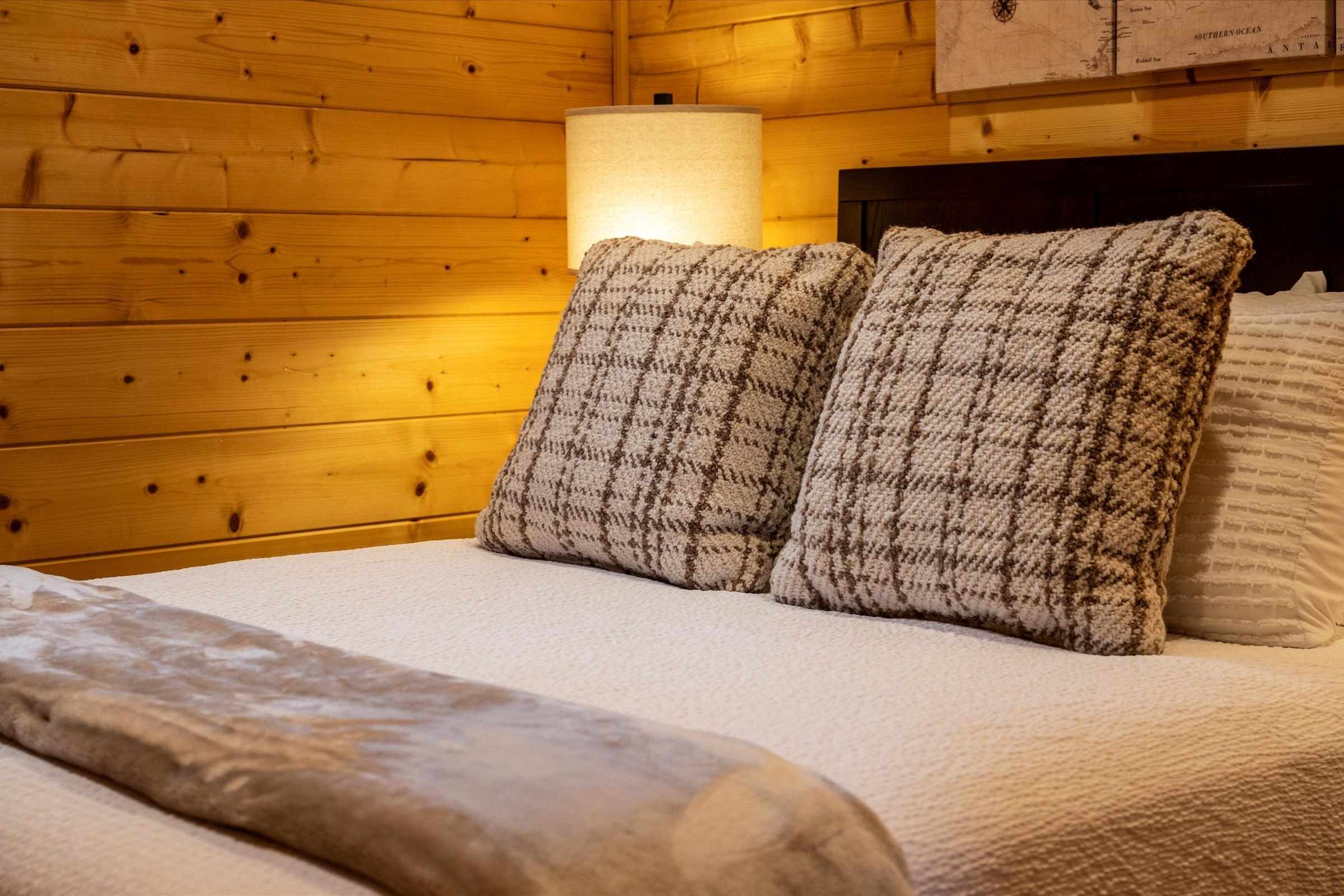 On the main level, you’ll find two queen bedrooms, each with a private SmartTV and luxury bedding, serviced by a full bathroom with a walk-in shower.