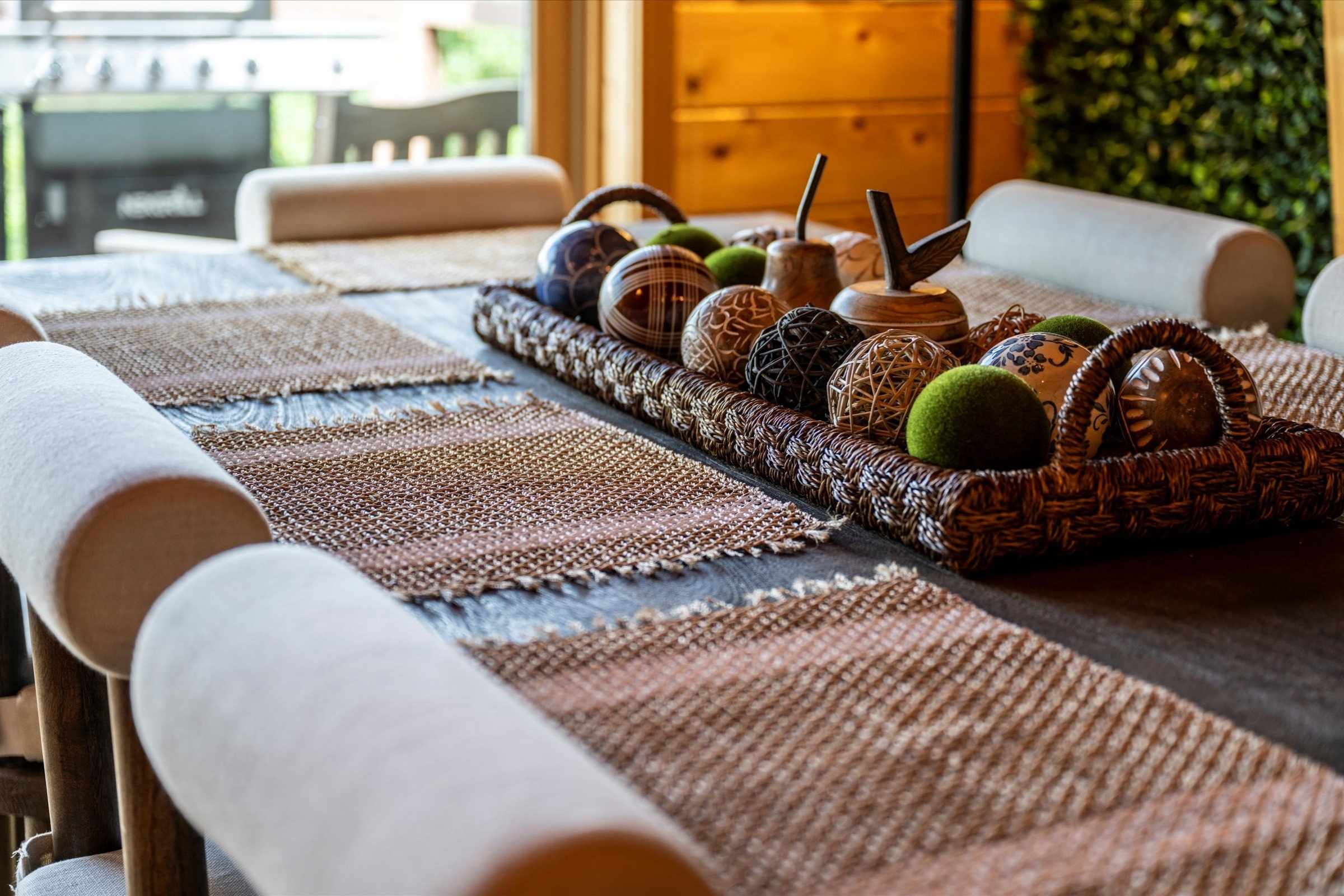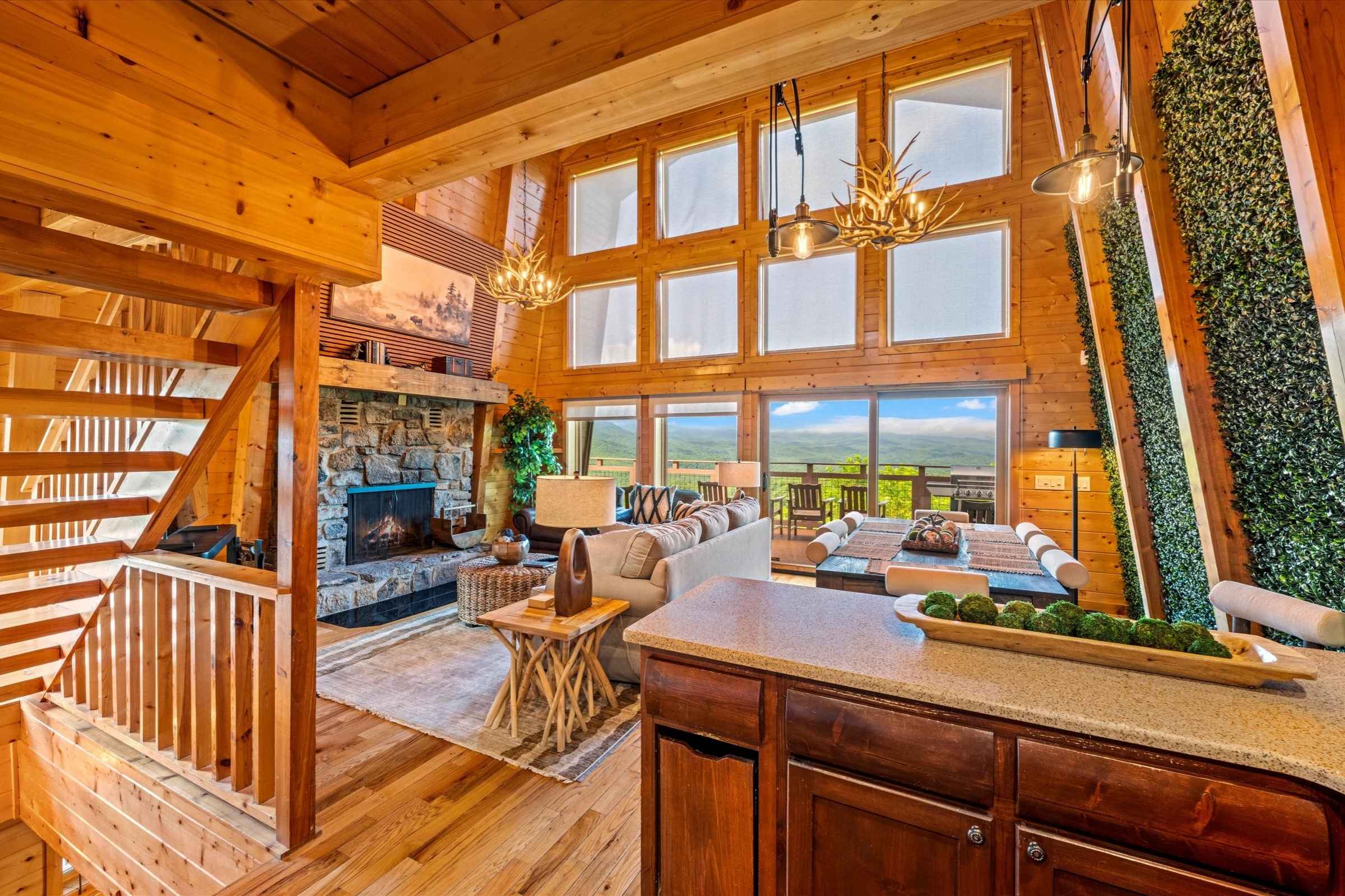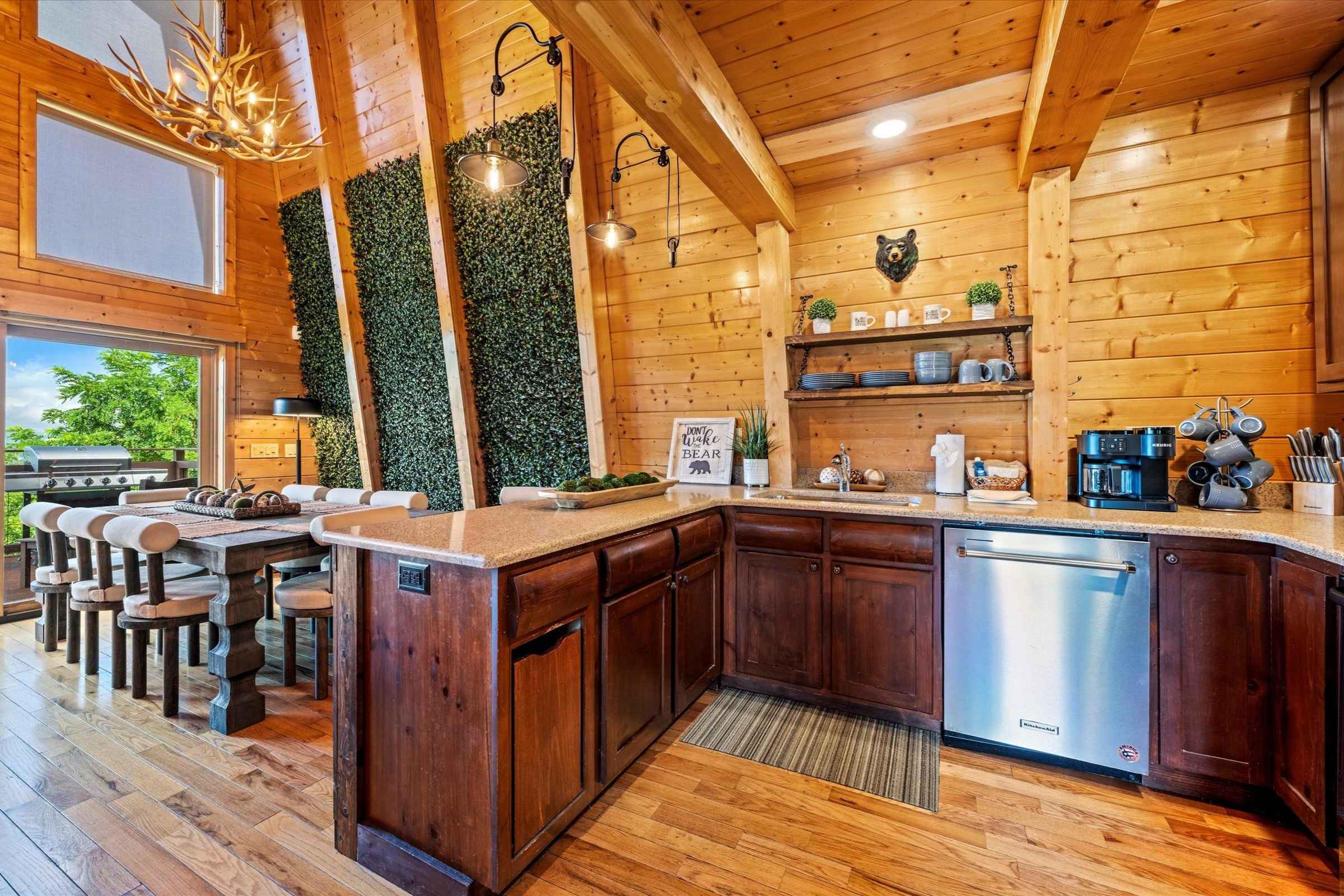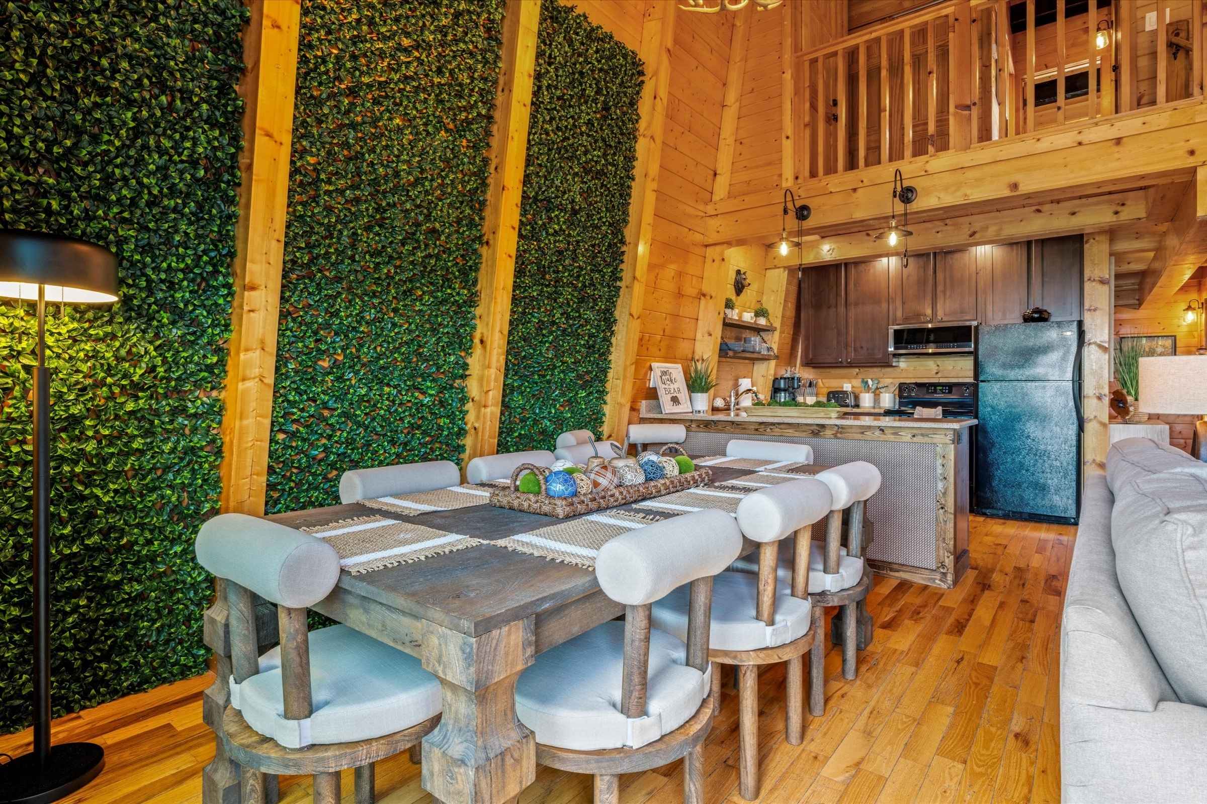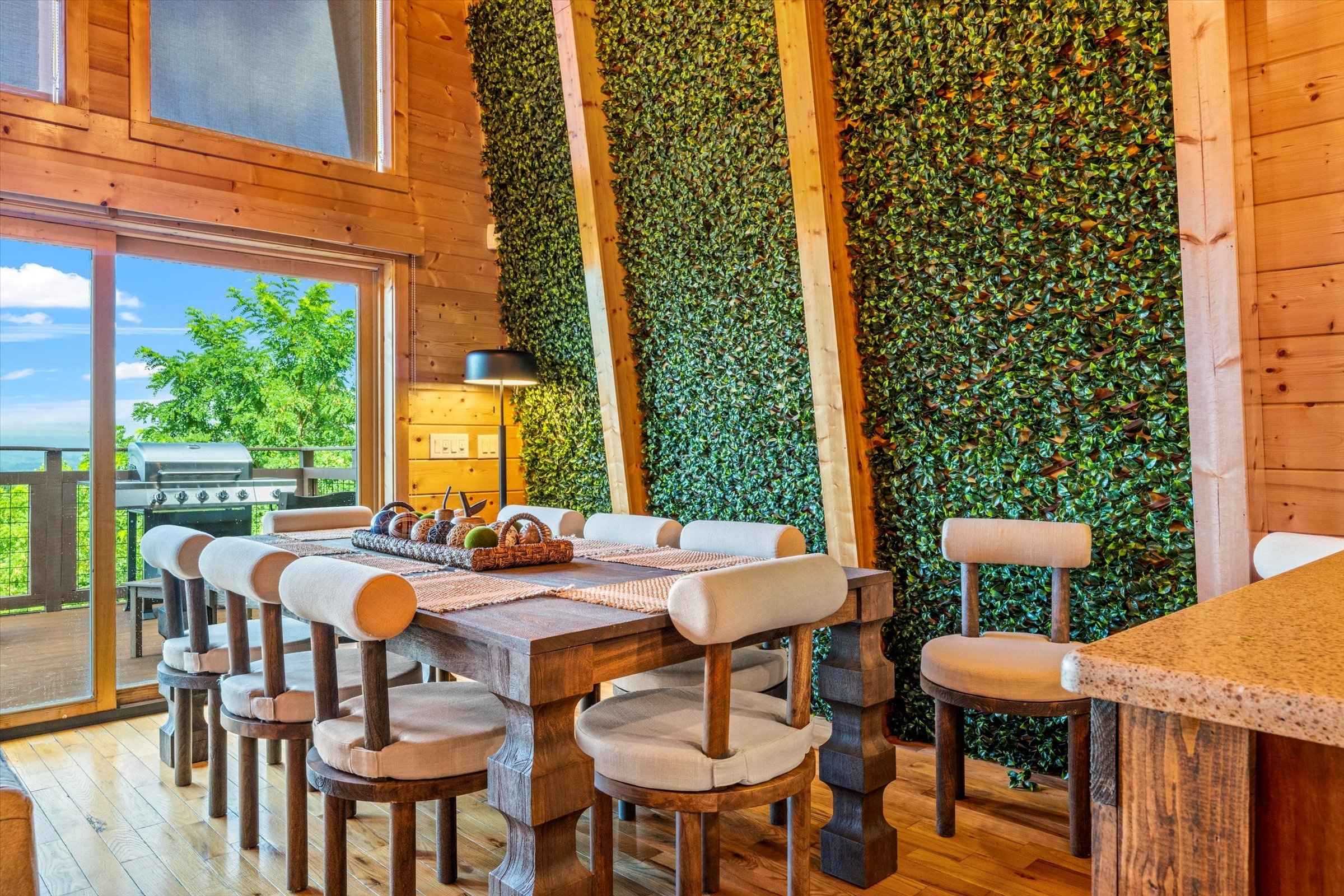 The fully equipped kitchen allows you to prepare delicious, home-cooked meals with ease. Enjoy the convenience of a Keurig carafe/single-cup combo, perfect for brewing a morning cup of coffee or a full pot for your group. A large dining table, seating up to eight guests, is beautifully accented by a wall of greenery and a bank of windows that frame sweeping mountain vistas. This is an ideal spot to share meals, host a board game night, or simply enjoy time together.