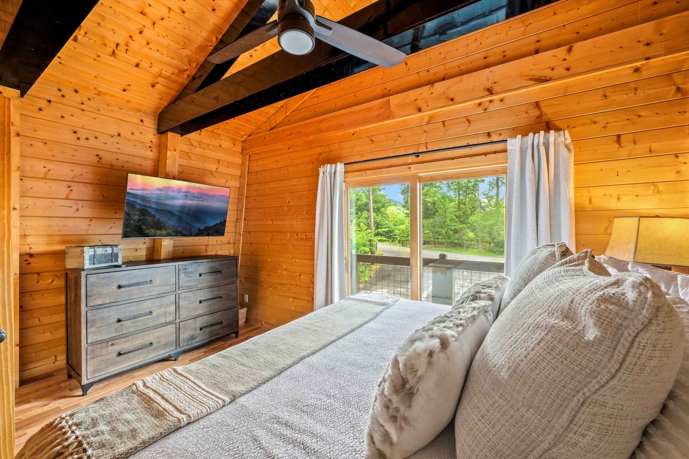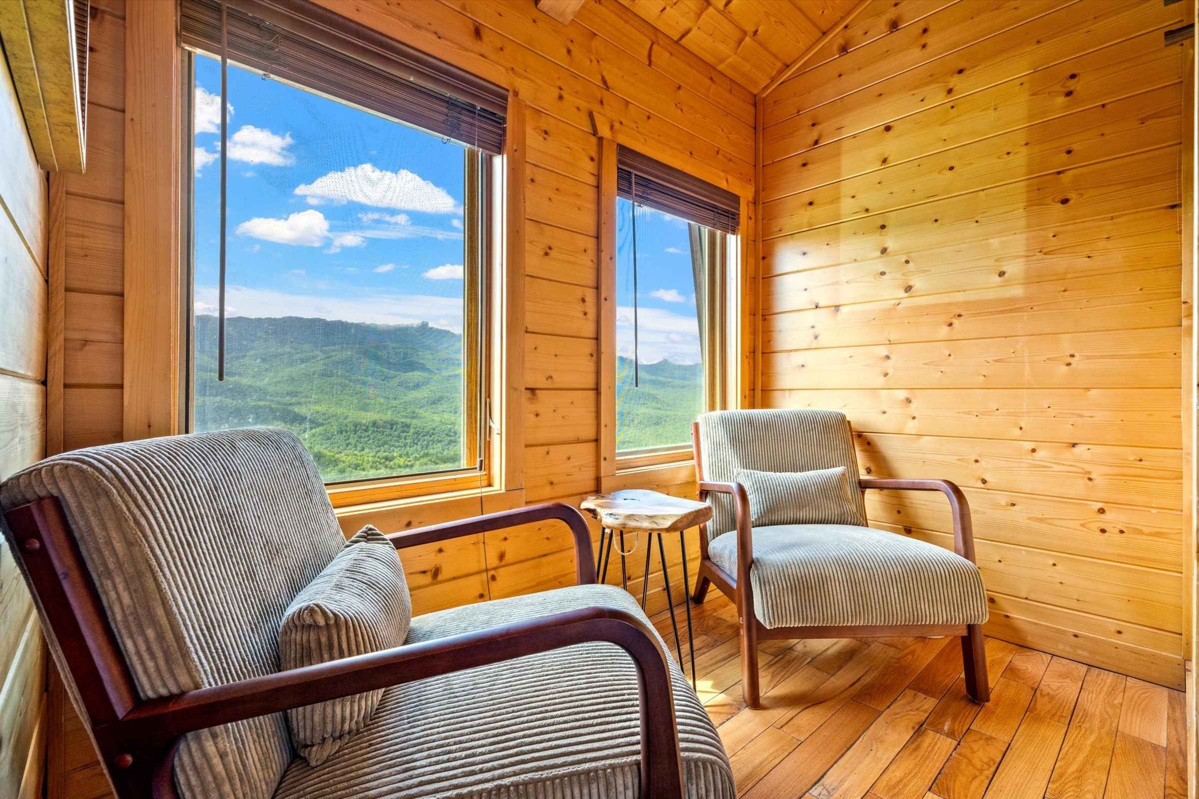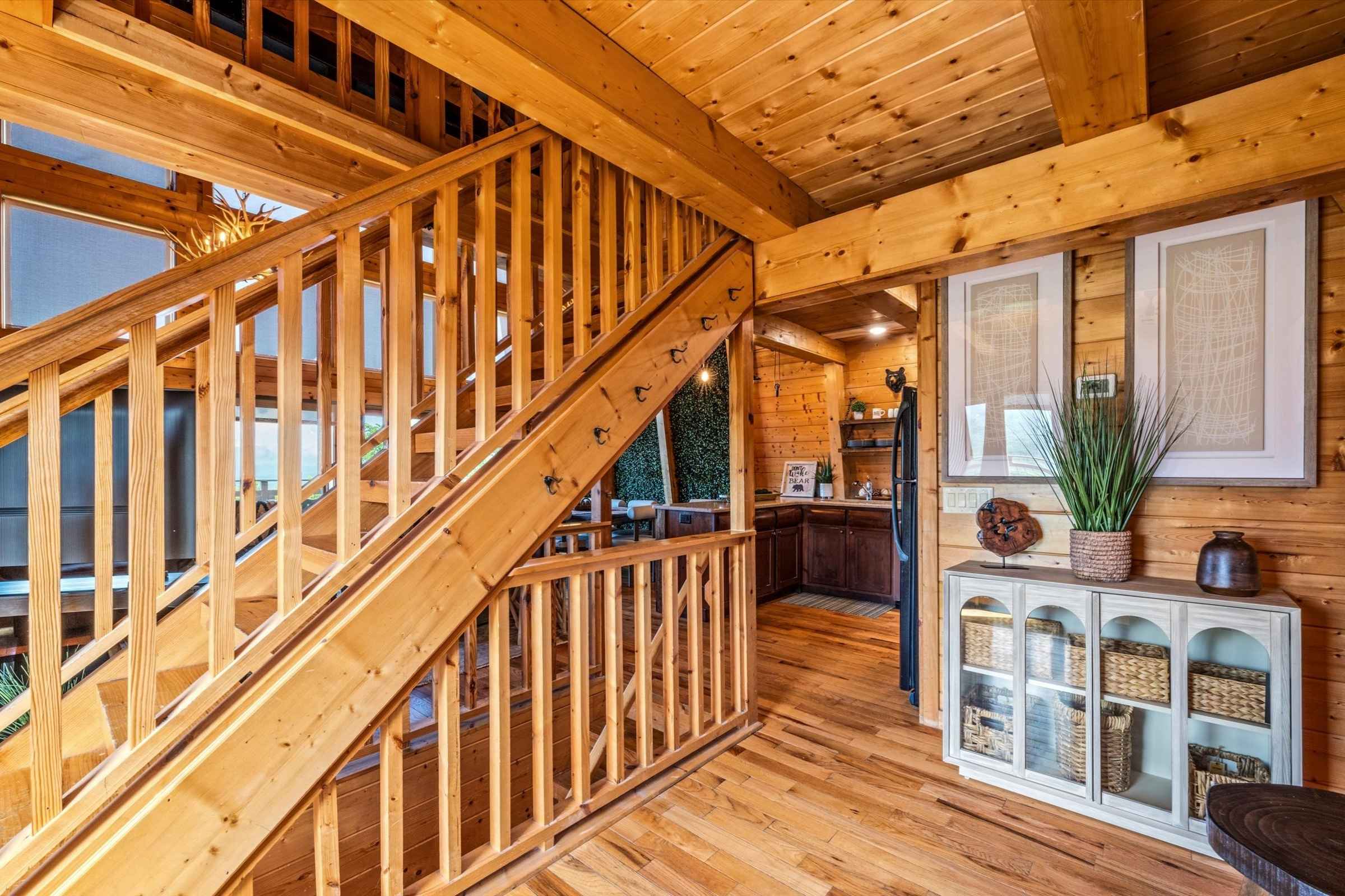 Upon arrival, guests are greeted by a spacious, flat parking area that makes unloading effortless. Step onto the expansive wrap-around porch and immediately soak in epic, panoramic Smoky Mountain views, visible from every level of this beautiful vacation rental cabin.