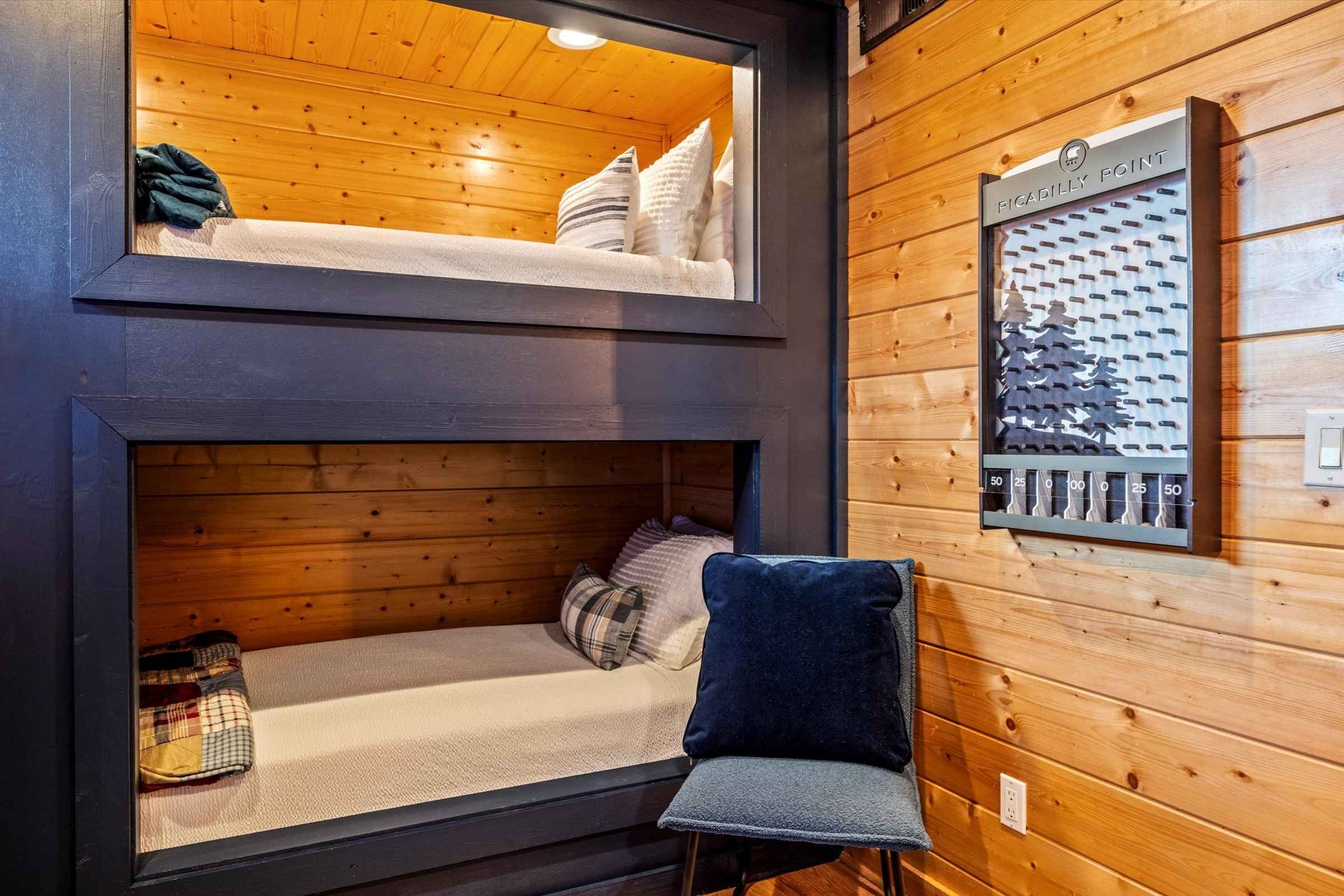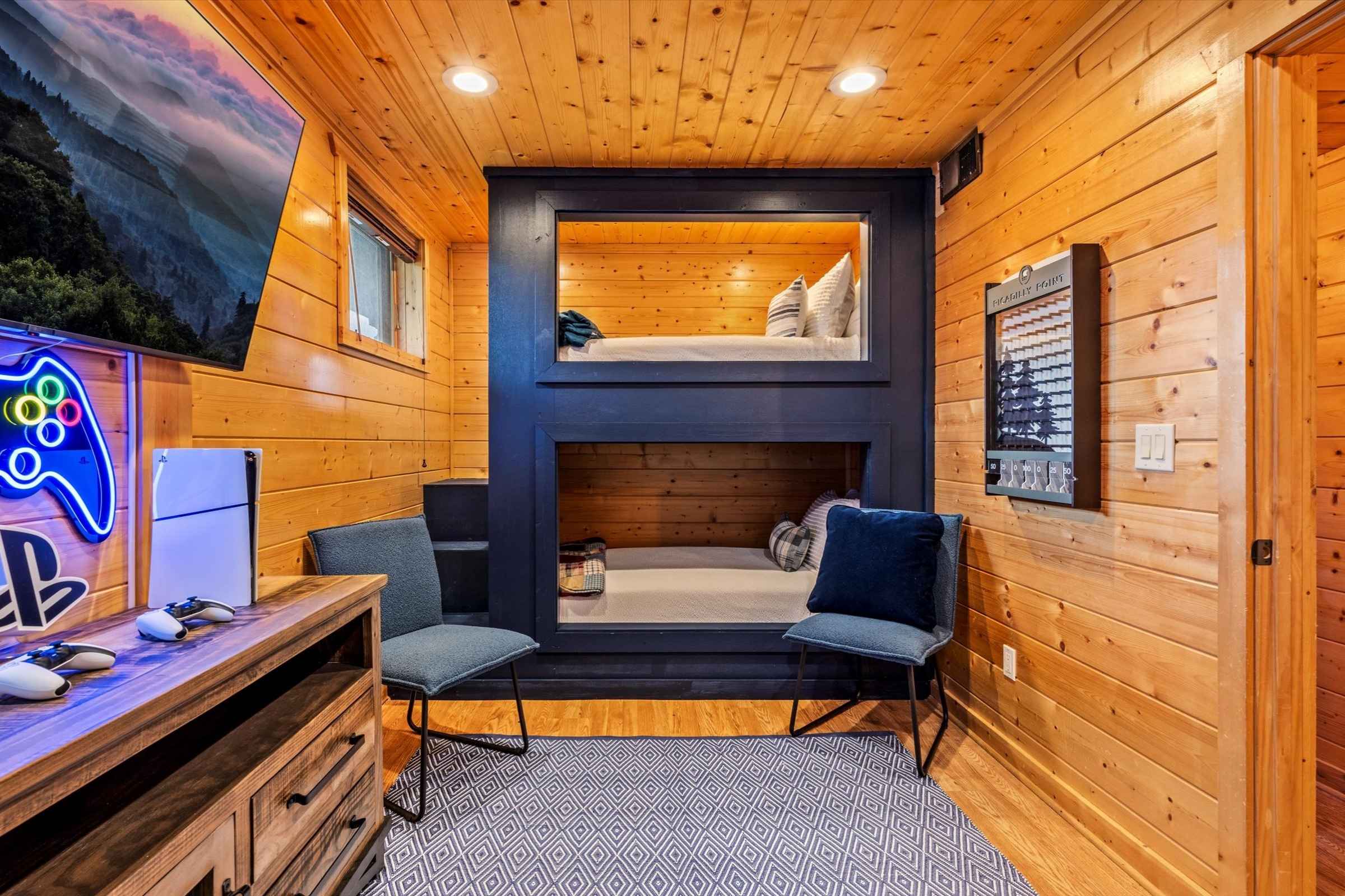 Down the hall, another full (double) bedroom with a private SmartTV offers additional privacy, while the custom bunk room is a dream come true for kids and kids at heart, featuring two twin-over-twin bunk beds, a large SmartTV, Playstation 5, and a custom Plinko board.