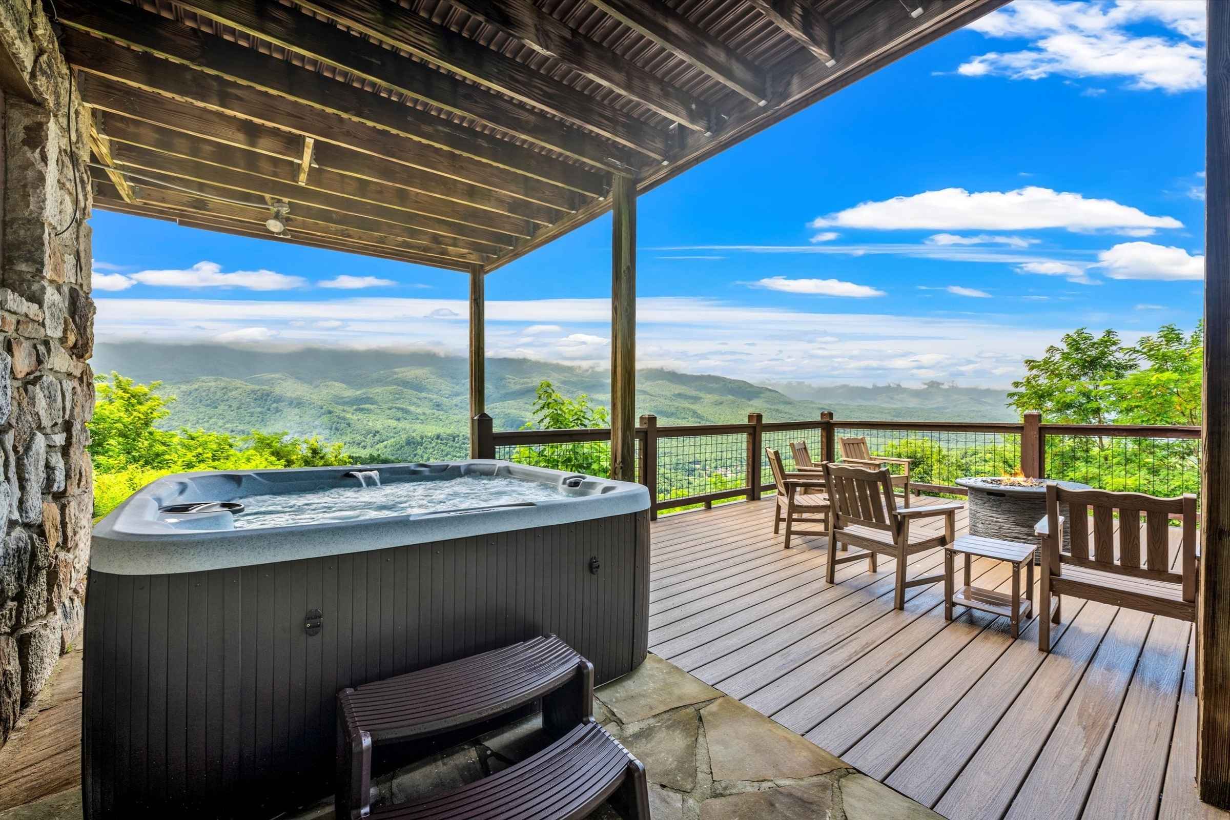 Step outside to find the newly constructed lower-level deck, where a brand-new, large covered hot tub awaits, along with abundant seating around a gas fire pit and a Ladder Ball game set up for outdoor enjoyment.