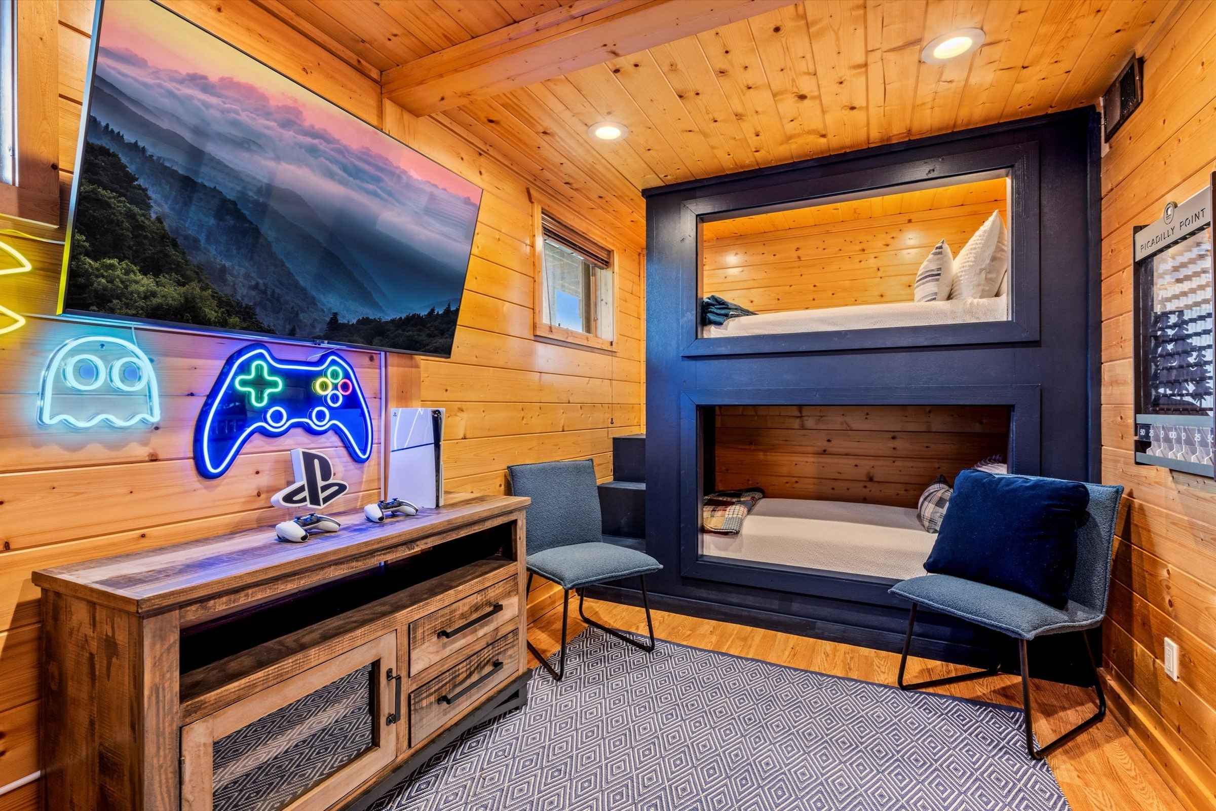 * Two kings, two queens, one full, and a bunk room that sleeps four with two twin-over-twin built in bunk beds, a SmartTV, and a Playstation 5