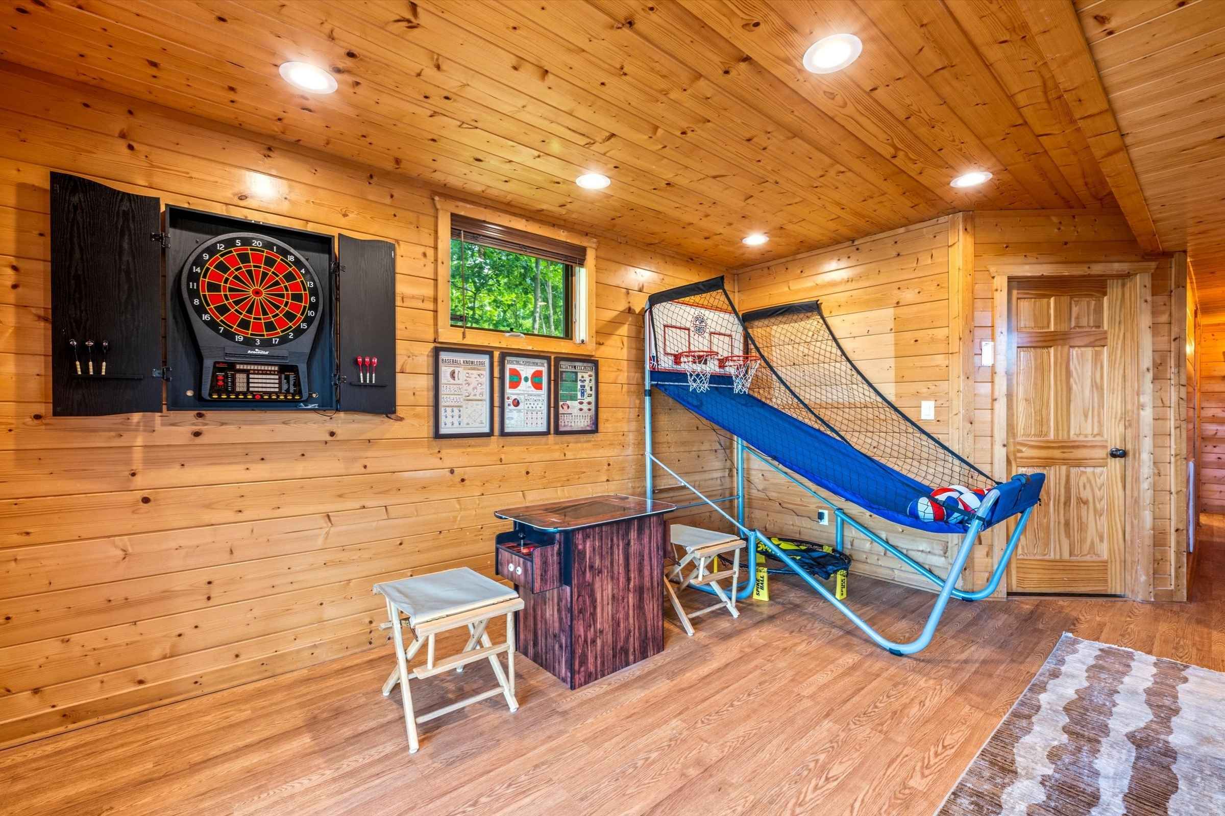 Head down to Picadilly Point’s lower level for a wide array of in-home entertainment. A second living area features a large stone fireplace, cozy seating, a SmartTV, a double-hoop indoor basketball game, an arcade table loaded with classic and new games, and a dartboard—ensuring fun for every age.