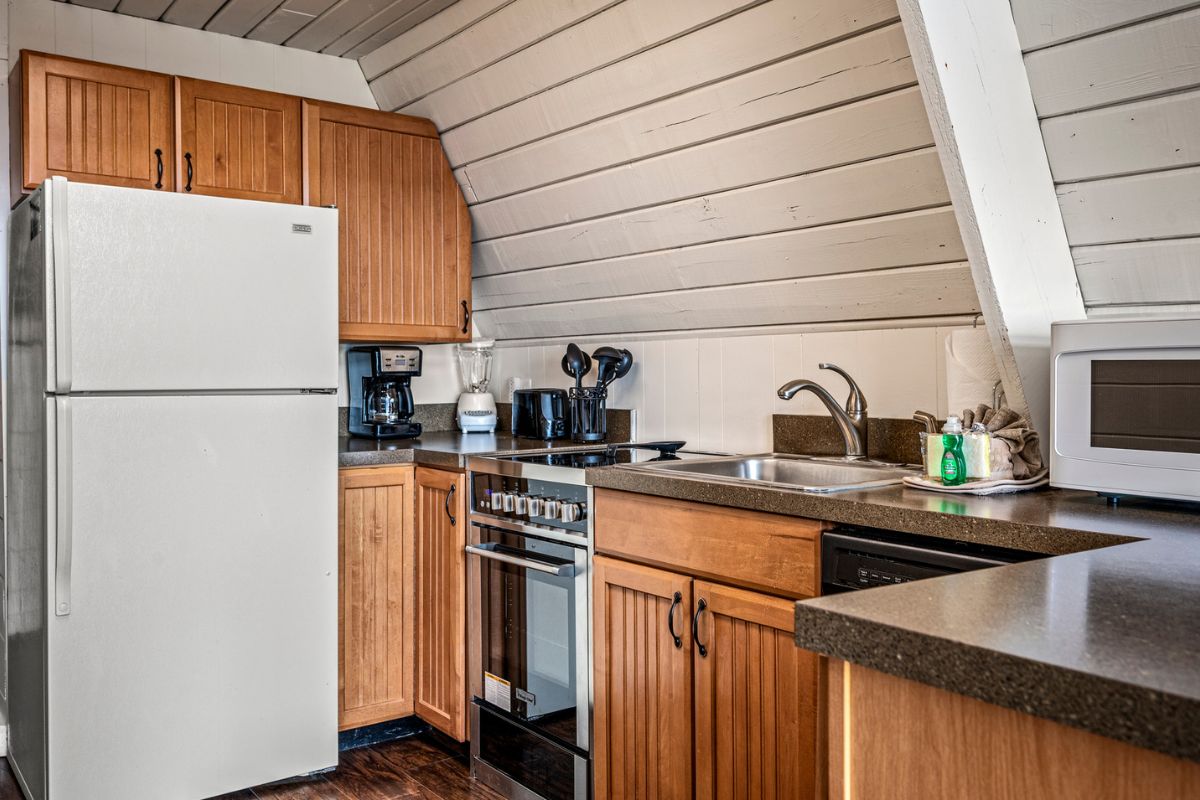 As you step inside, you'll be greeted by the warm and inviting open-concept chalet. The living, dining, and kitchen area boasts comfortable furnishings, a large flat screen TV, and a cozy wood-burning fireplace. Gather around the dining table, which offers seating for four, and feel free to unleash your culinary skills in the fully stocked kitchen (just remember to bring your groceries).