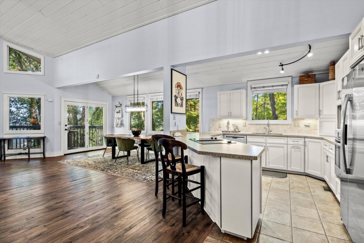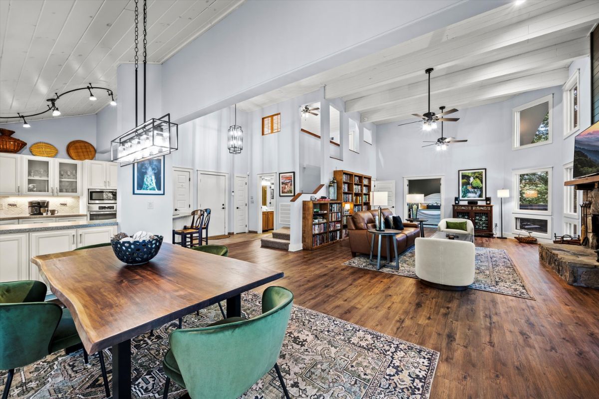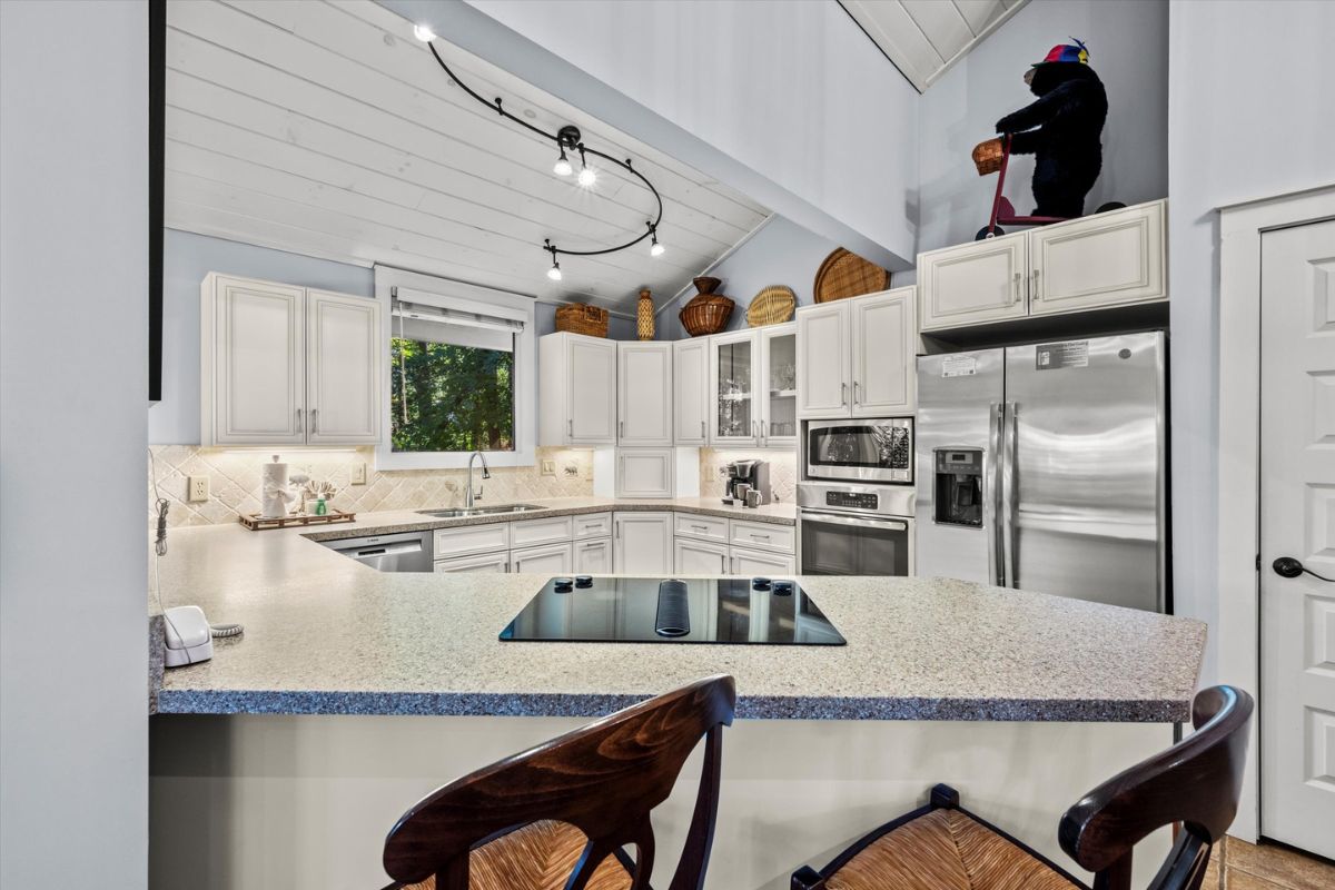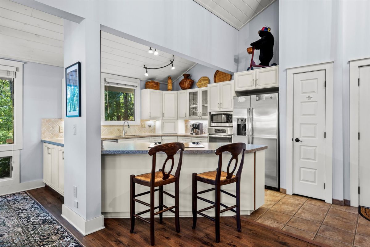 The open kitchen boasts modern amenities, including a Jenn-Aire range and a breakfast bar for casual dining and lively conversation. Fully equipped with everything you need, simply bring your groceries and let your inner chef shine. Gather around the dining table for shared meals and fun-filled game nights, with a great selection of board games ready for some friendly competition. The loft above the living room also offers an excellent place to relax and read your favorite novel.