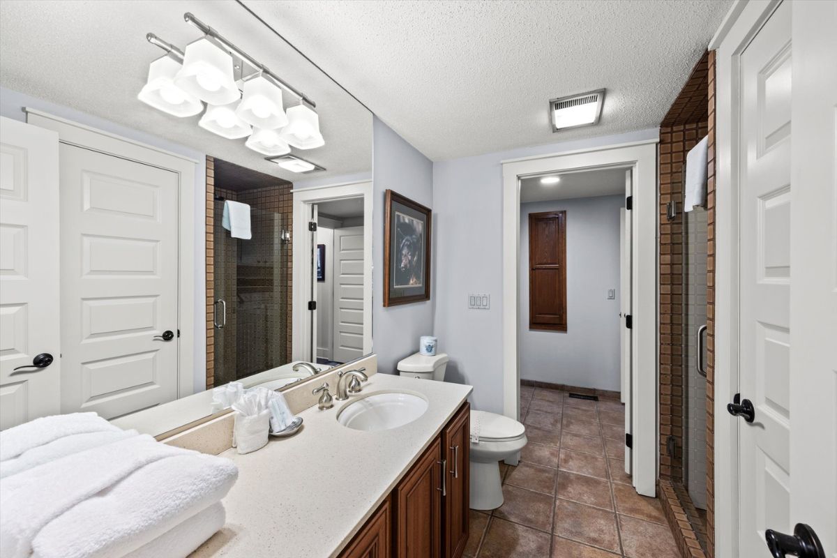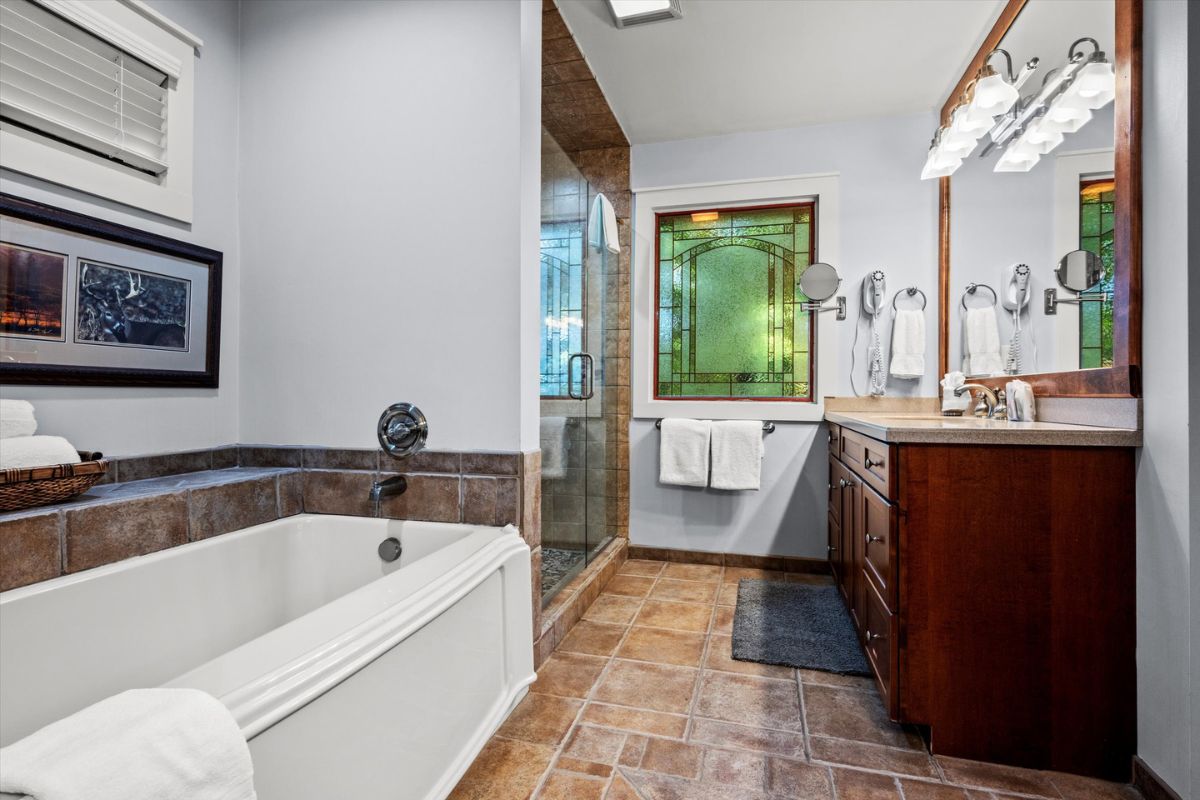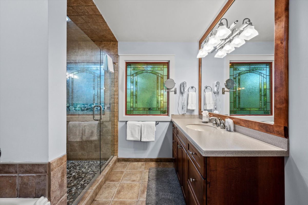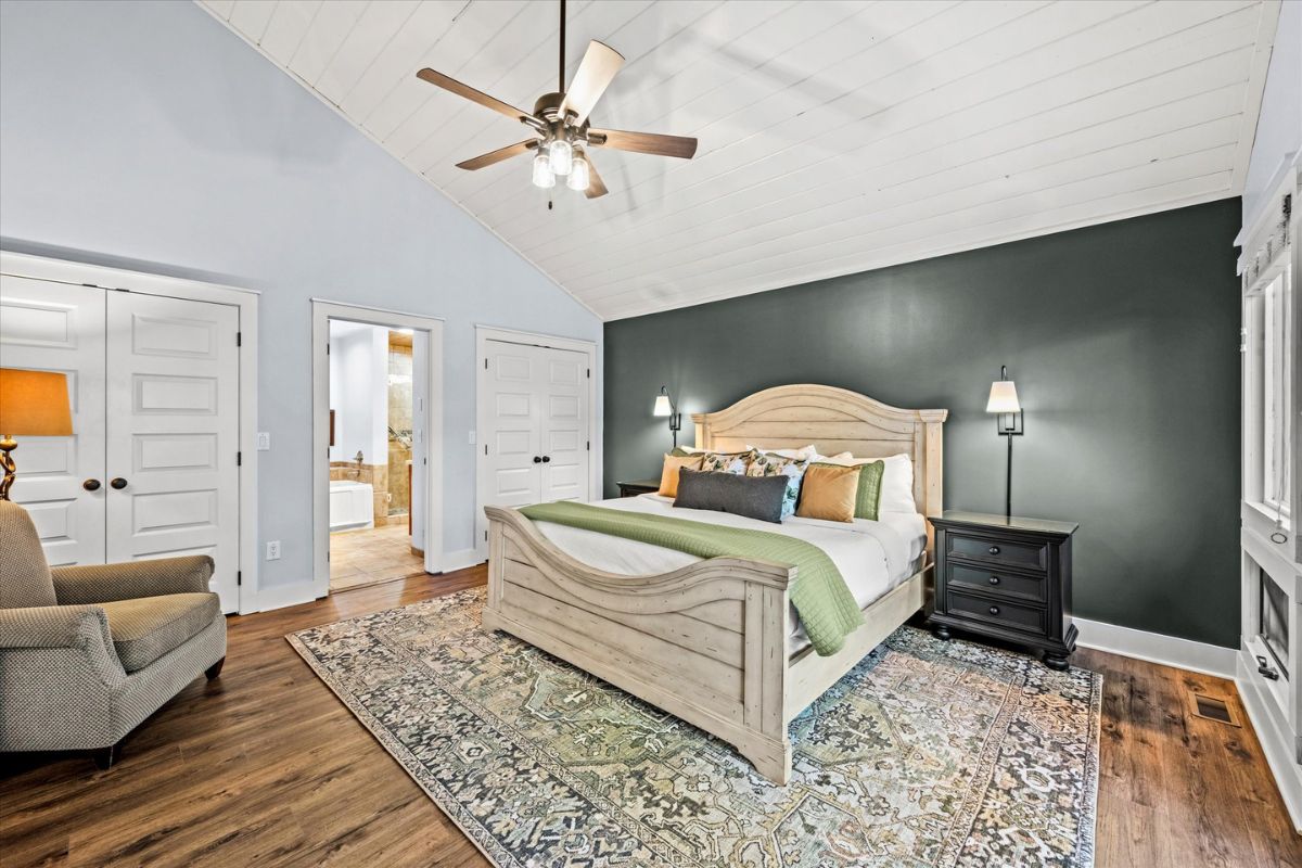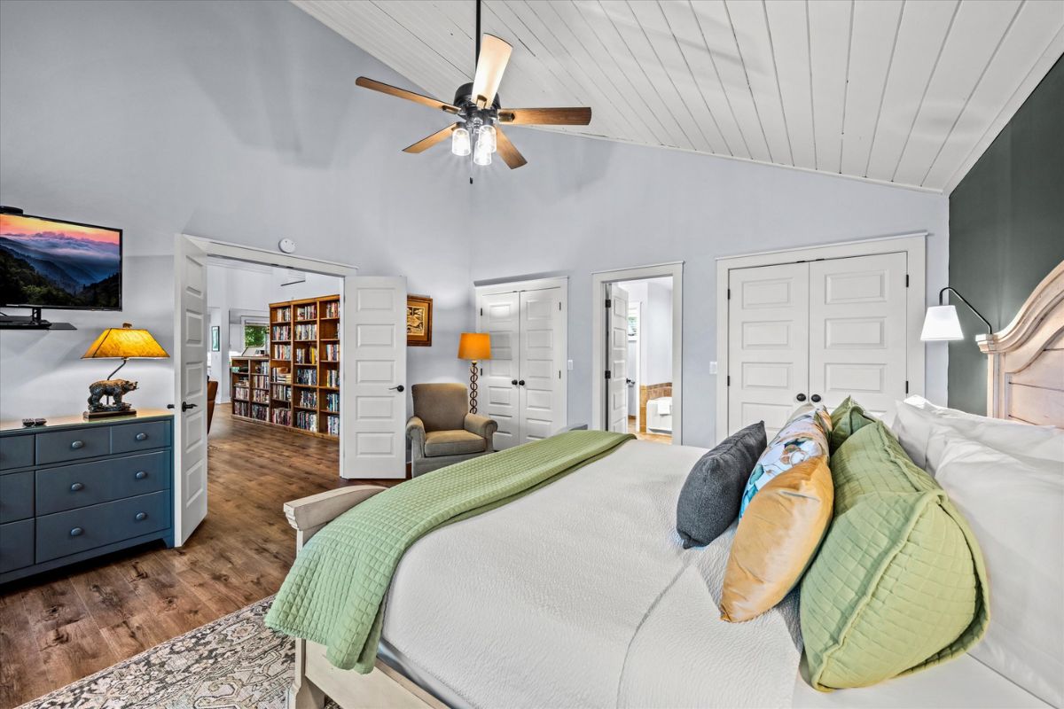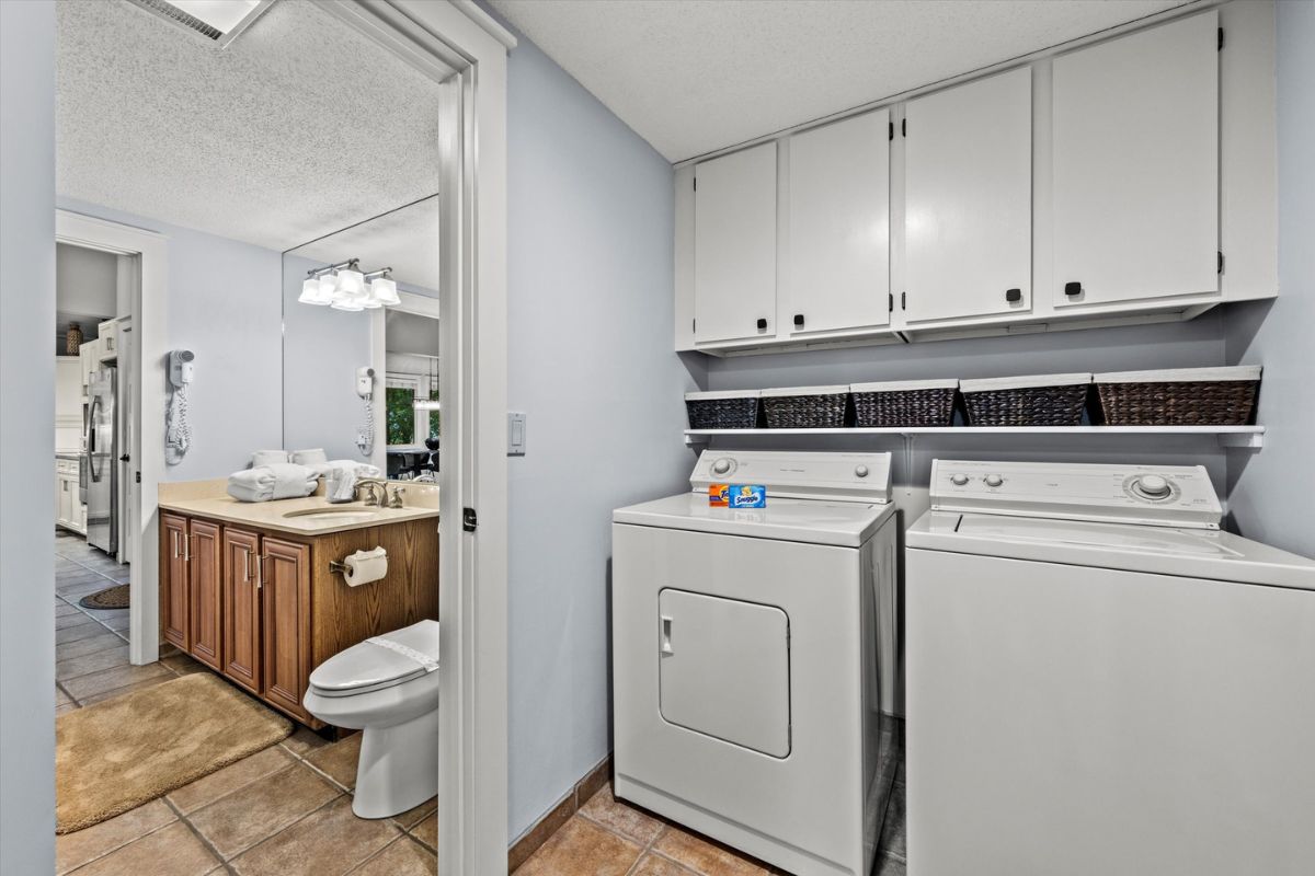 Retreat to the king bedroom suite, where relaxation awaits with a private television and a full bathroom featuring a soaker tub, separate shower, his-and-hers vanities, and a separate water closet. Stay connected with WIFI access, and keep your wardrobe fresh with the convenience of a washing machine and dryer.