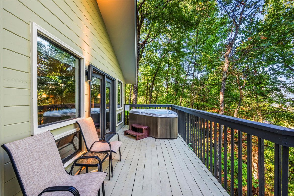 Outside, the deck beckons with a soothing hot tub and picturesque views of downtown Gatlinburg and Mt. LeConte in the distance. Dine al fresco at the pub table set and immerse yourself in the beauty of the Smokies.