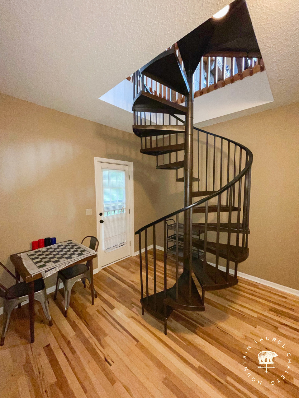 We LOVE Girls Getaways! Serenity Lodge is a great place to hang out with friends. We are glad you enjoyed the chalet and we do advertise the spiral staircase on our website (and the set of stairs from the top deck to the lower deck). It is a fun surprise to see the bears and there are plenty to see on Ski Mountain. It is very important that you roll up your car windows and lock the doors. Having one in your car is not a fun surprise! We hope to see you in the mountains again soon.Mountain Laurel Chalets staff