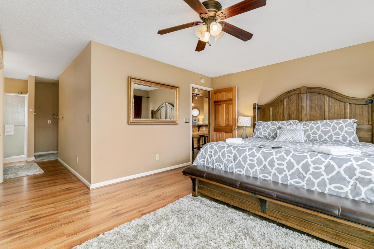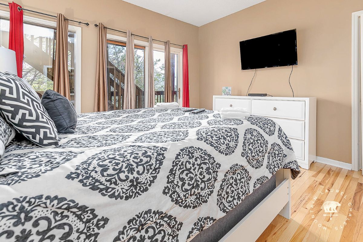 Retreat to the king bedroom suite on the main floor, featuring a private bathroom with a separate shower and bathtub for ultimate relaxation. Outside, the expansive deck invites you to soak up the mountain views from the oversized hot tub, accommodating up to six adults – the perfect way to unwind after a day of hiking in the national park.