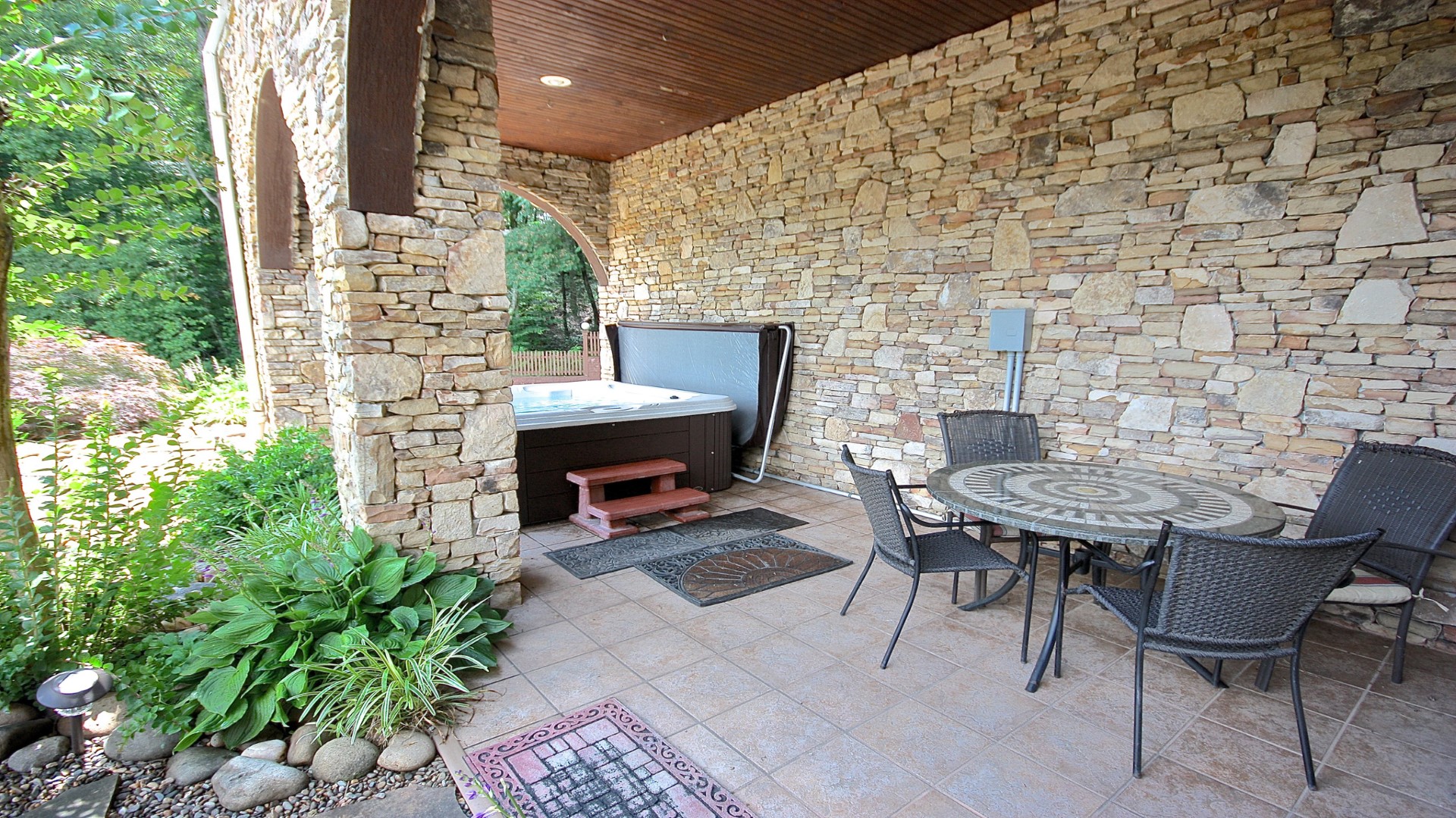 * Multiple decks and patios with seating and a hot tub