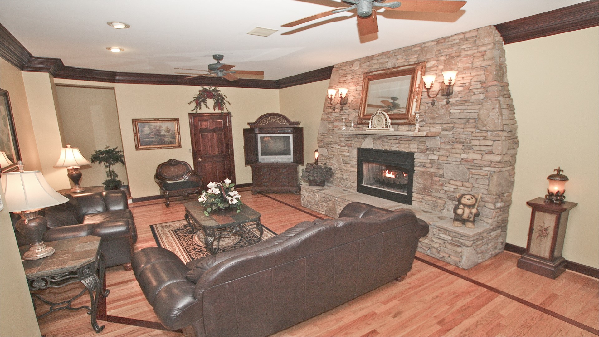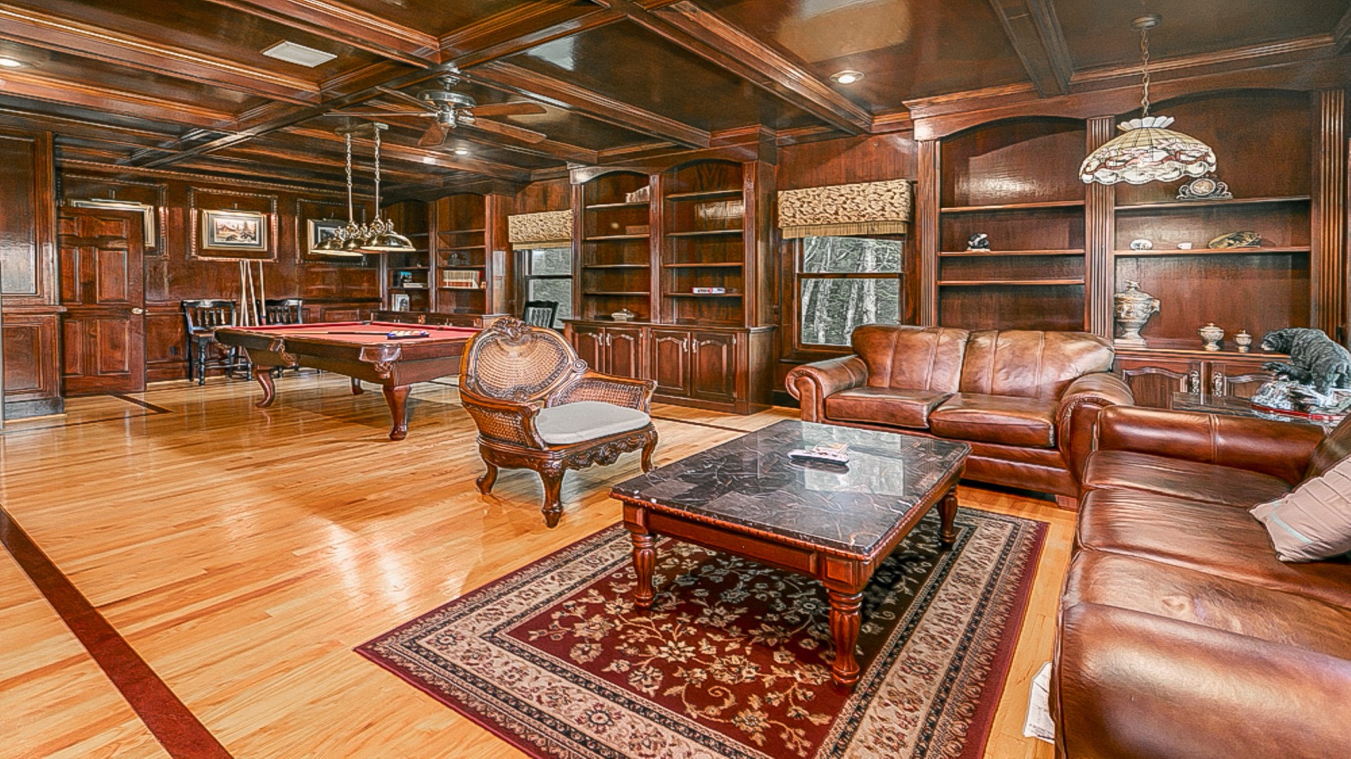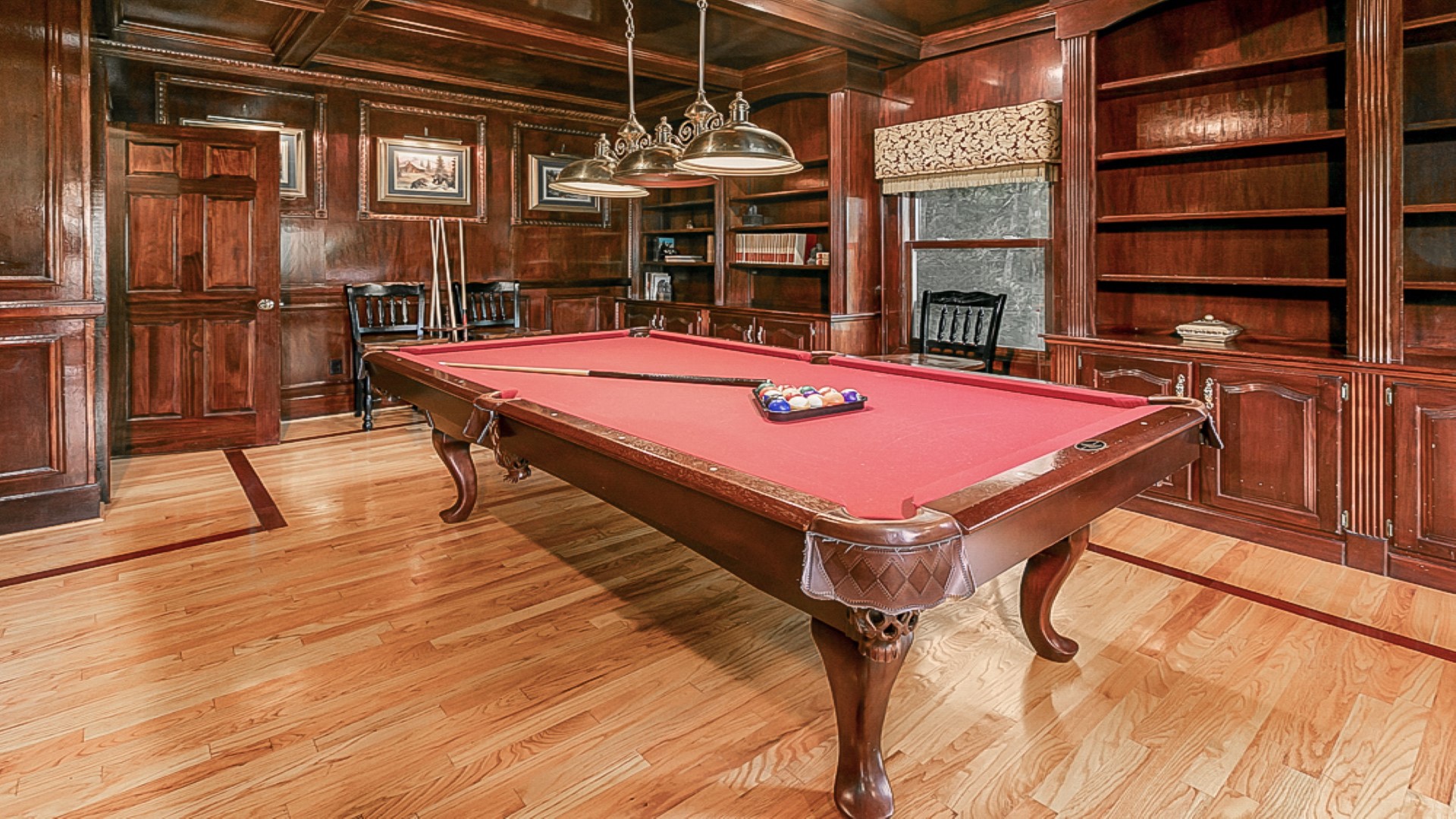 Make your way up to the home’s main level and discover a formal living room that exudes elegance and charm, complete with a gas fireplace and a TV with satellite channels. A billiard's room with a pool table and its own gas fireplace and large-screen TV will have you feeling like you've stepped into your own personal paradise.