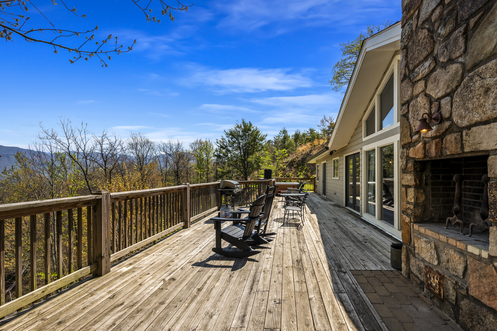 The expansive deck beckons you to bask in the endless views, complete with an outdoor fireplace and a bubbling hot tub for ultimate relaxation.
