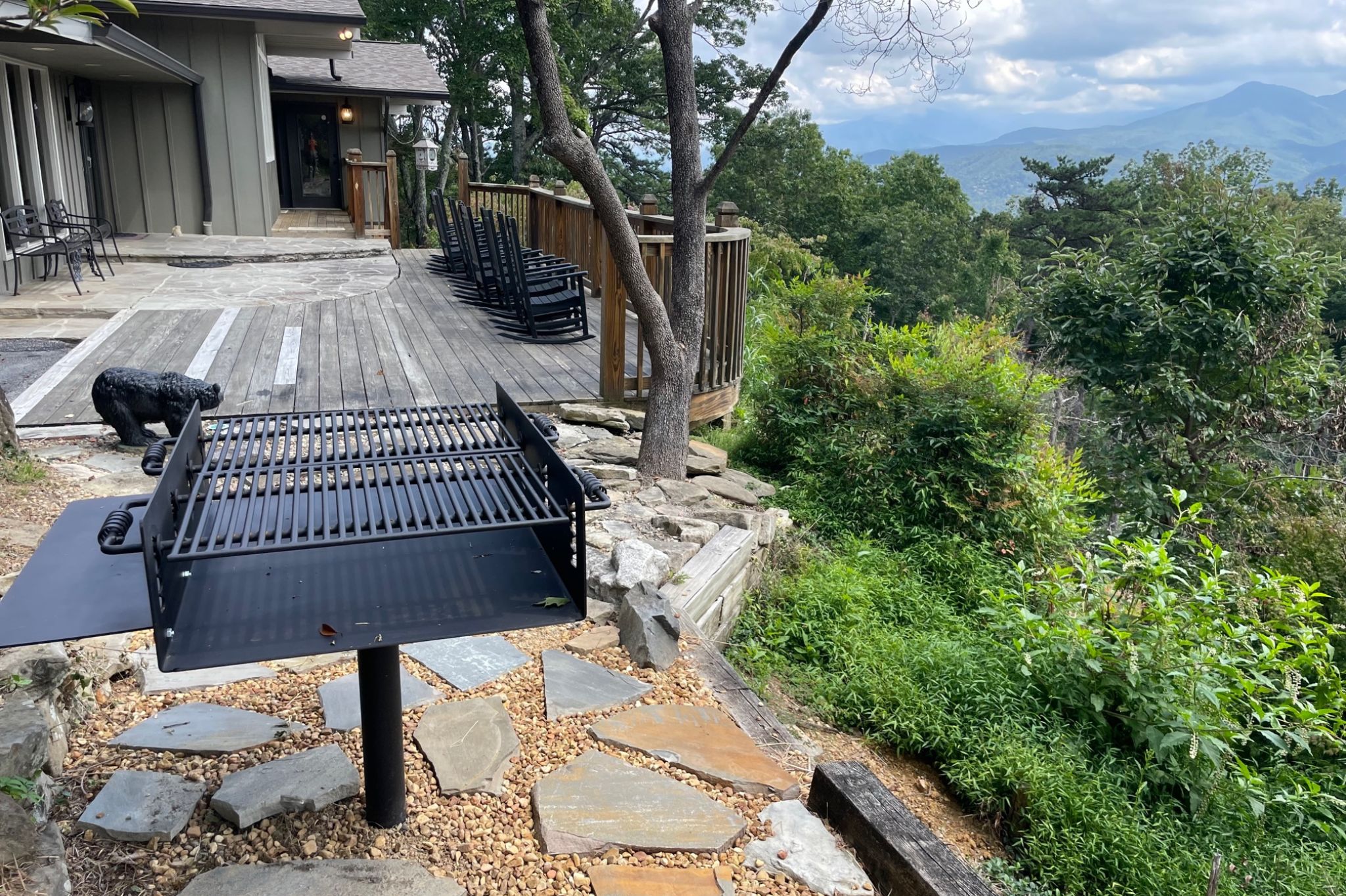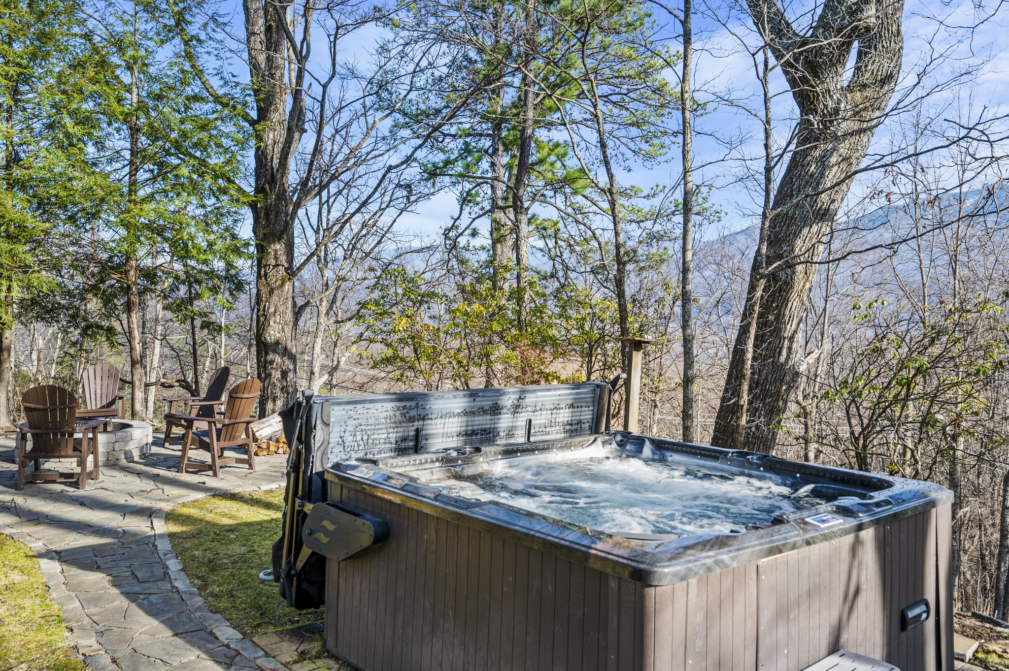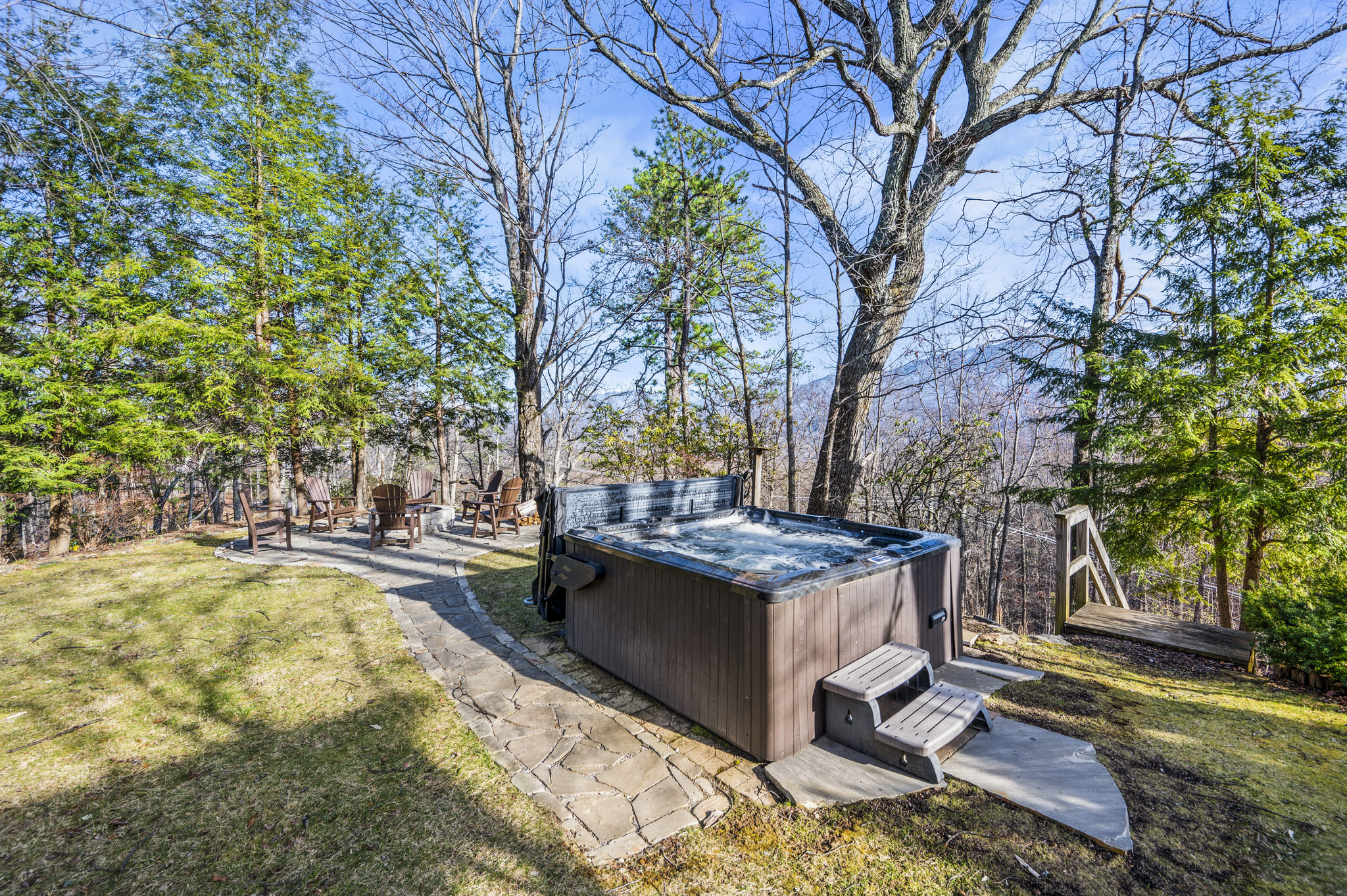 As you step into the sizable side yard, guests will be delighted to find a large flagstone fire pit and an oversized hot tub. A new oversized charcoal grill offers a fun opportunity to prepare dinner in the beauty of the Smokies.