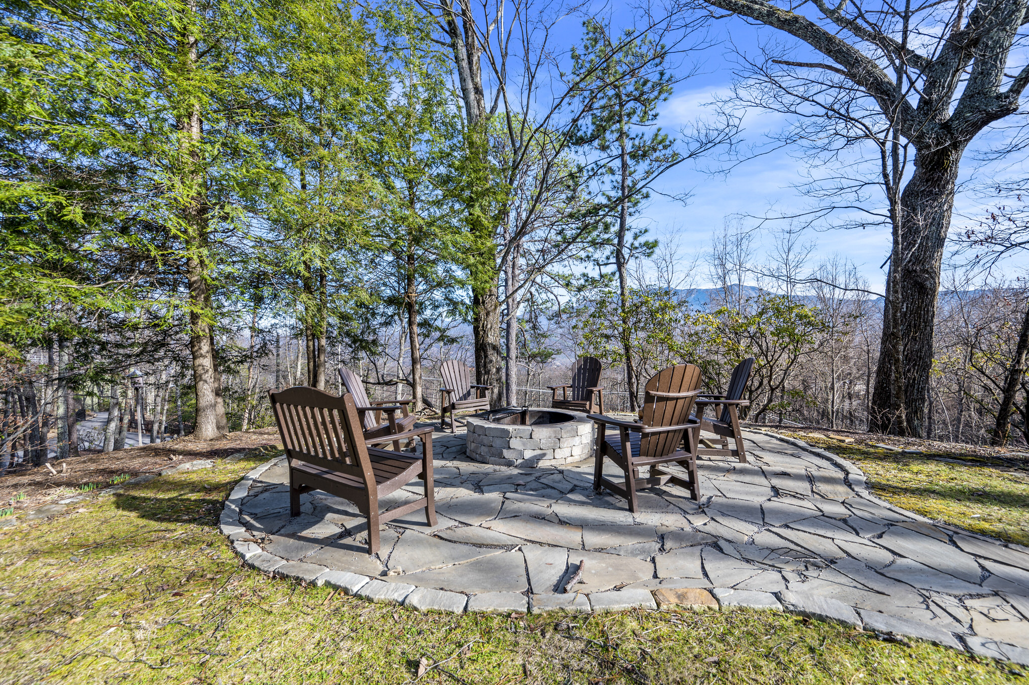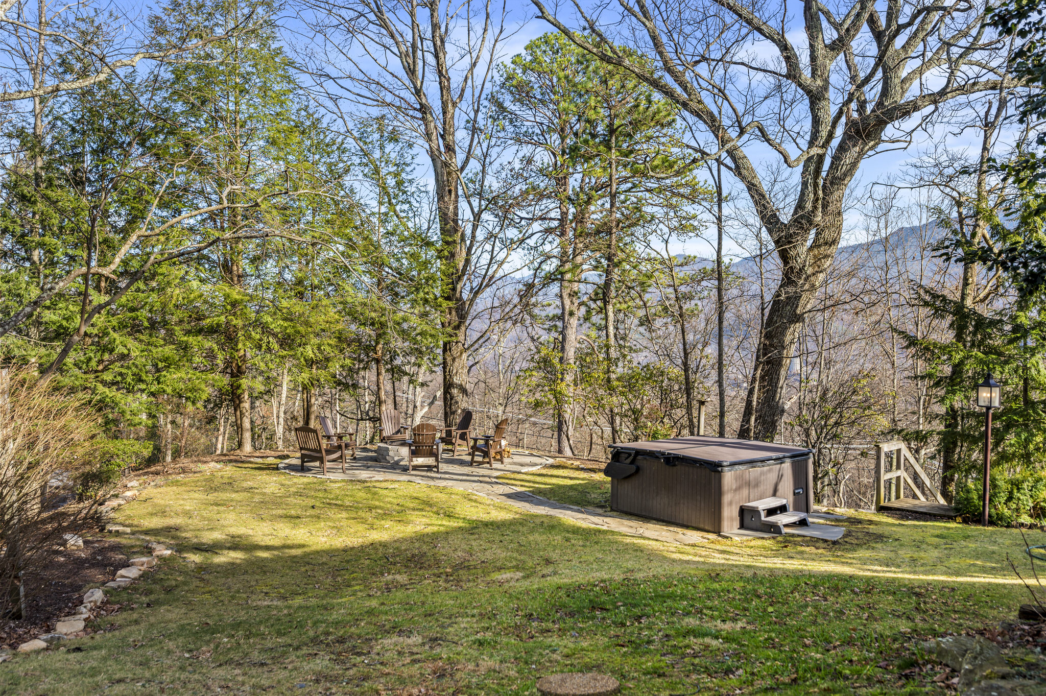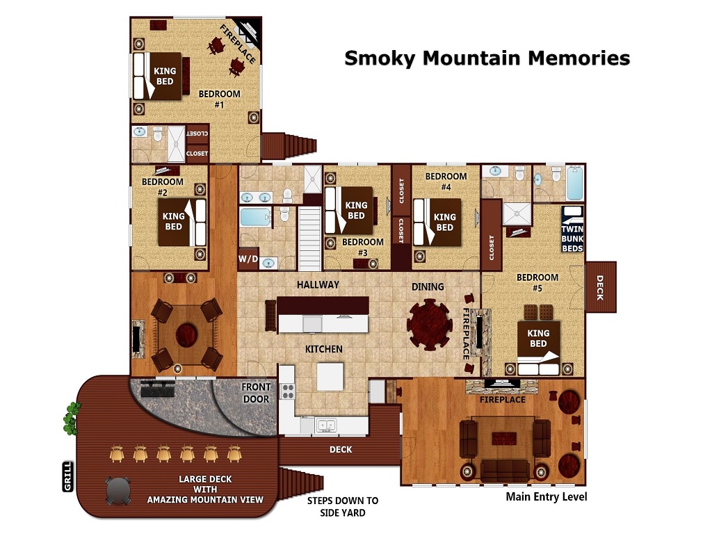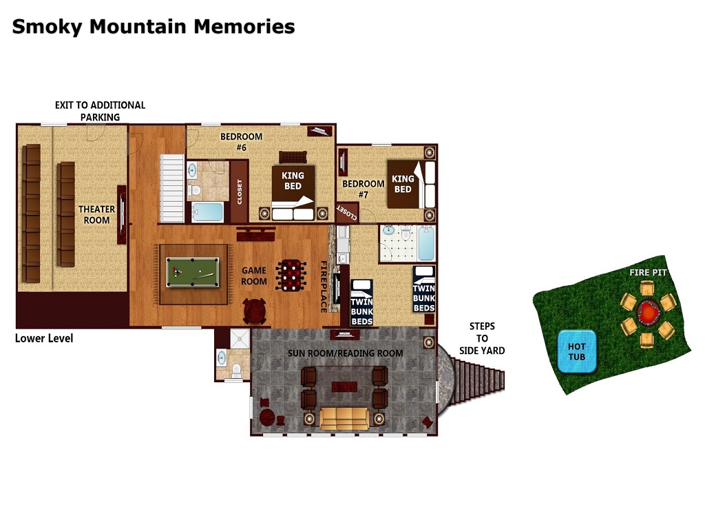 As you step into the sizable side yard, guests will be delighted to find a large flagstone fire pit and an oversized hot tub. A new oversized charcoal grill offers a fun opportunity to prepare dinner in the beauty of the Smokies.