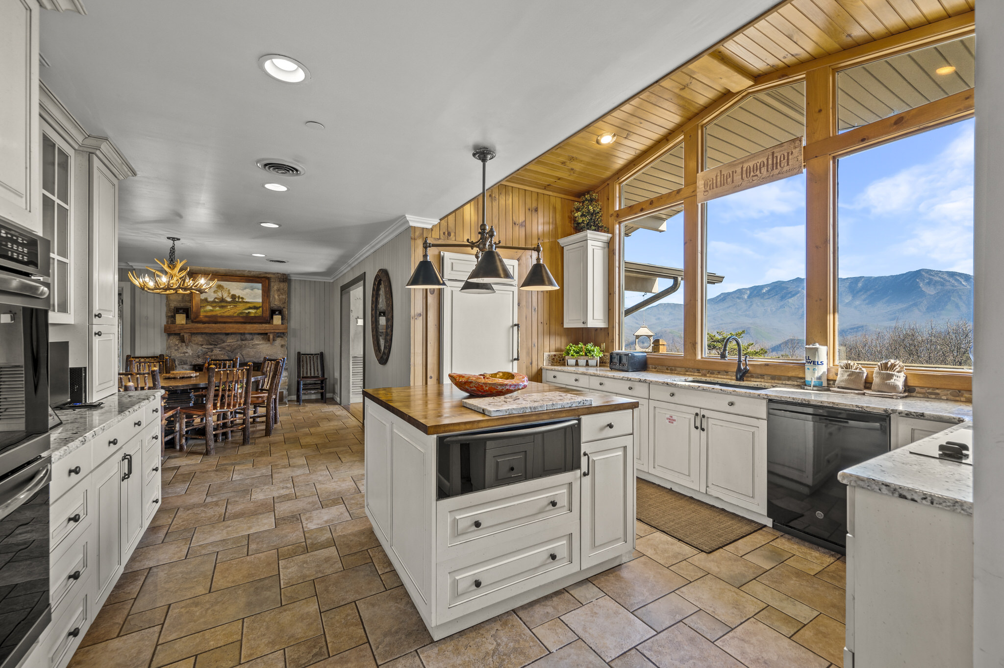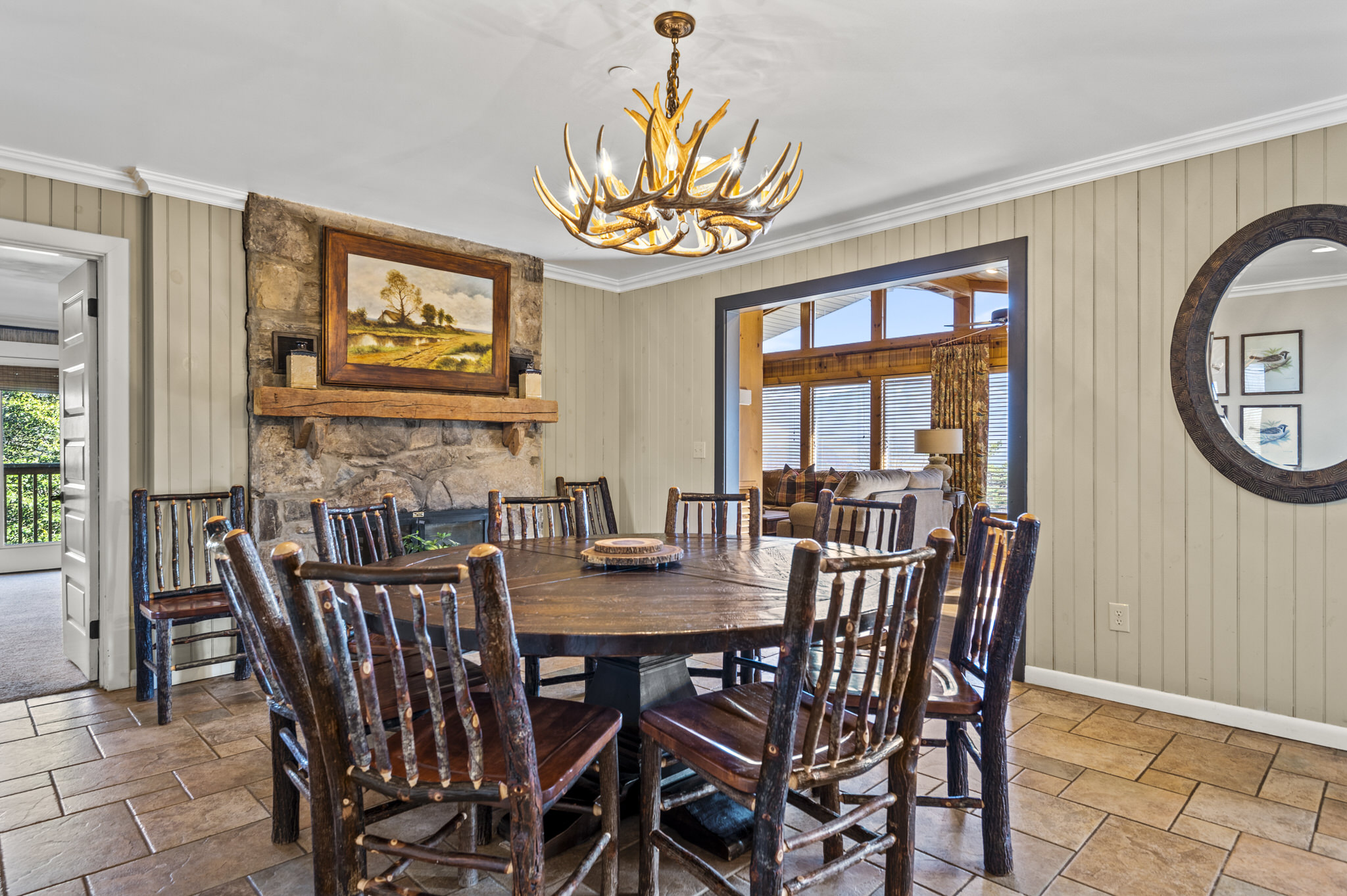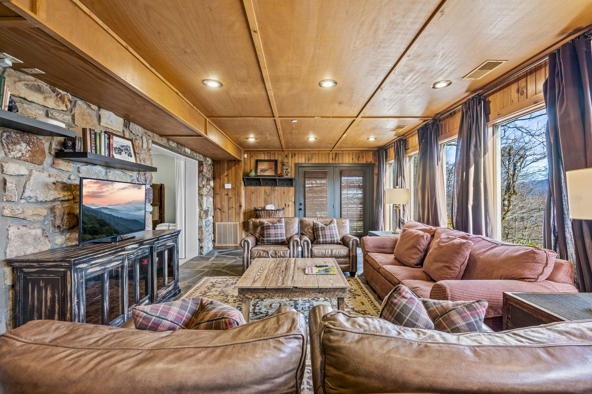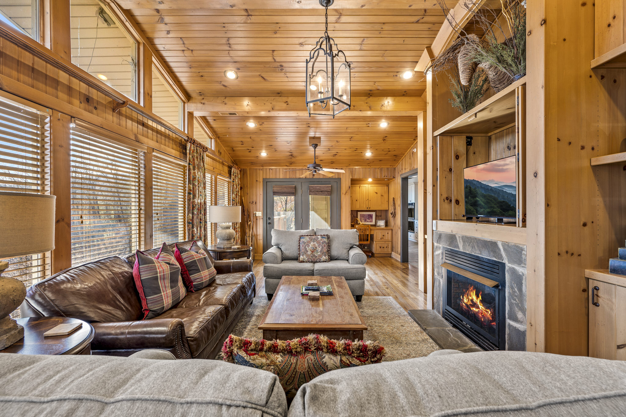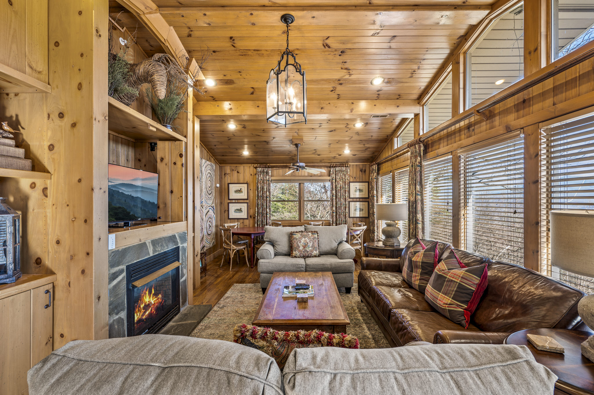Upon entering the property’s main level, guests will immediately feel a warm sense of welcome. To the left, a spacious sitting area sets a peaceful mood, offering a direct view of Mt. LeConte beyond the windows. A large fully-stocked kitchen is situated to the right, and it has everything you need to prepare large meals in the comfort of your home away from home (just bring groceries). The kitchen’s sub-zero refrigerator, double ovens, and a warming drawer make cooking a breeze. Beyond the kitchen, a dining area boasts an oversized table with plenty of seating, perfect for shared meals and game play. A few more steps take you into the cozy sunroom, which features a wall of windows that frame the beauty of the mountains. A gas fireplace adds to the ambience of the space.