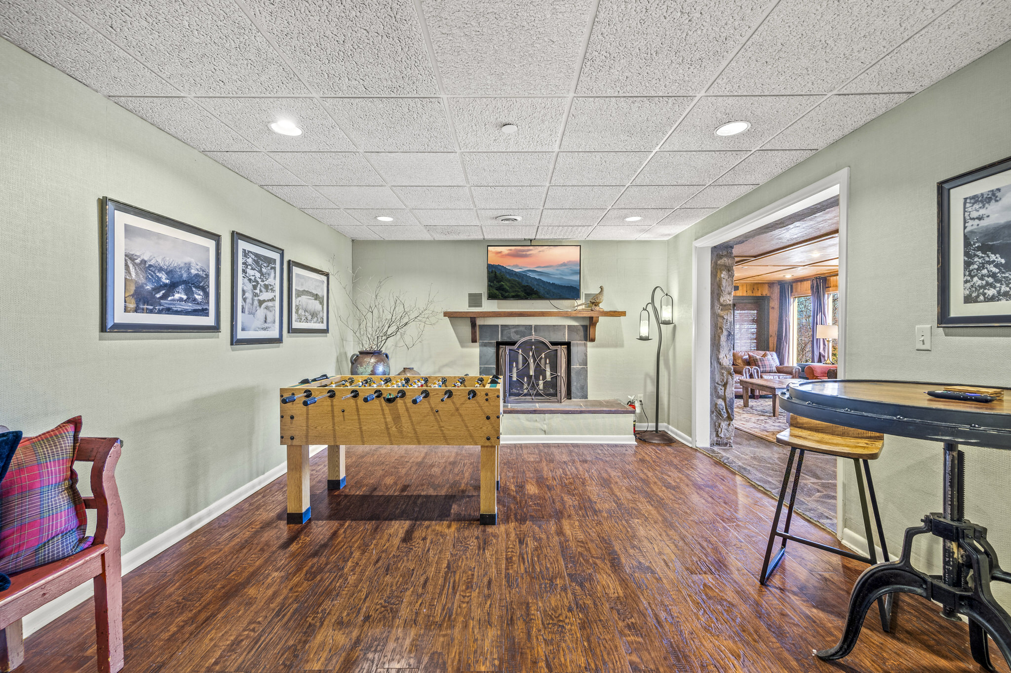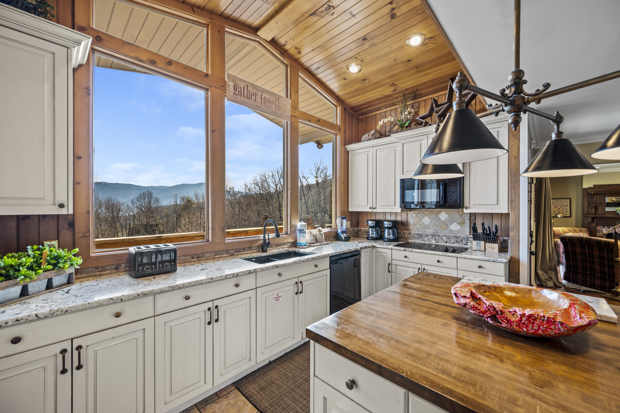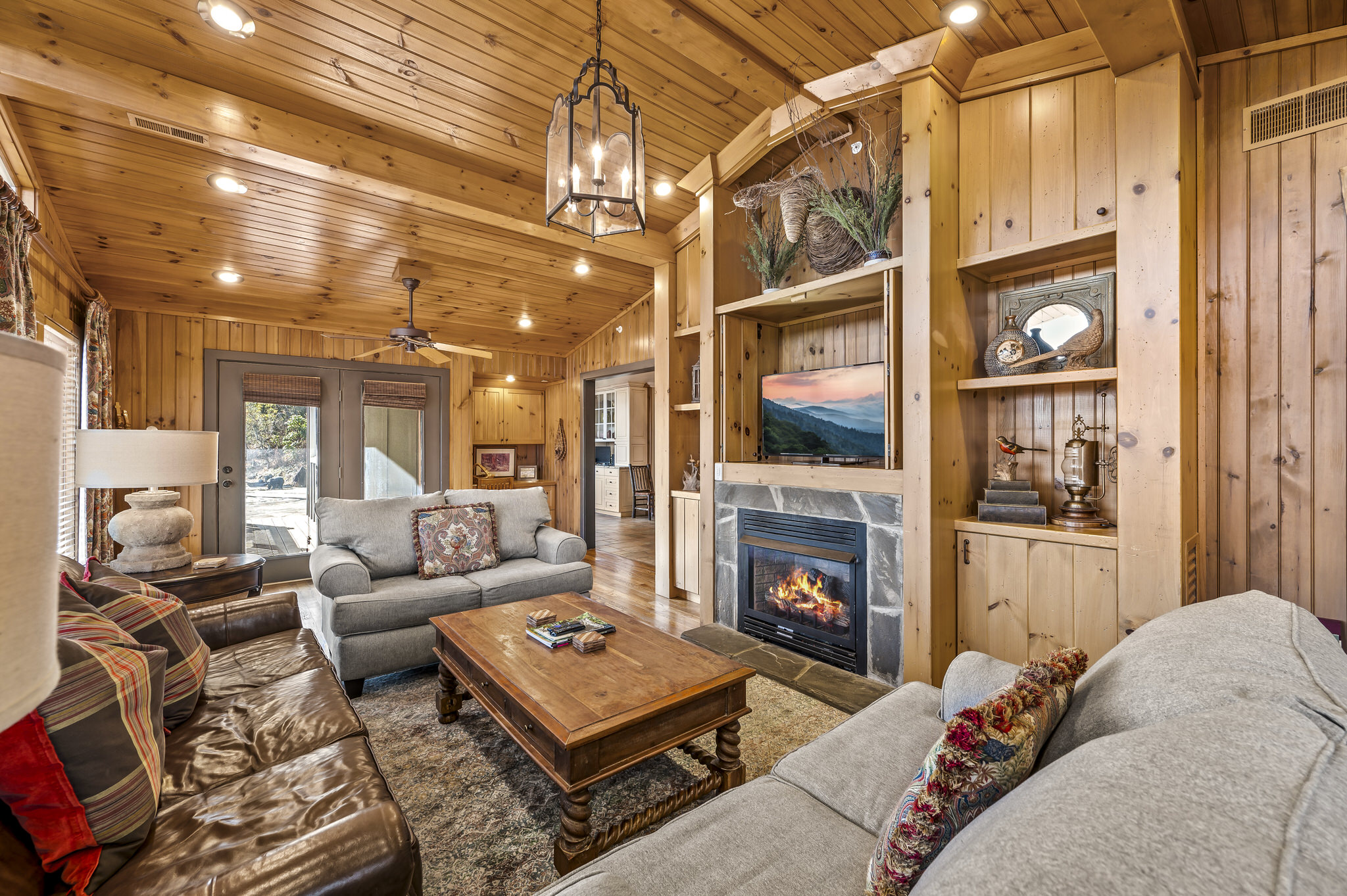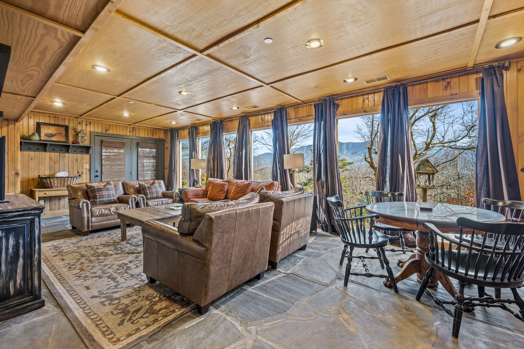 Upon entering the property’s main level, guests will immediately feel a warm sense of welcome. To the left, a spacious sitting area sets a peaceful mood, offering a direct view of Mt. LeConte beyond the windows. A large fully-stocked kitchen is situated to the right, and it has everything you need to prepare large meals in the comfort of your home away from home (just bring groceries). The kitchen’s sub-zero refrigerator, double ovens, and a warming drawer make cooking a breeze. Beyond the kitchen, a dining area boasts an oversized table with plenty of seating, perfect for shared meals and game play. A few more steps take you into the cozy sunroom, which features a wall of windows that frame the beauty of the mountains. A gas fireplace adds to the ambience of the space.
