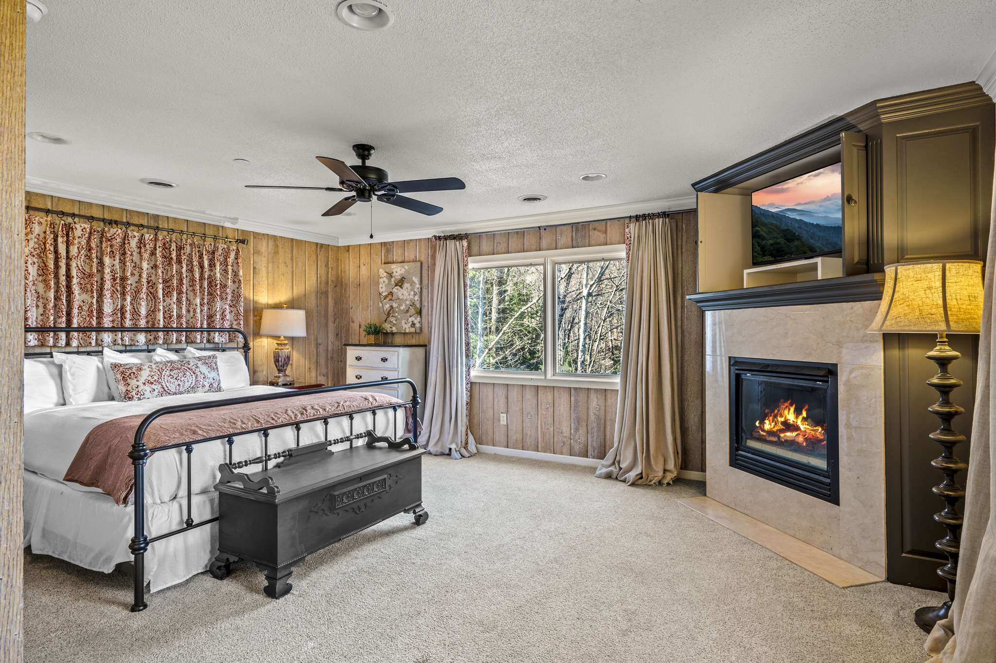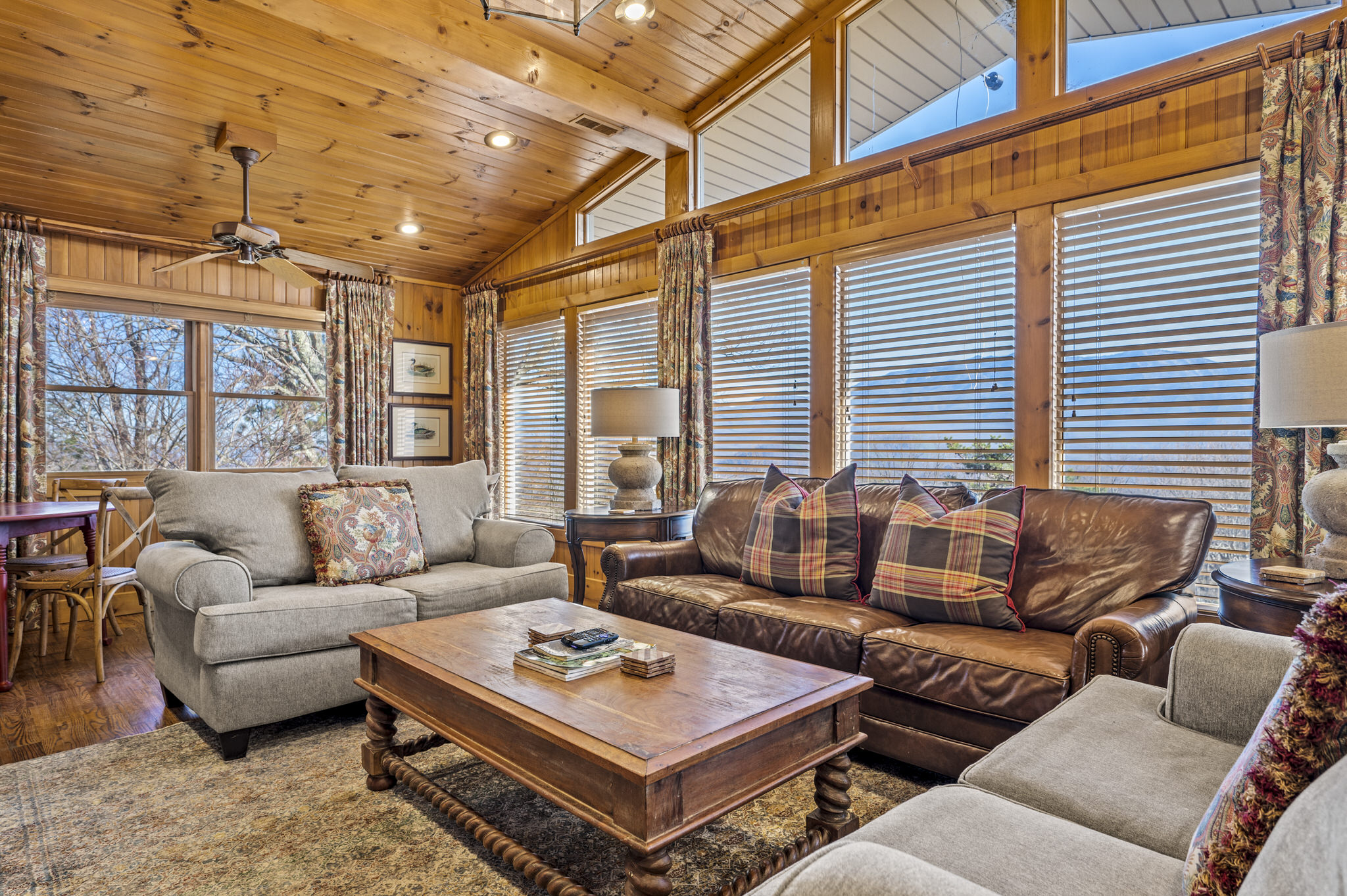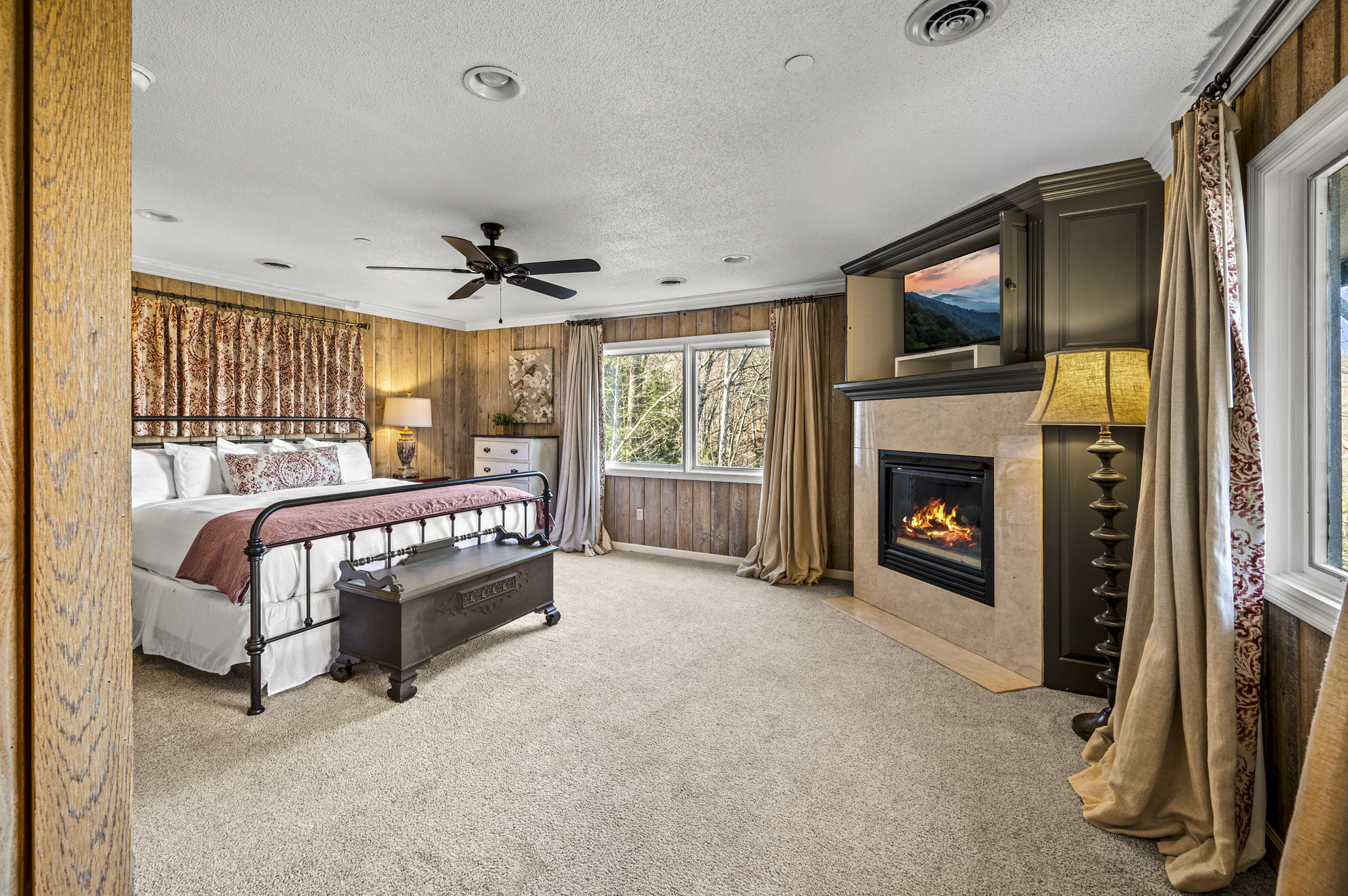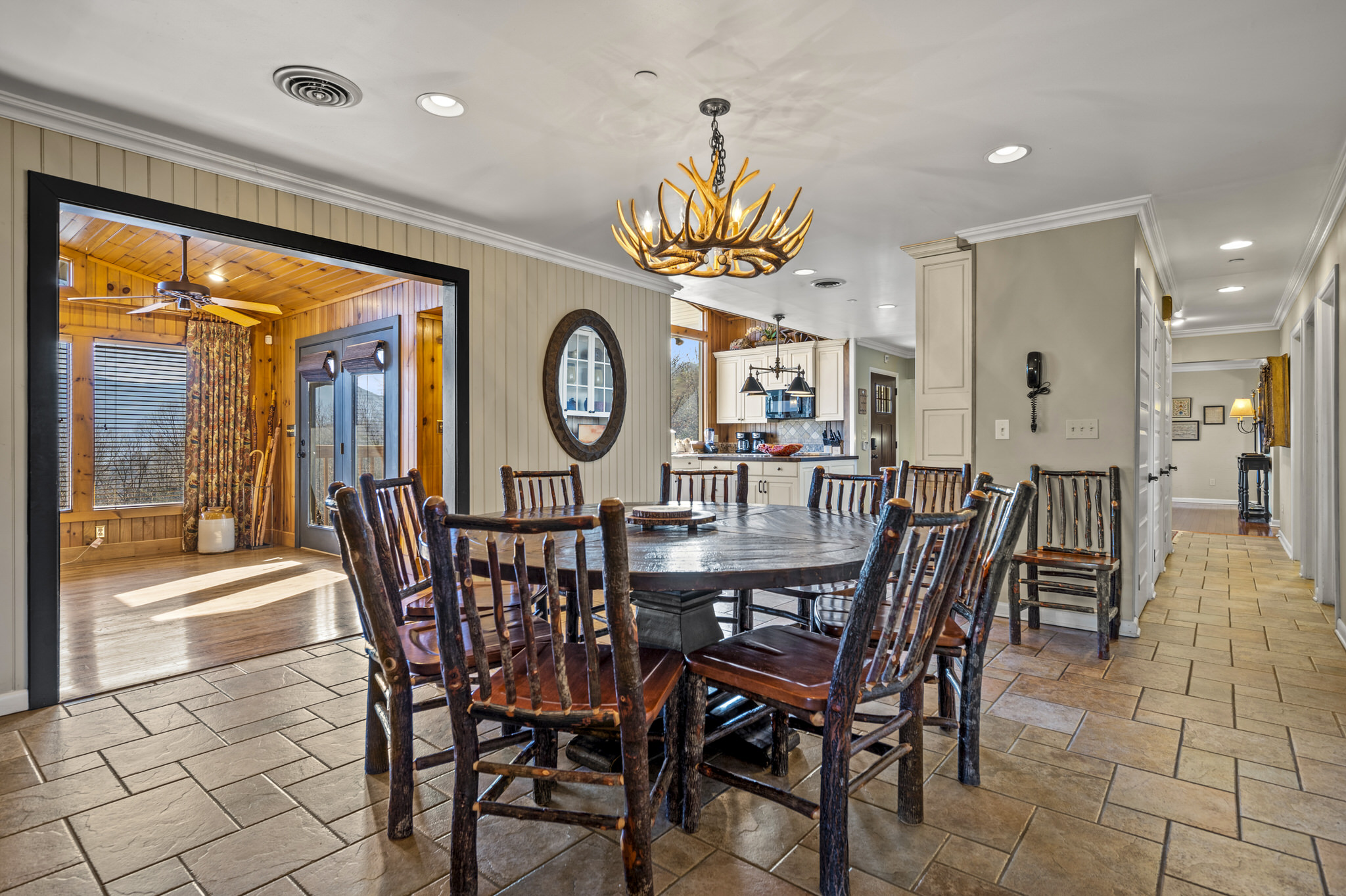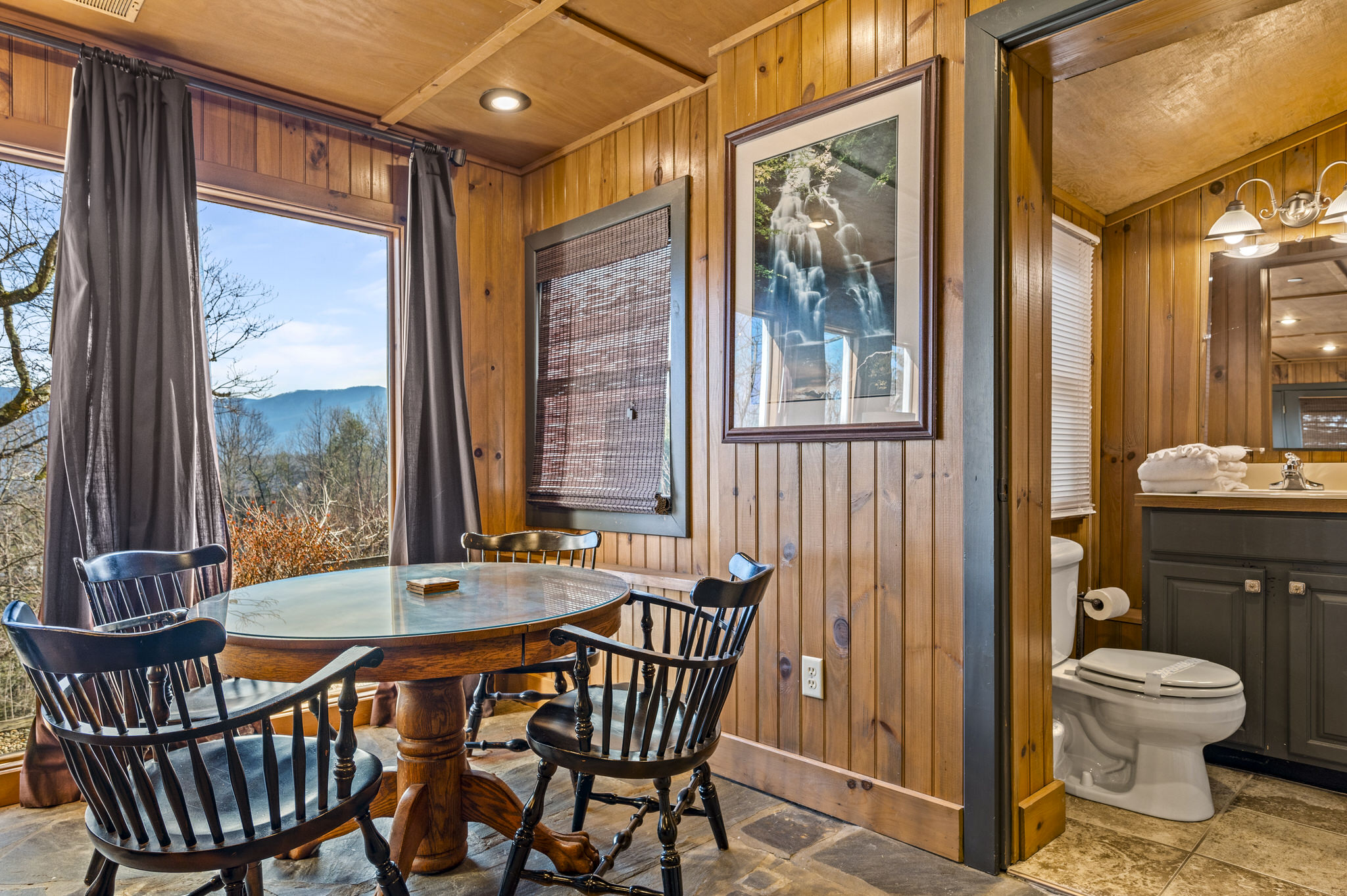 Upon entering the property’s main level, guests will immediately feel a warm sense of welcome. To the left, a spacious sitting area sets a peaceful mood, offering a direct view of Mt. LeConte beyond the windows. A large fully-stocked kitchen is situated to the right, and it has everything you need to prepare large meals in the comfort of your home away from home (just bring groceries). The kitchen’s sub-zero refrigerator, double ovens, and a warming drawer make cooking a breeze. Beyond the kitchen, a dining area boasts an oversized table with plenty of seating, perfect for shared meals and game play. A few more steps take you into the cozy sunroom, which features a wall of windows that frame the beauty of the mountains. A gas fireplace adds to the ambience of the space.