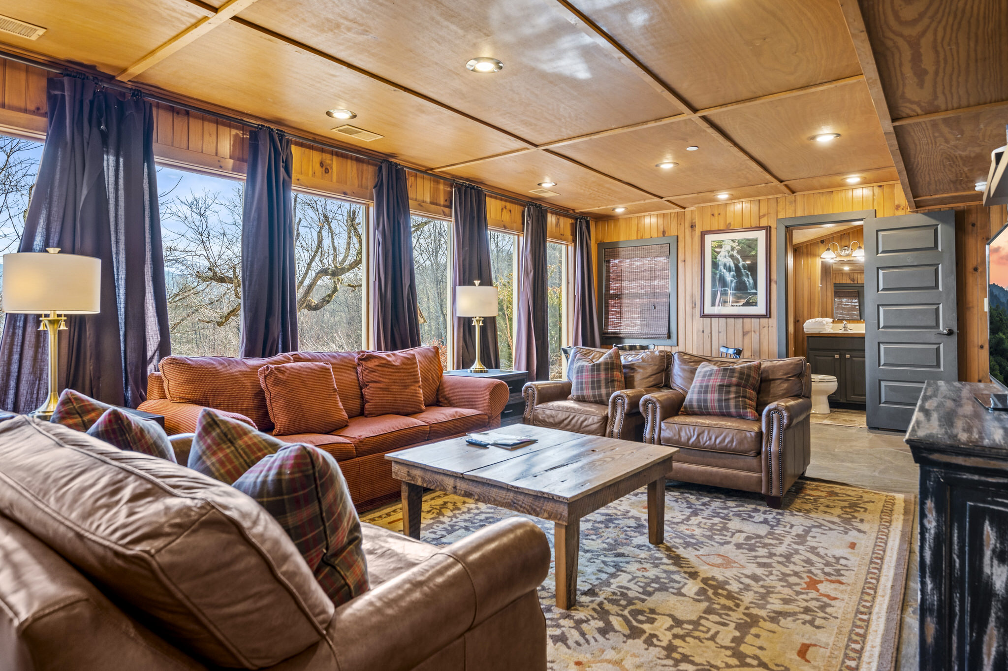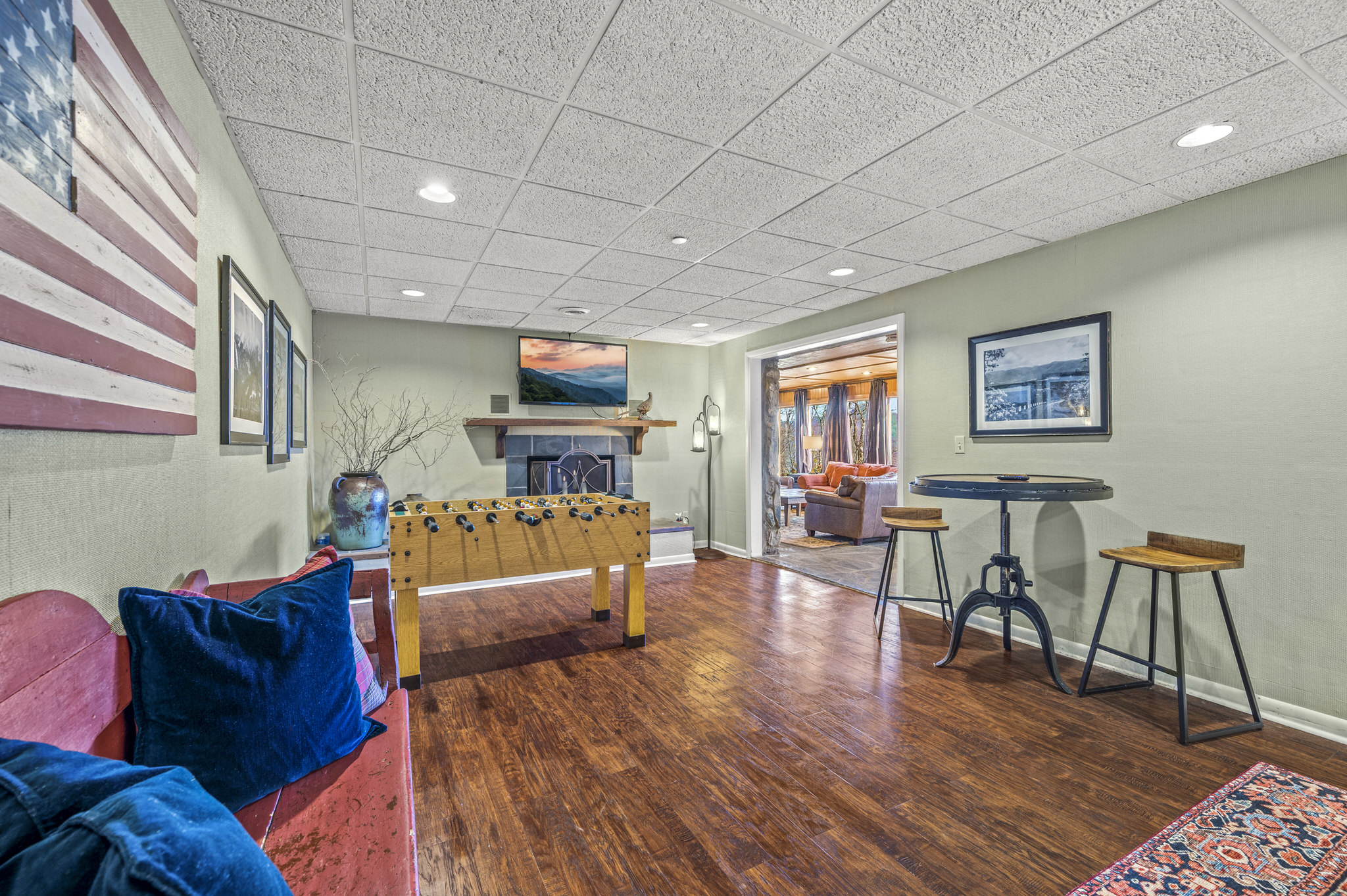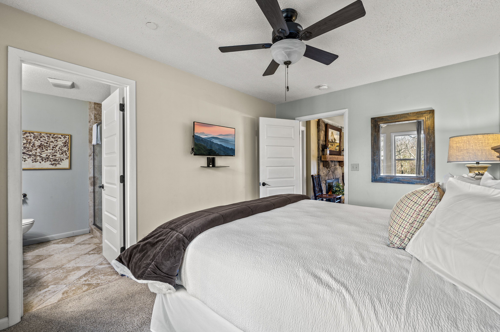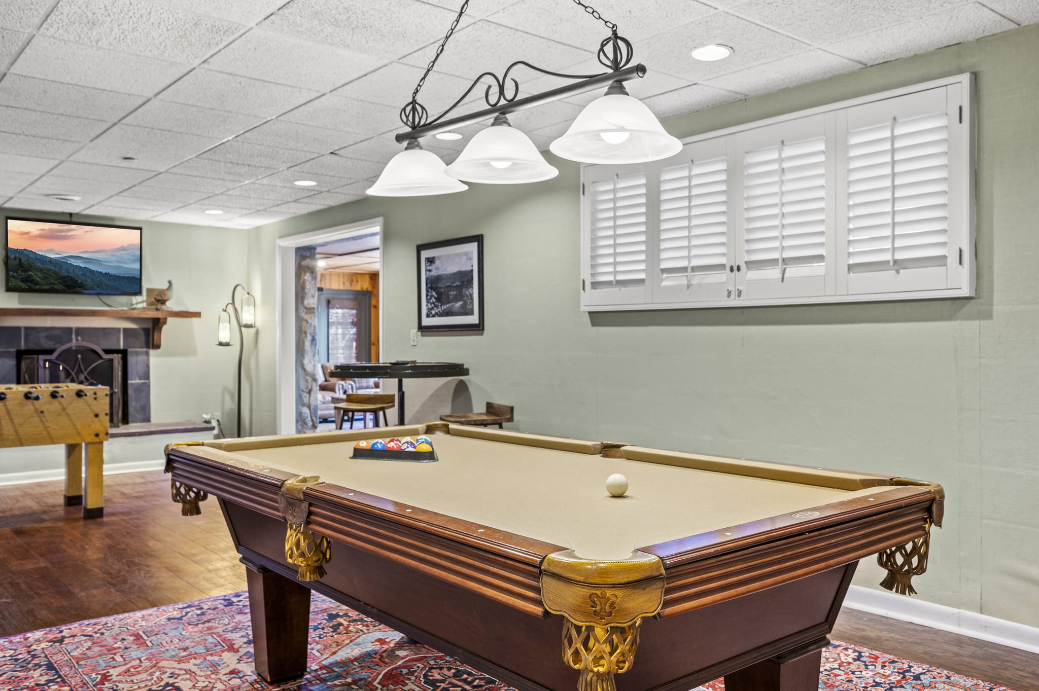 Upon entering the property’s main level, guests will immediately feel a warm sense of welcome. To the left, a spacious sitting area sets a peaceful mood, offering a direct view of Mt. LeConte beyond the windows. A large fully-stocked kitchen is situated to the right, and it has everything you need to prepare large meals in the comfort of your home away from home (just bring groceries). The kitchen’s sub-zero refrigerator, double ovens, and a warming drawer make cooking a breeze. Beyond the kitchen, a dining area boasts an oversized table with plenty of seating, perfect for shared meals and game play. A few more steps take you into the cozy sunroom, which features a wall of windows that frame the beauty of the mountains. A gas fireplace adds to the ambience of the space.
