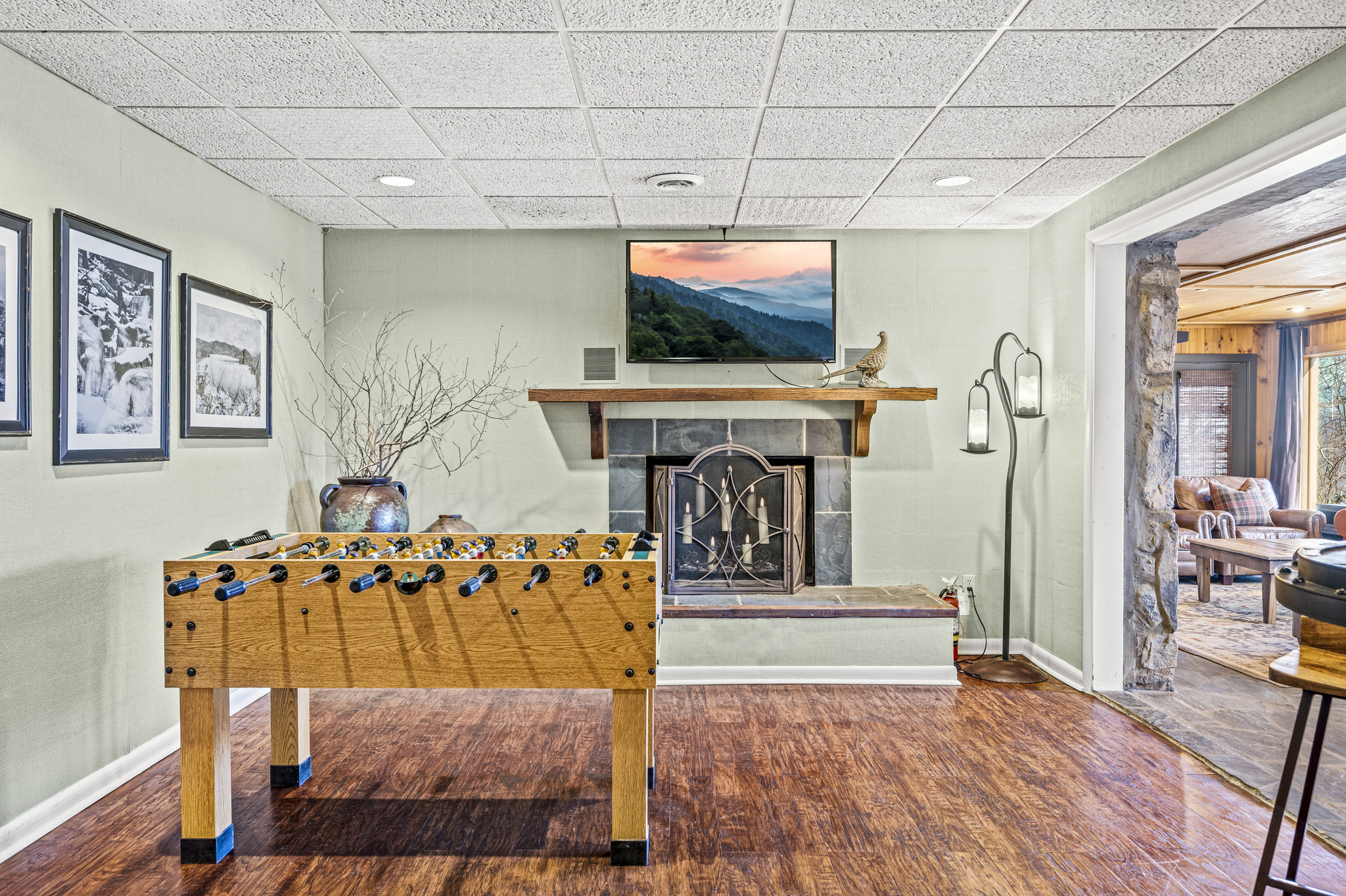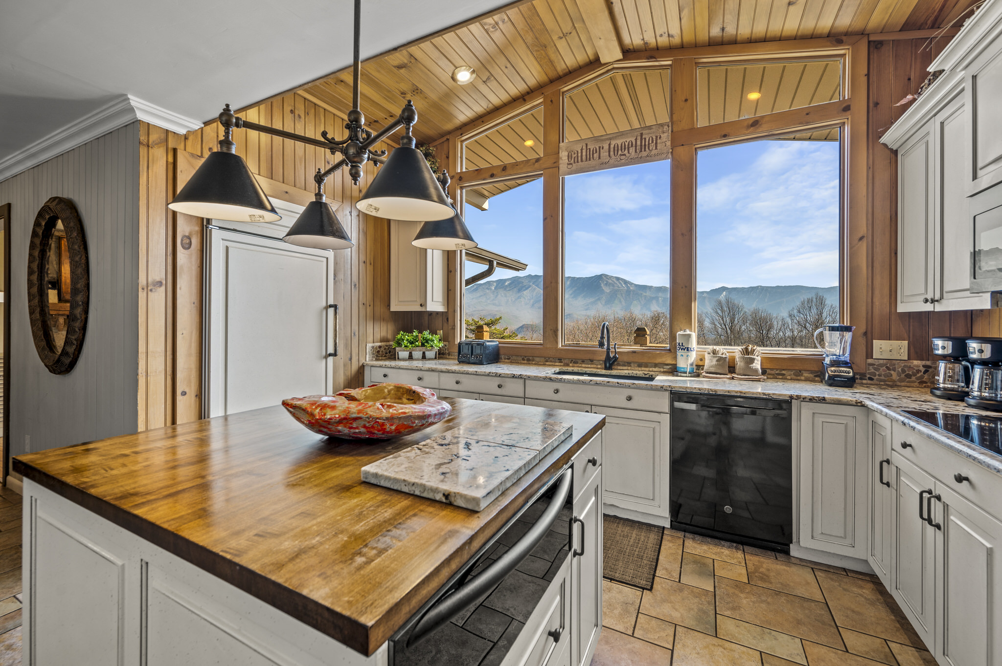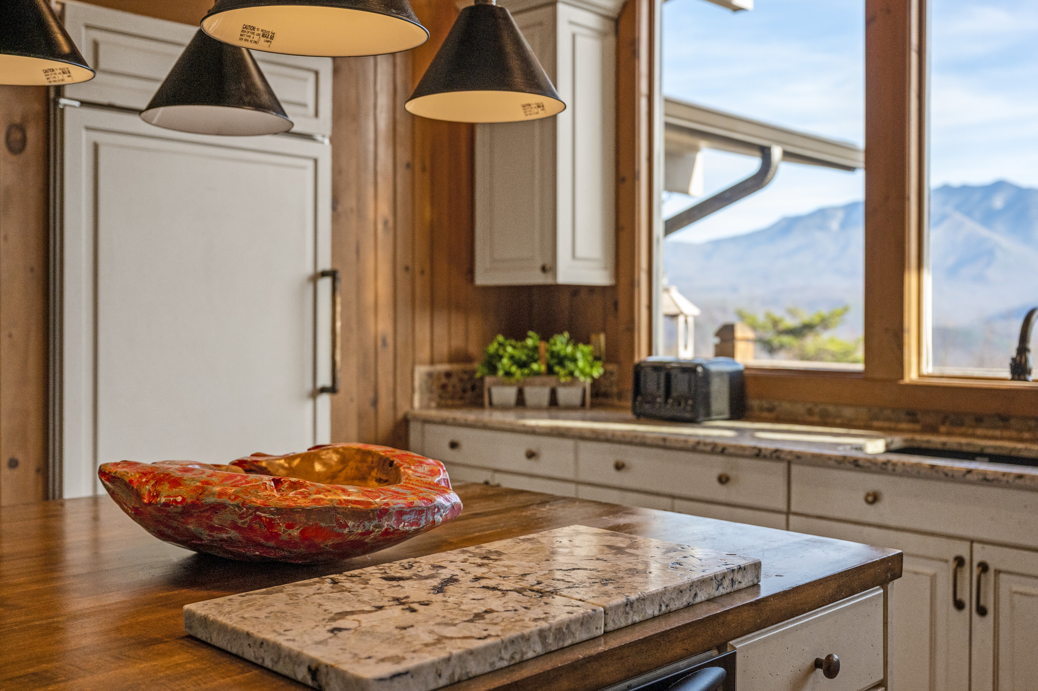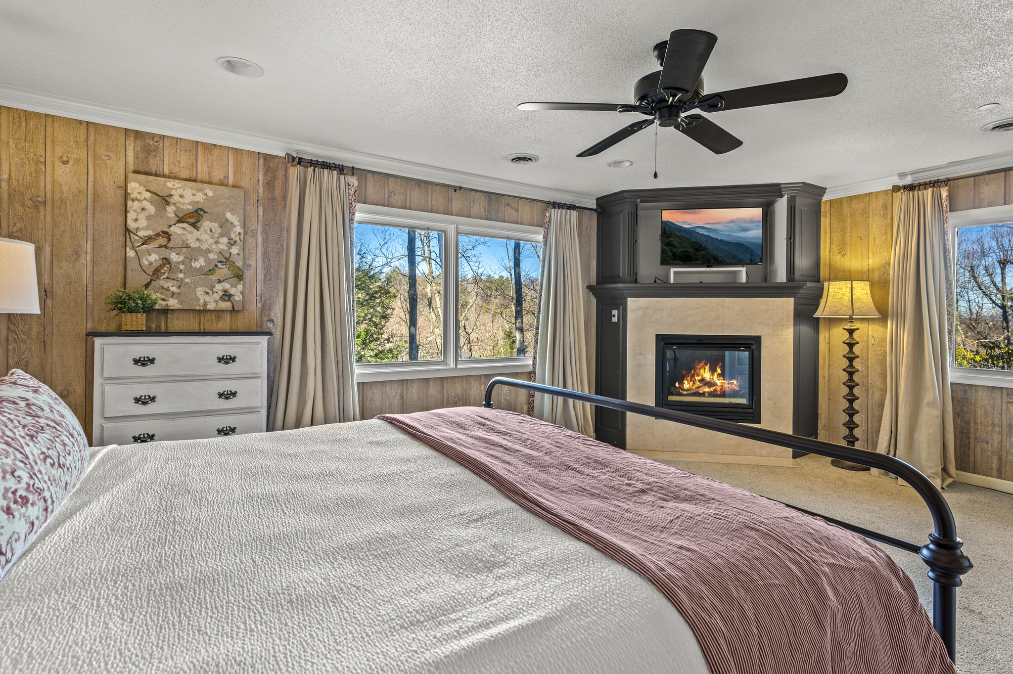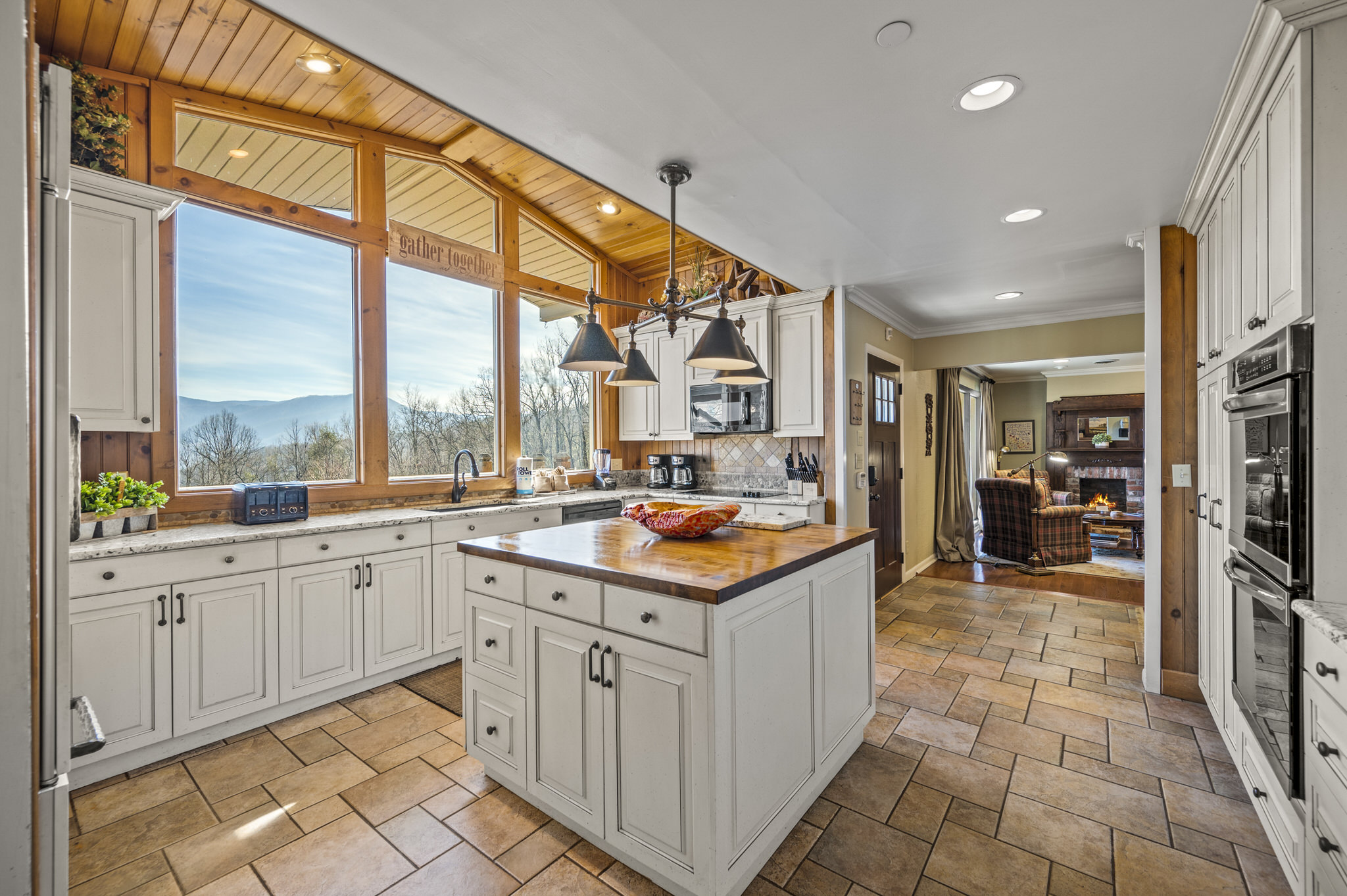 Upon entering the property’s main level, guests will immediately feel a warm sense of welcome. To the left, a spacious sitting area sets a peaceful mood, offering a direct view of Mt. LeConte beyond the windows. A large fully-stocked kitchen is situated to the right, and it has everything you need to prepare large meals in the comfort of your home away from home (just bring groceries). The kitchen’s sub-zero refrigerator, double ovens, and a warming drawer make cooking a breeze. Beyond the kitchen, a dining area boasts an oversized table with plenty of seating, perfect for shared meals and game play. A few more steps take you into the cozy sunroom, which features a wall of windows that frame the beauty of the mountains. A gas fireplace adds to the ambience of the space.