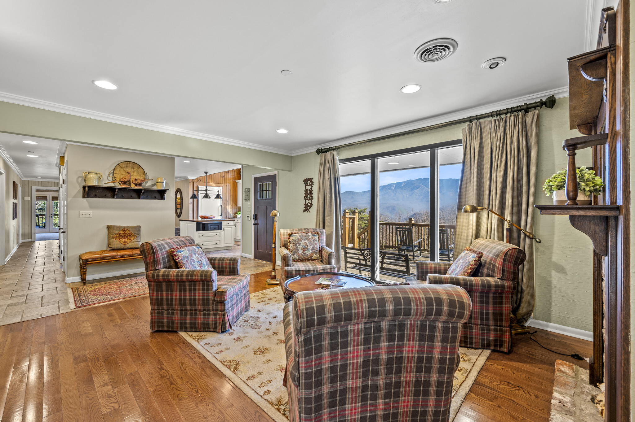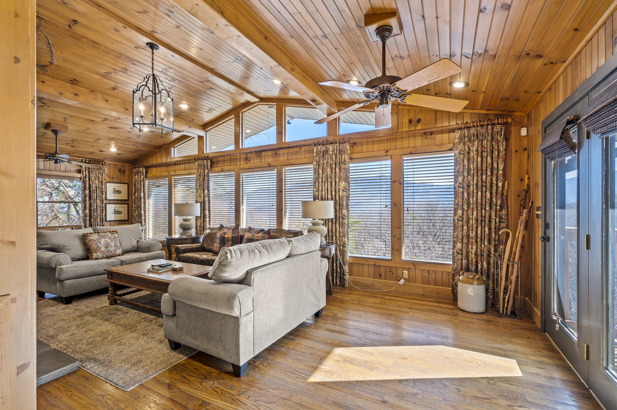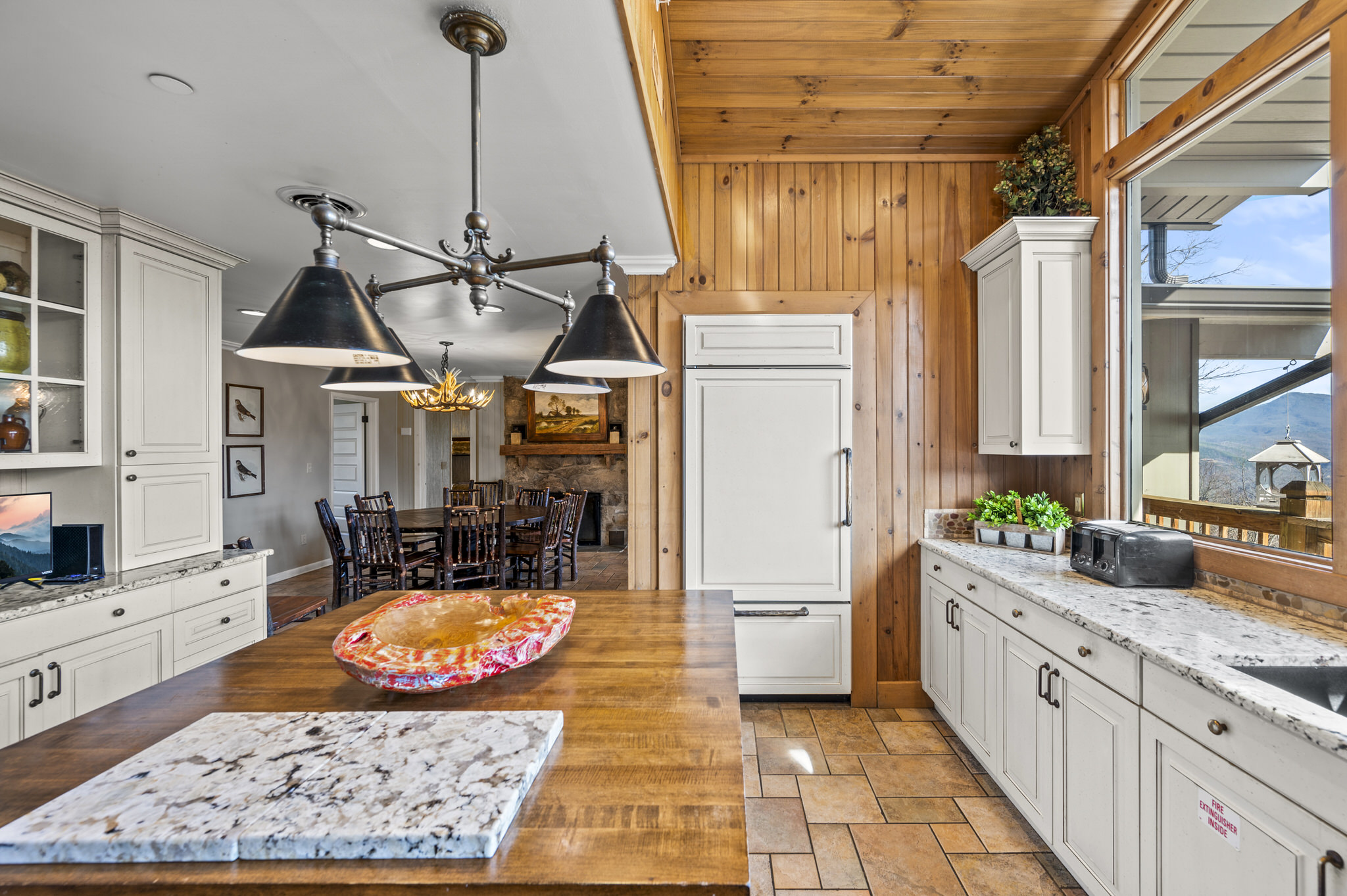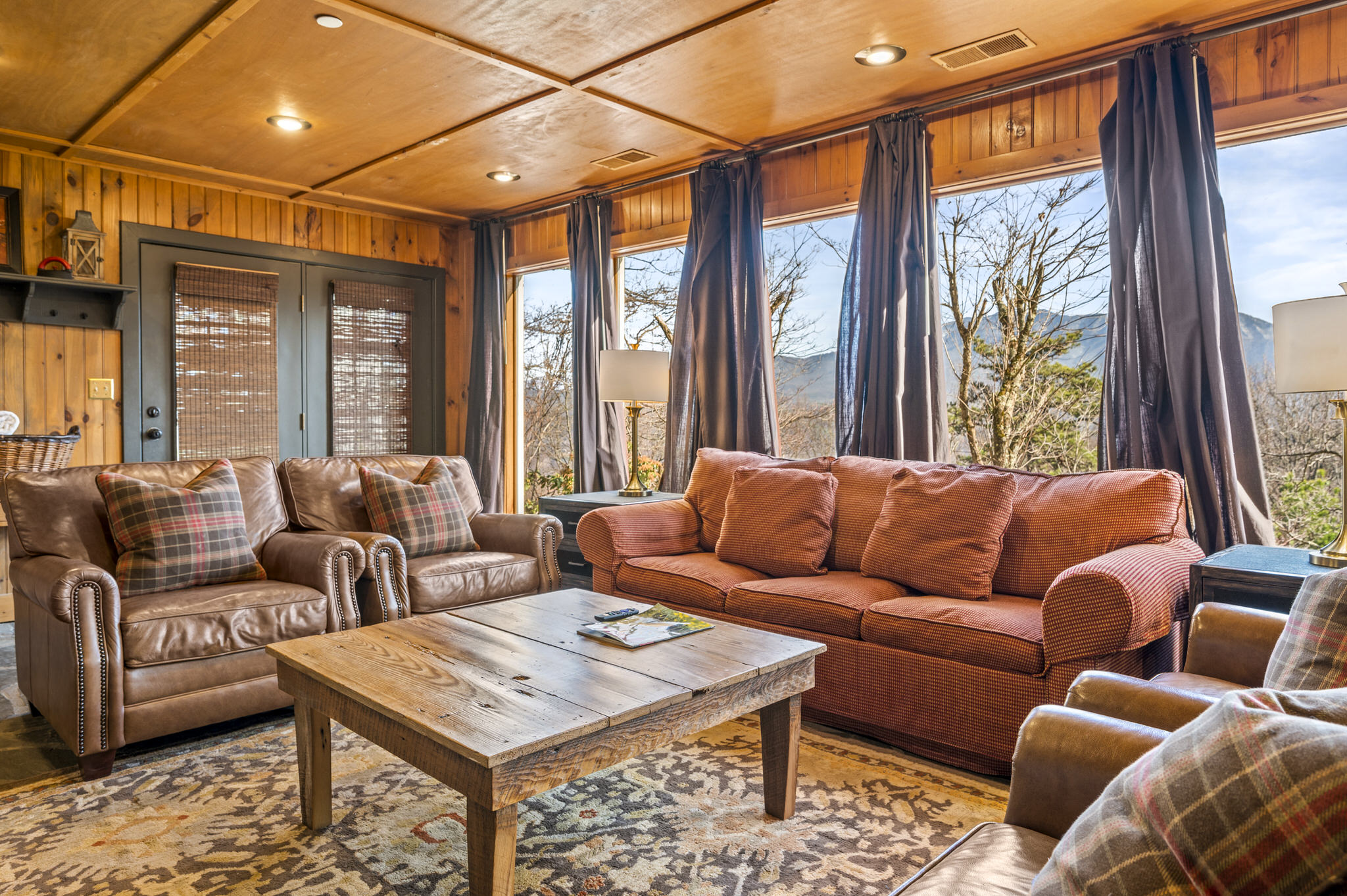 Upon entering the property’s main level, guests will immediately feel a warm sense of welcome. To the left, a spacious sitting area sets a peaceful mood, offering a direct view of Mt. LeConte beyond the windows. A large fully-stocked kitchen is situated to the right, and it has everything you need to prepare large meals in the comfort of your home away from home (just bring groceries). The kitchen’s sub-zero refrigerator, double ovens, and a warming drawer make cooking a breeze. Beyond the kitchen, a dining area boasts an oversized table with plenty of seating, perfect for shared meals and game play. A few more steps take you into the cozy sunroom, which features a wall of windows that frame the beauty of the mountains. A gas fireplace adds to the ambience of the space.