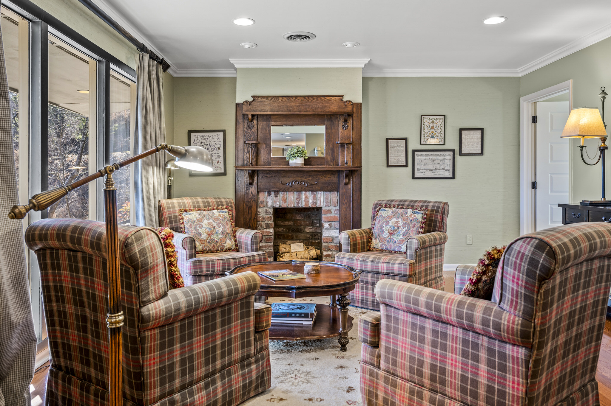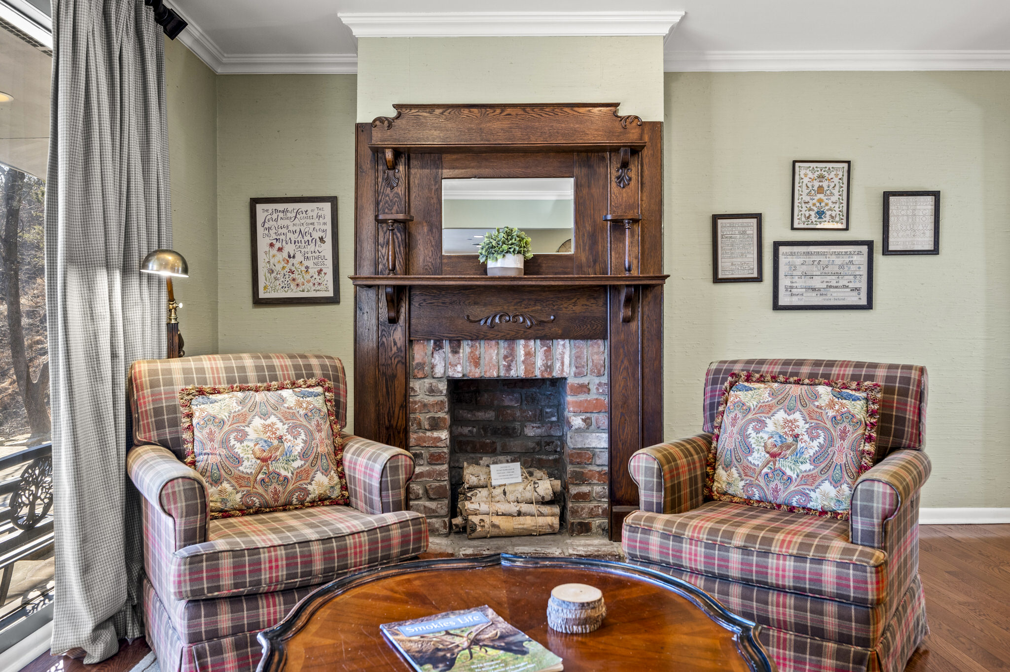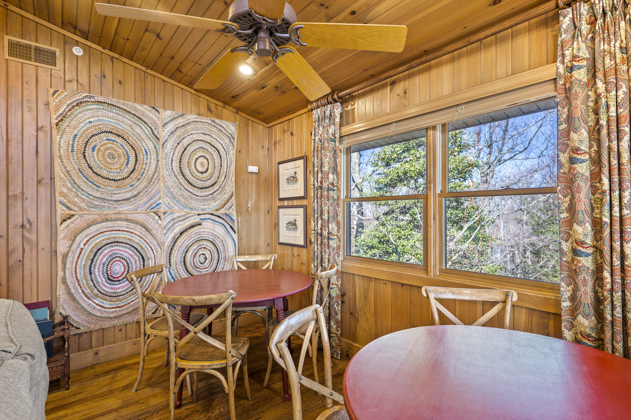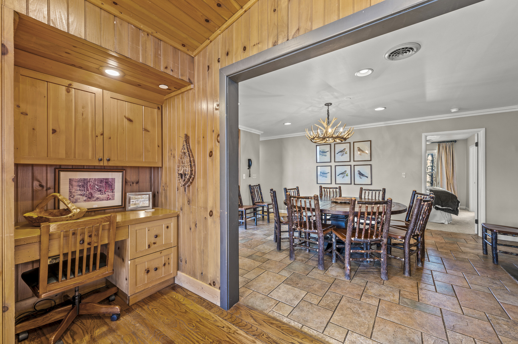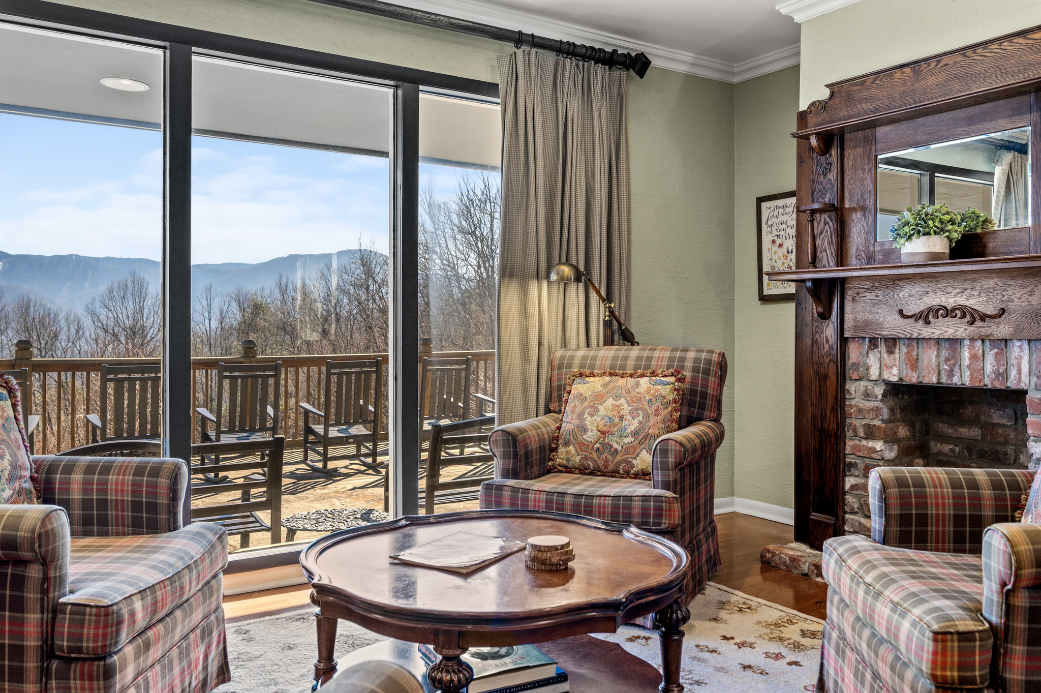Upon entering the property’s main level, guests will immediately feel a warm sense of welcome. To the left, a spacious sitting area sets a peaceful mood, offering a direct view of Mt. LeConte beyond the windows. A large fully-stocked kitchen is situated to the right, and it has everything you need to prepare large meals in the comfort of your home away from home (just bring groceries). The kitchen’s sub-zero refrigerator, double ovens, and a warming drawer make cooking a breeze. Beyond the kitchen, a dining area boasts an oversized table with plenty of seating, perfect for shared meals and game play. A few more steps take you into the cozy sunroom, which features a wall of windows that frame the beauty of the mountains. A gas fireplace adds to the ambience of the space.
