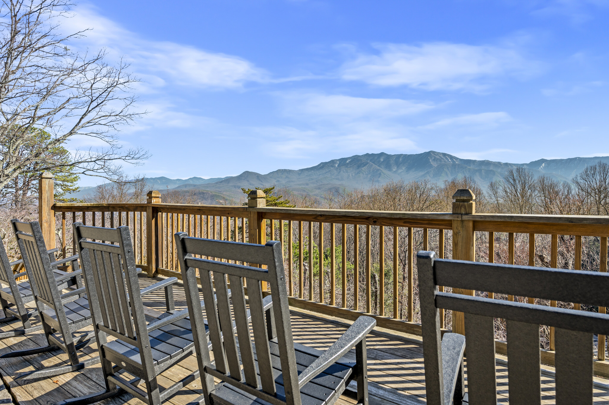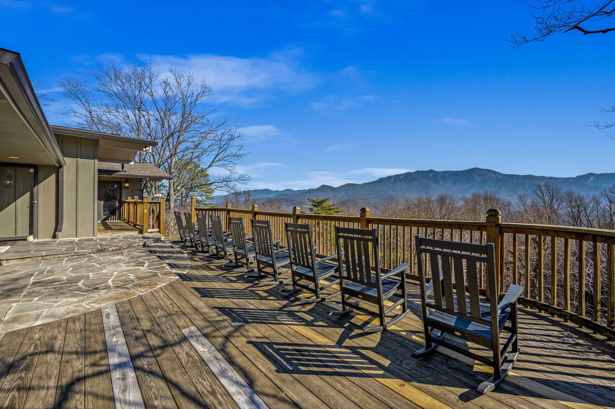 The main level deck allows guests to relax and enjoy epic views of the Smokies, with Mt. LeConte framed front and center. Plenty of rocking chairs are available, and a set of stairs lead down to the large yard area below.