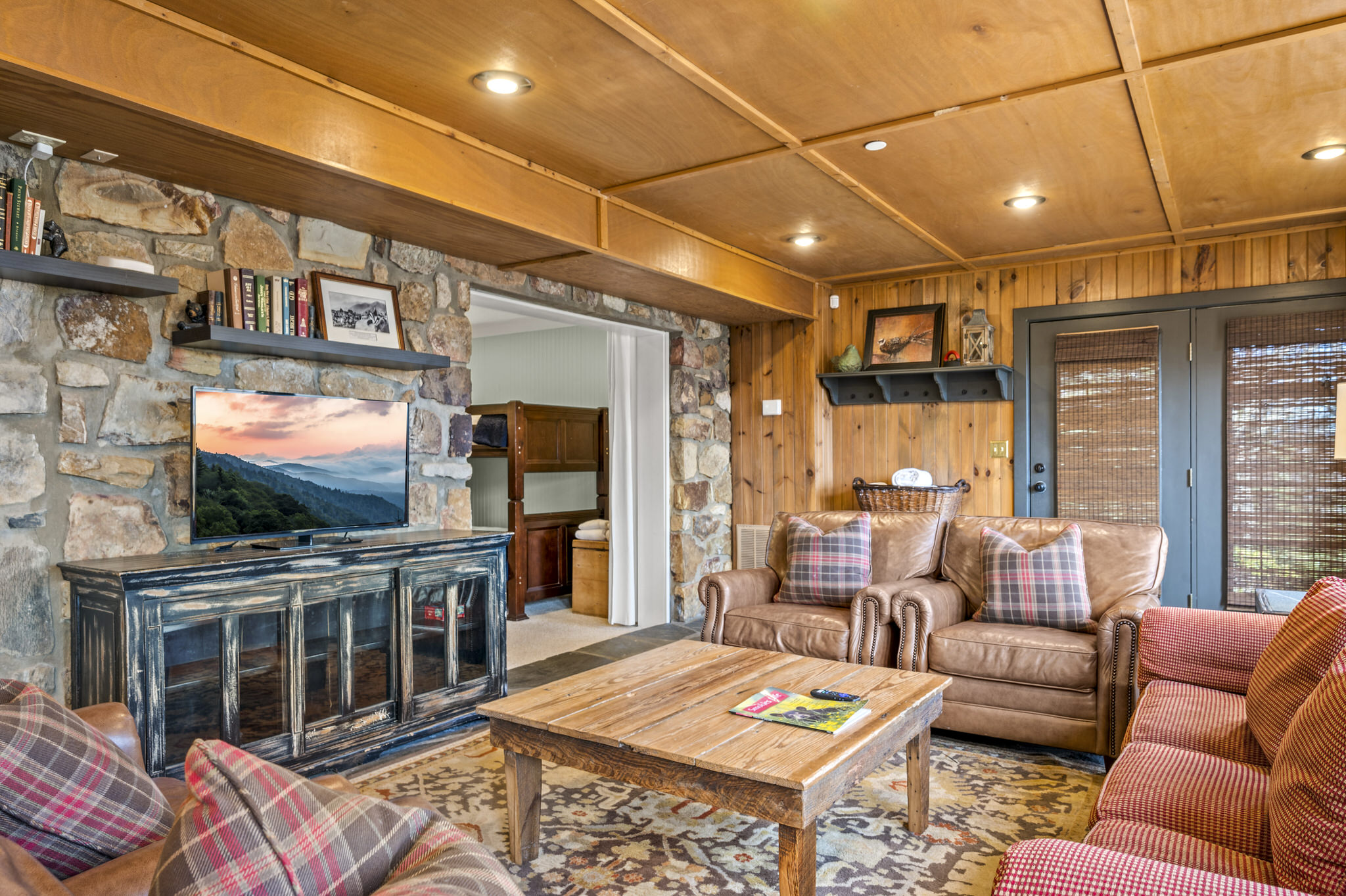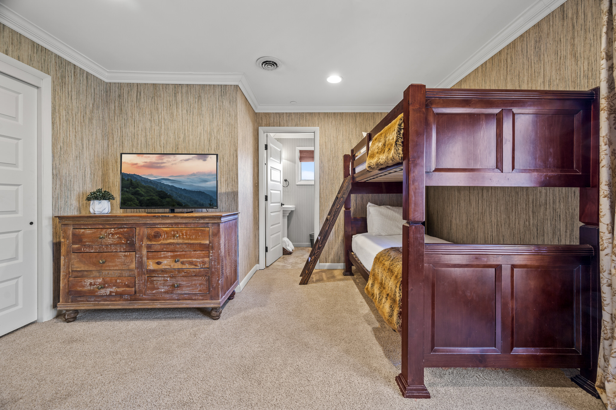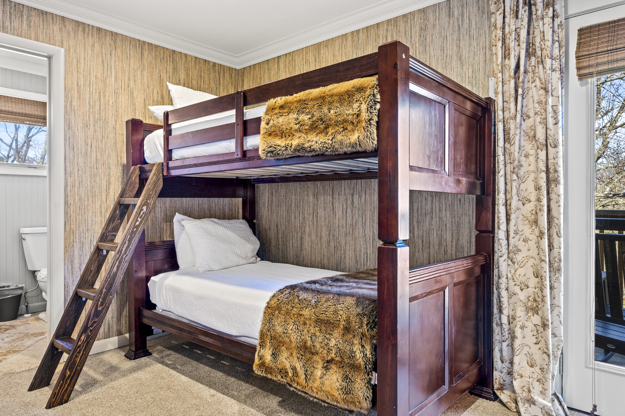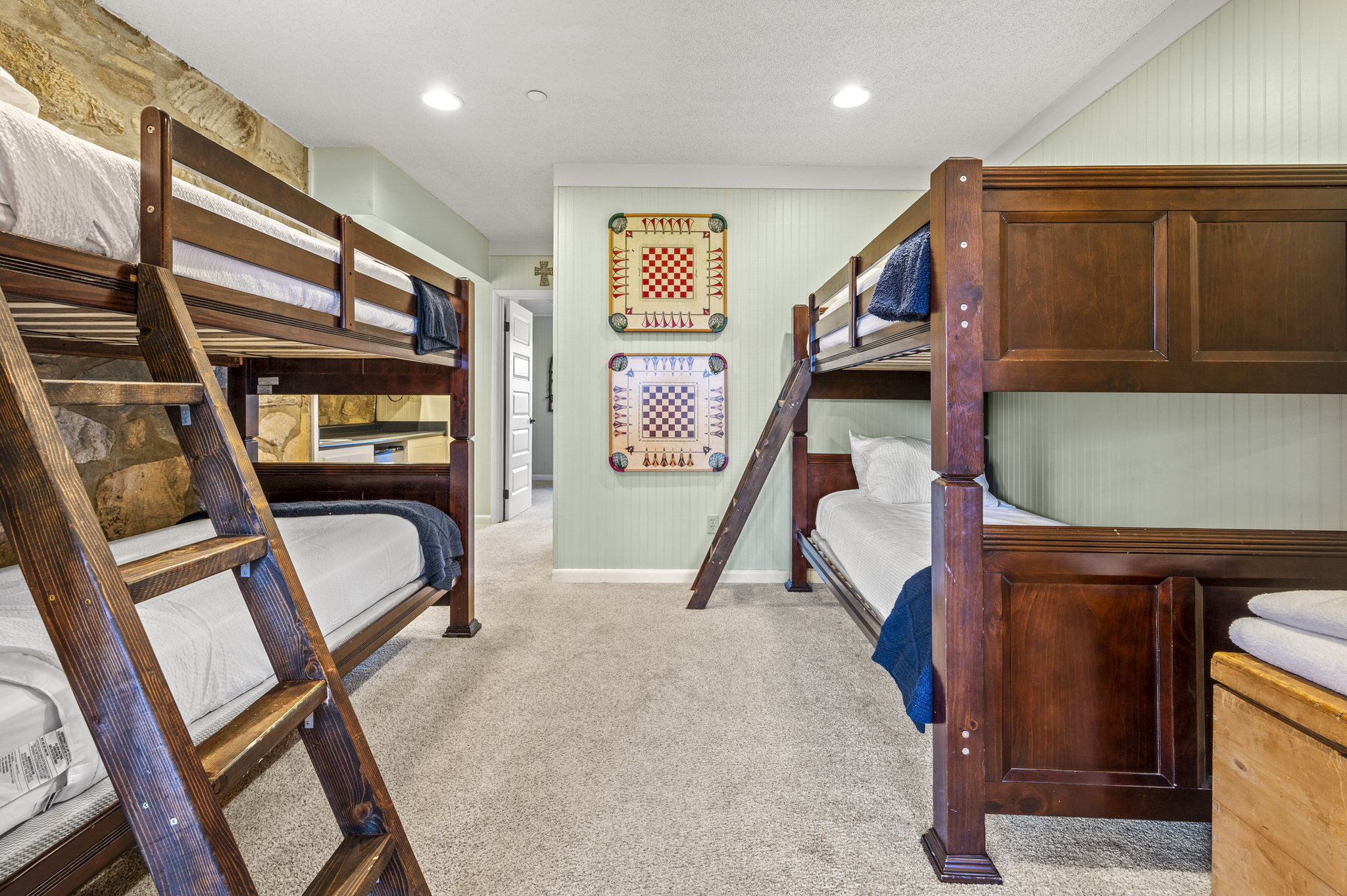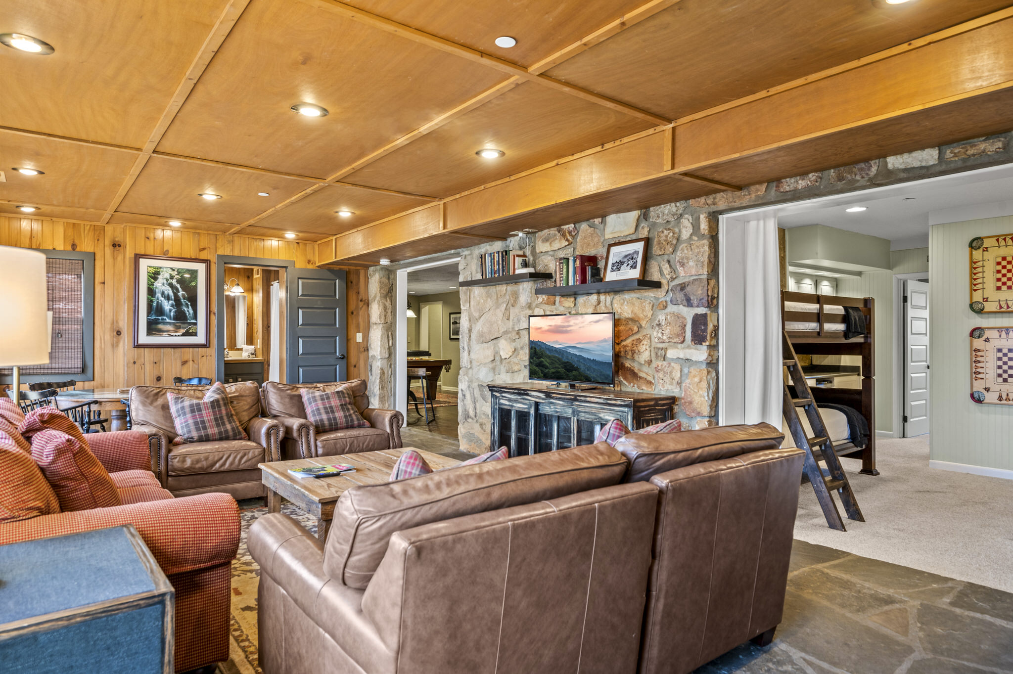 The lower level offers one king suite with a private bath. It also boasts a bunk room with two sets of twin bunks beds and a kitchenette, as well as another king bedroom. These two bedrooms share access to a bathroom.
