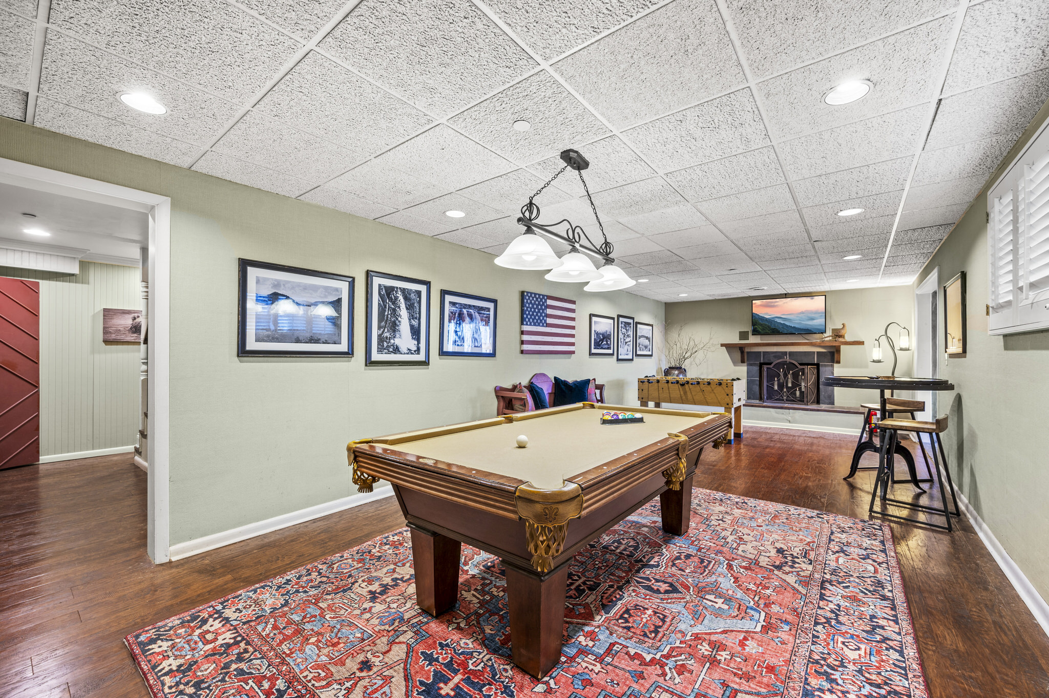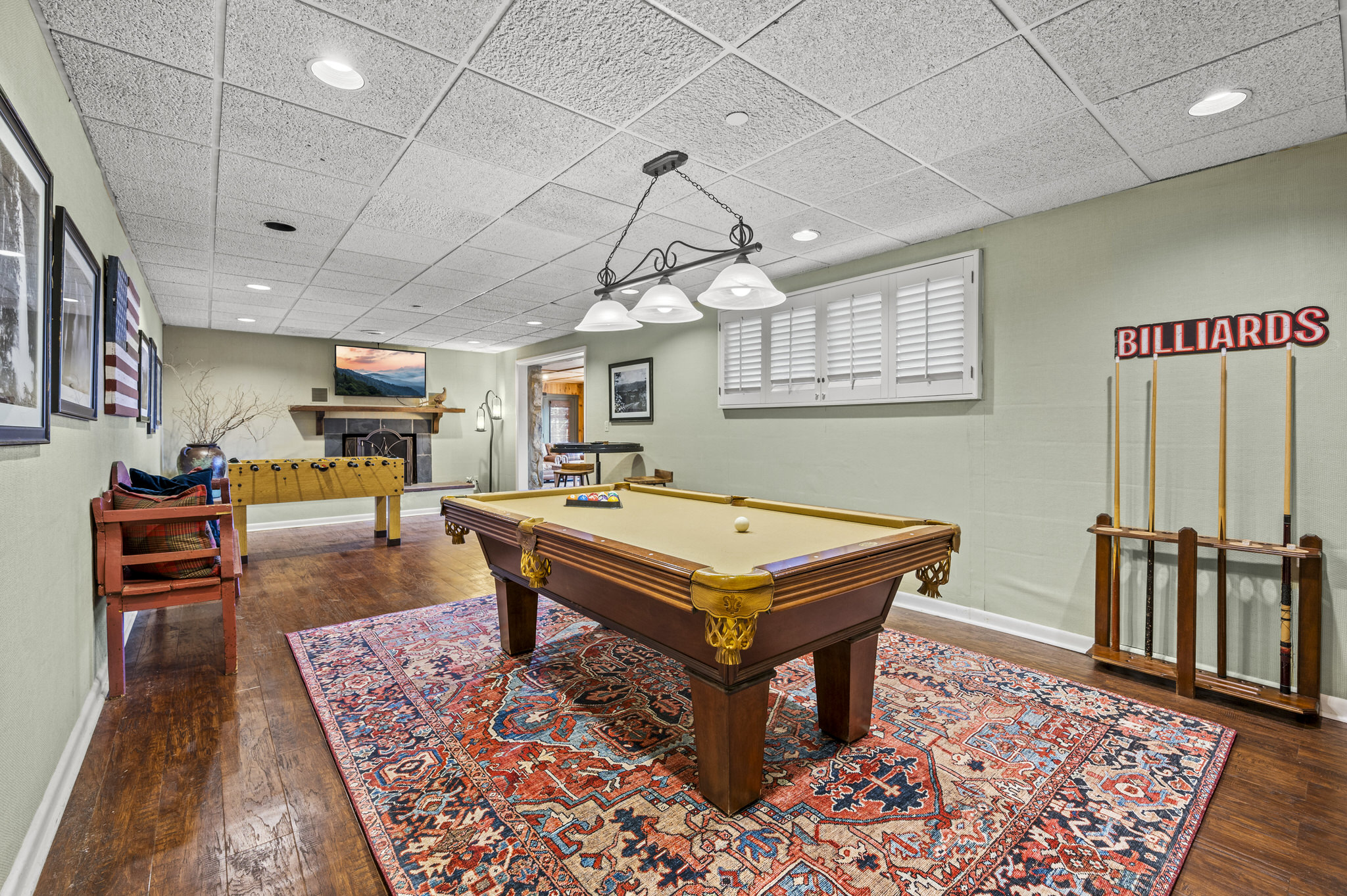 Downstairs, you’ll immediately be captivated by the large theater room, complete with built-in reclining seating. Enjoy a movie or the big game as a group on the 80” screen, and from the comfort of home! Just beyond the theater, a large game room awaits. A pool table, foosball, a game table, a 50” TV, and more will have you engaged in a little friendly competition in no time! A lower level sunroom features more comfy seating arrangements, another TV, and easy access to the side yard.