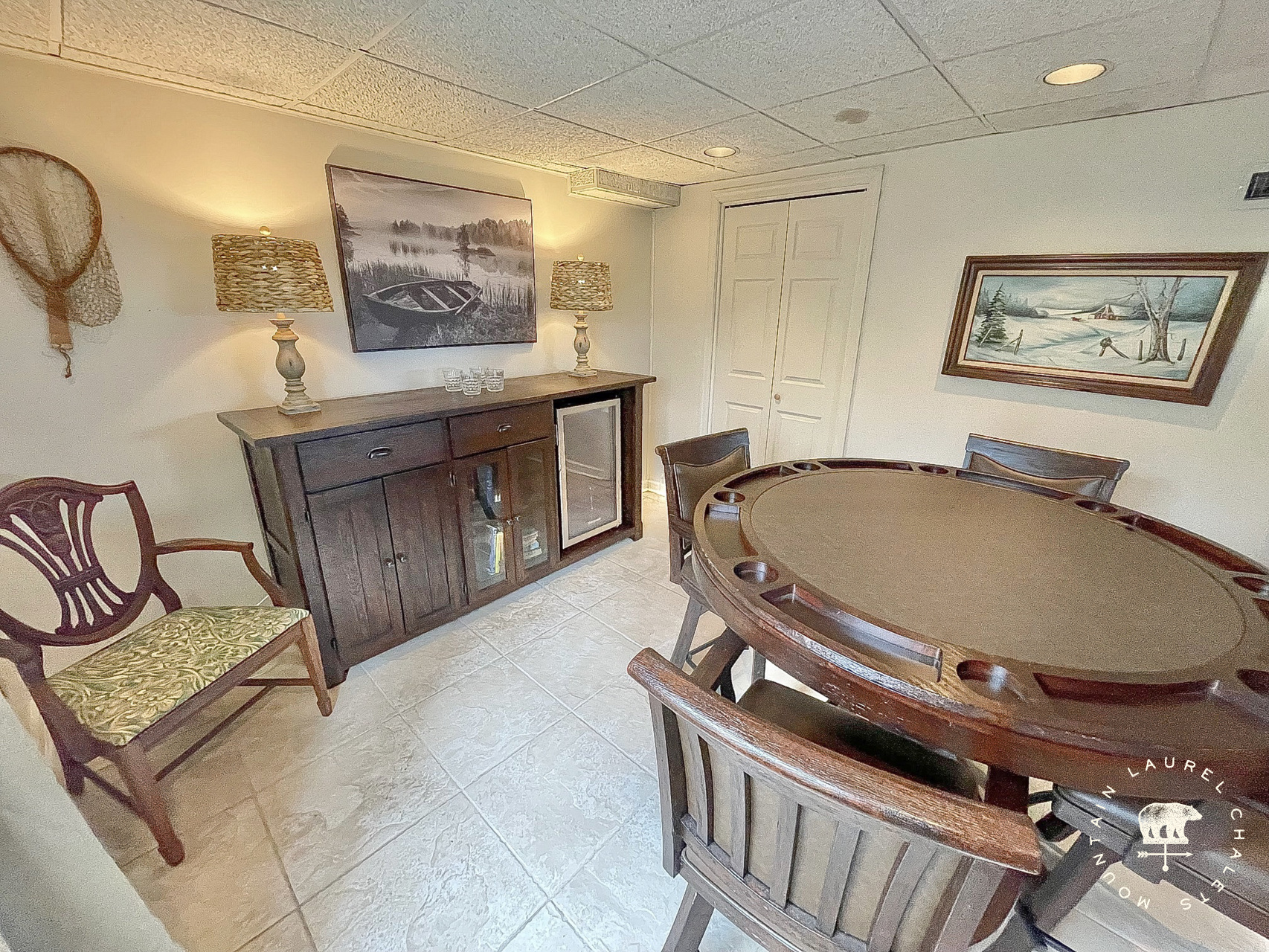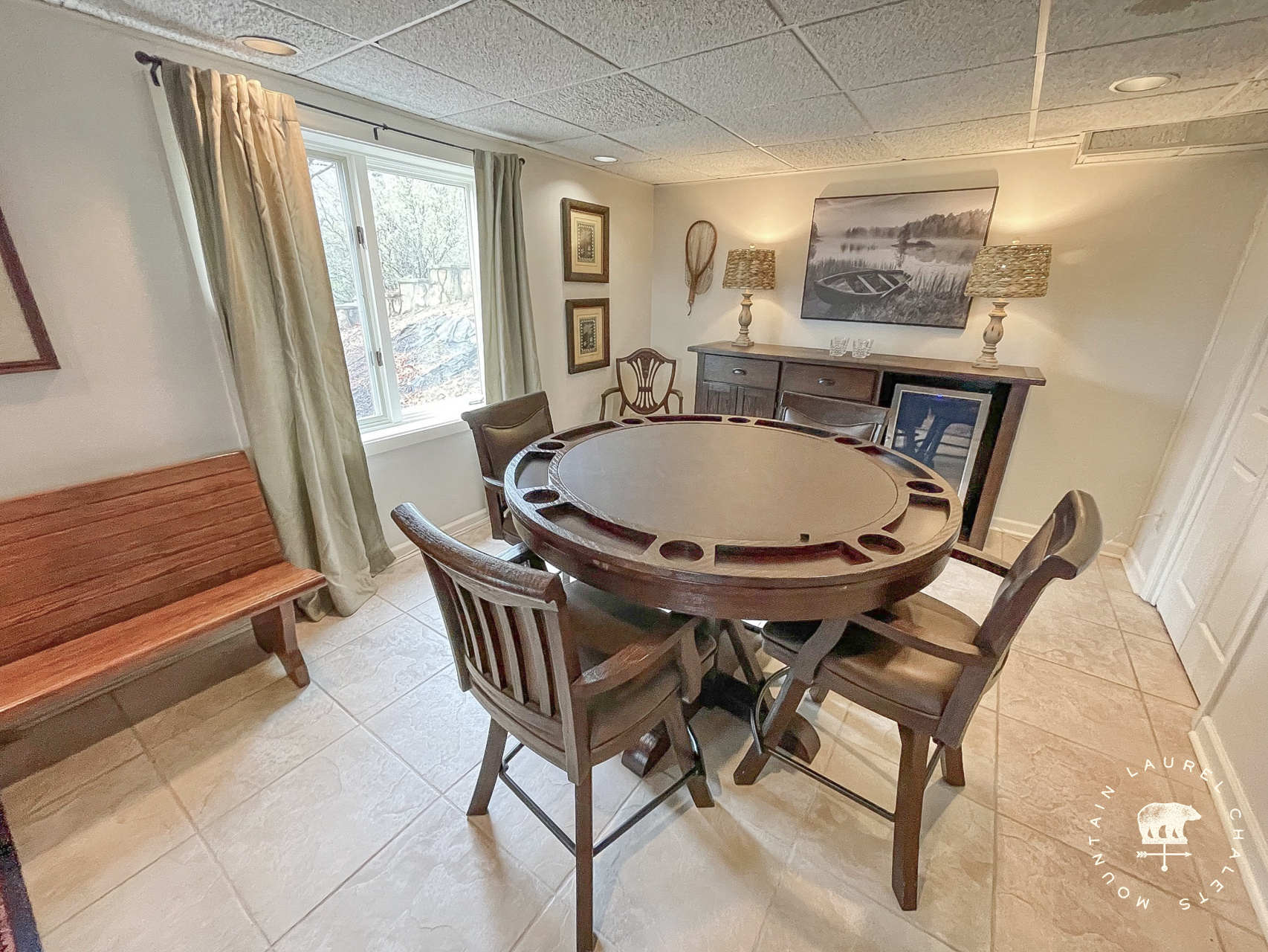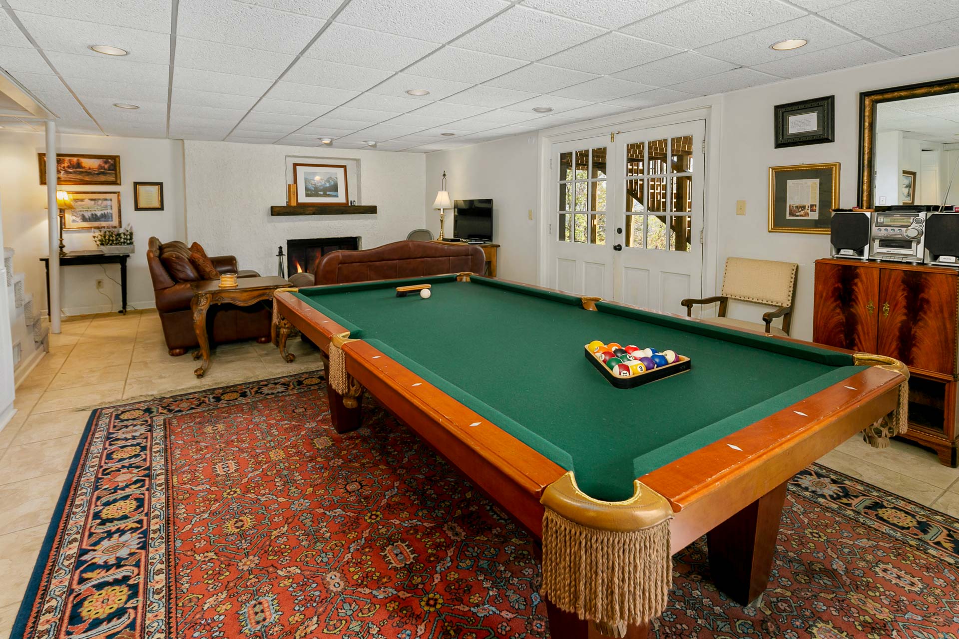 Three Suite Retreat's lower level offers a game room with a second living area. A fireplace and television add to the entertainment options, and a pool table awaits for some friendly competition. A game table is perfect for card play and puzzles, and a lovely credenza is home to a mini-fridge for beverage storage. A full bathroom is also located on the lower level, adding extra convenience to your stay.