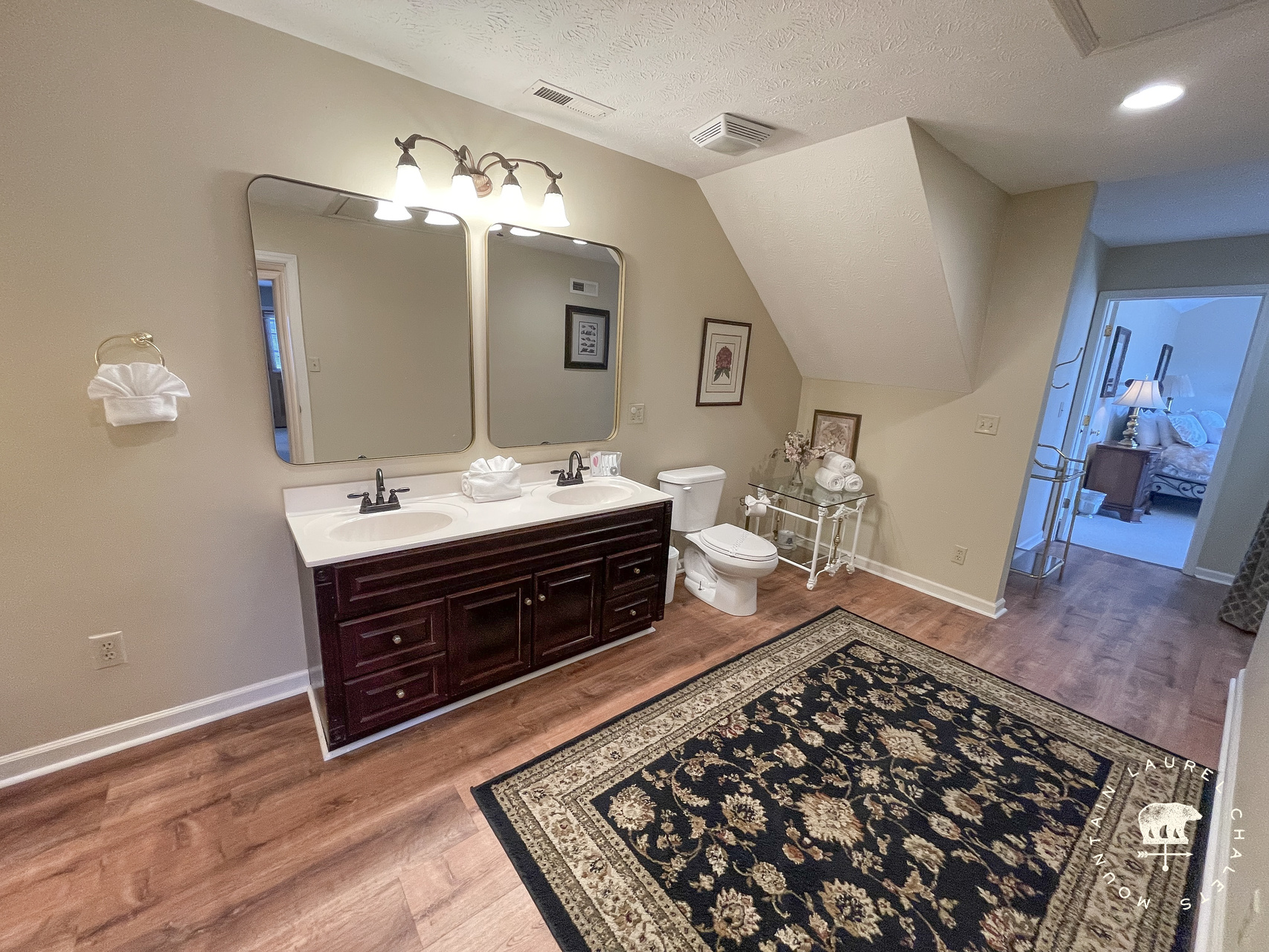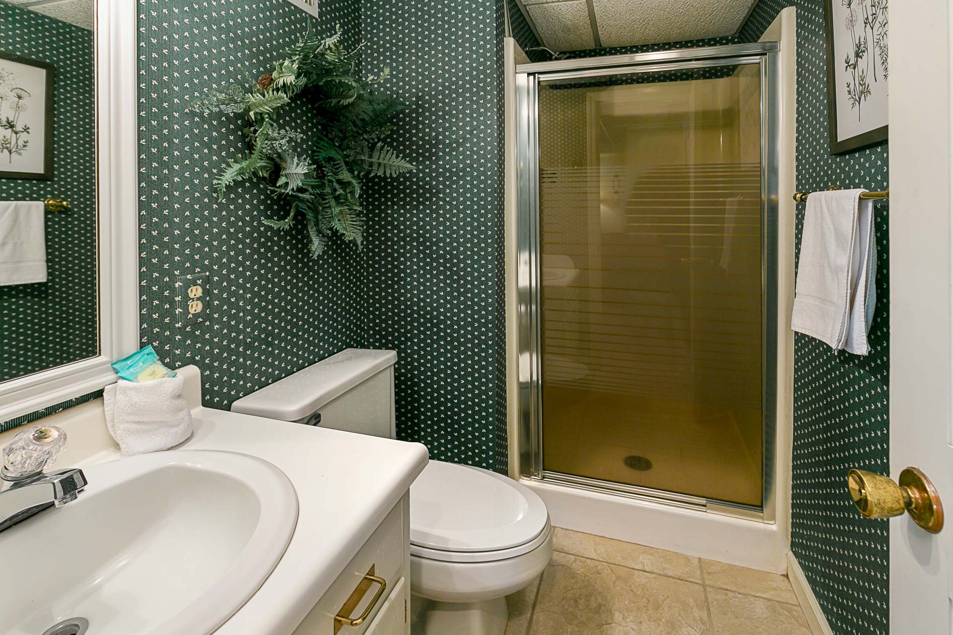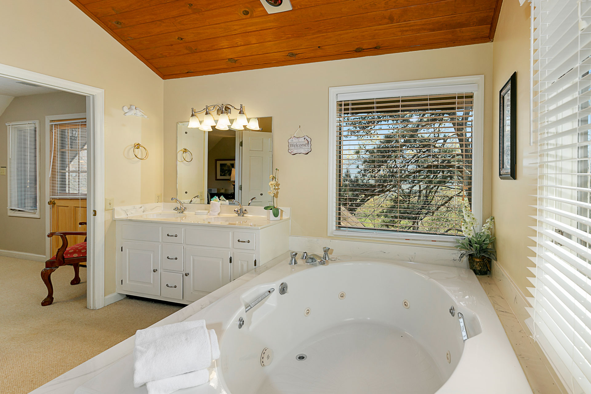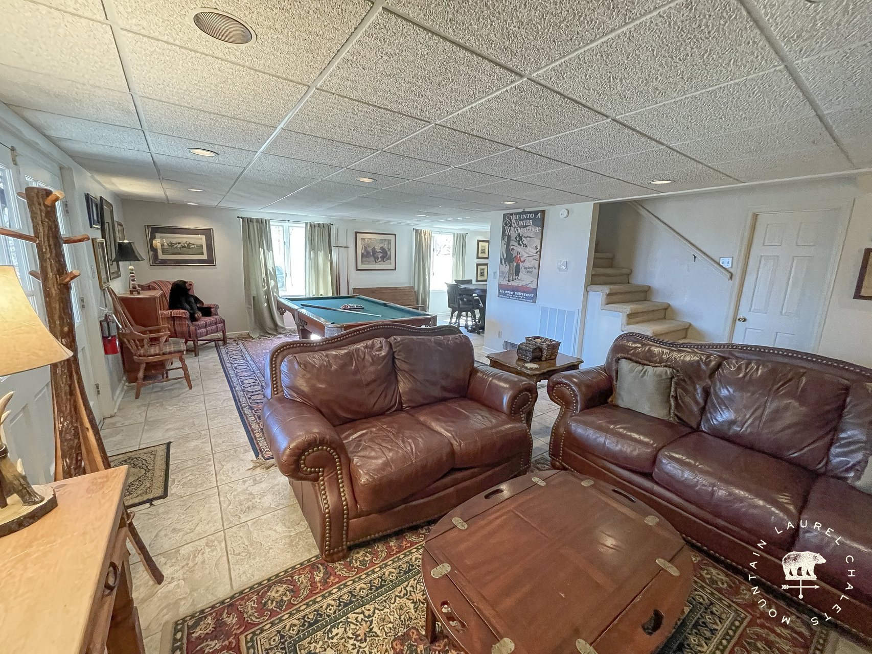 Three Suite Retreat's lower level offers a game room with a second living area. A fireplace and television add to the entertainment options, and a pool table awaits for some friendly competition. A game table is perfect for card play and puzzles, and a lovely credenza is home to a mini-fridge for beverage storage. A full bathroom is also located on the lower level, adding extra convenience to your stay.