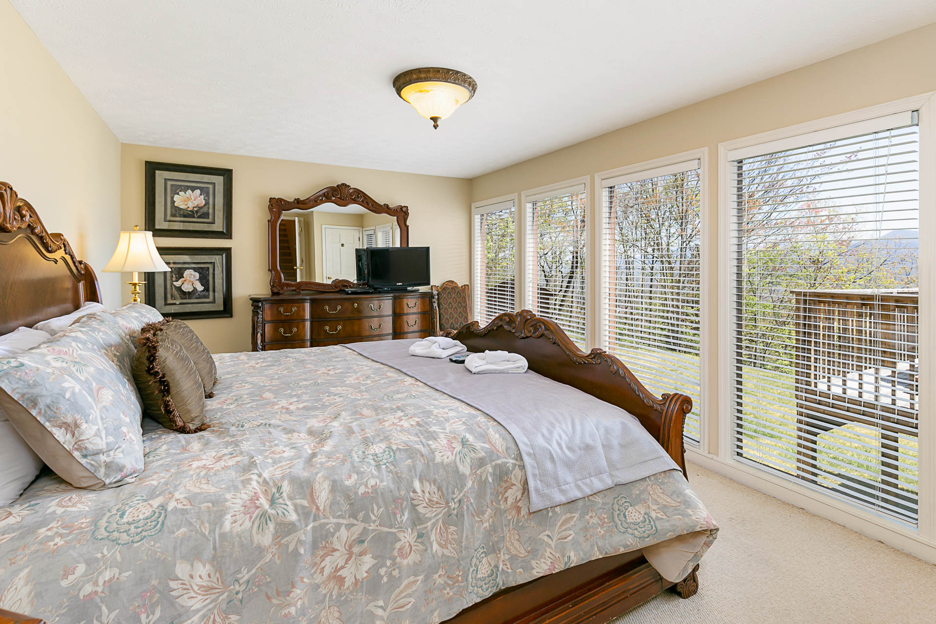 This property exceeded our expectations. This trip included 3 couples total. We each had our own King suite. The kitchen was fully equipped which helped us on our mission for elaborate breakfasts and dinners. The pool table was fabulous and the bottom floor where it was situated was also like having a 2nd livingroom. A powder room w/shower and the laundry room was also located there. It was very hot during our week there, so we could choose the outside deck or the screened covered one on the front side of the house. The long level driveway is a bonus for anybody that has to accommodate multiple cars or a trailer. The view was magnificent. My wish to see bears this trip came true in a big way. Twice driving to town we saw mama and her cubs and next day we saw daddy. It became more personal when we came home one night to find both the van doors wide open. At first it was assumed it was a person, but upon further investigation, we figured out it was a bear; claw marks and slobber (van door handles are flip type). Ha! Next day mama and cubs came to visit our deck and yard. Got awesome video and pics. This was a biker week for us. The house location made it easy to get off the mountain quick. But checkout morning, our guys left first. Just as we girls were about to leave, there was mama and cubs again...most likely smelled food in our loaded van. When we realized it wasn't locked, we had to think fast. We used the alarm on the keyfob to scare them away. Keep that in mind if you get lucky enough for them to visit. Best choice in rentals and will definitely return here...the sooner the better!Sandra B. - Posted: 7/22/2017