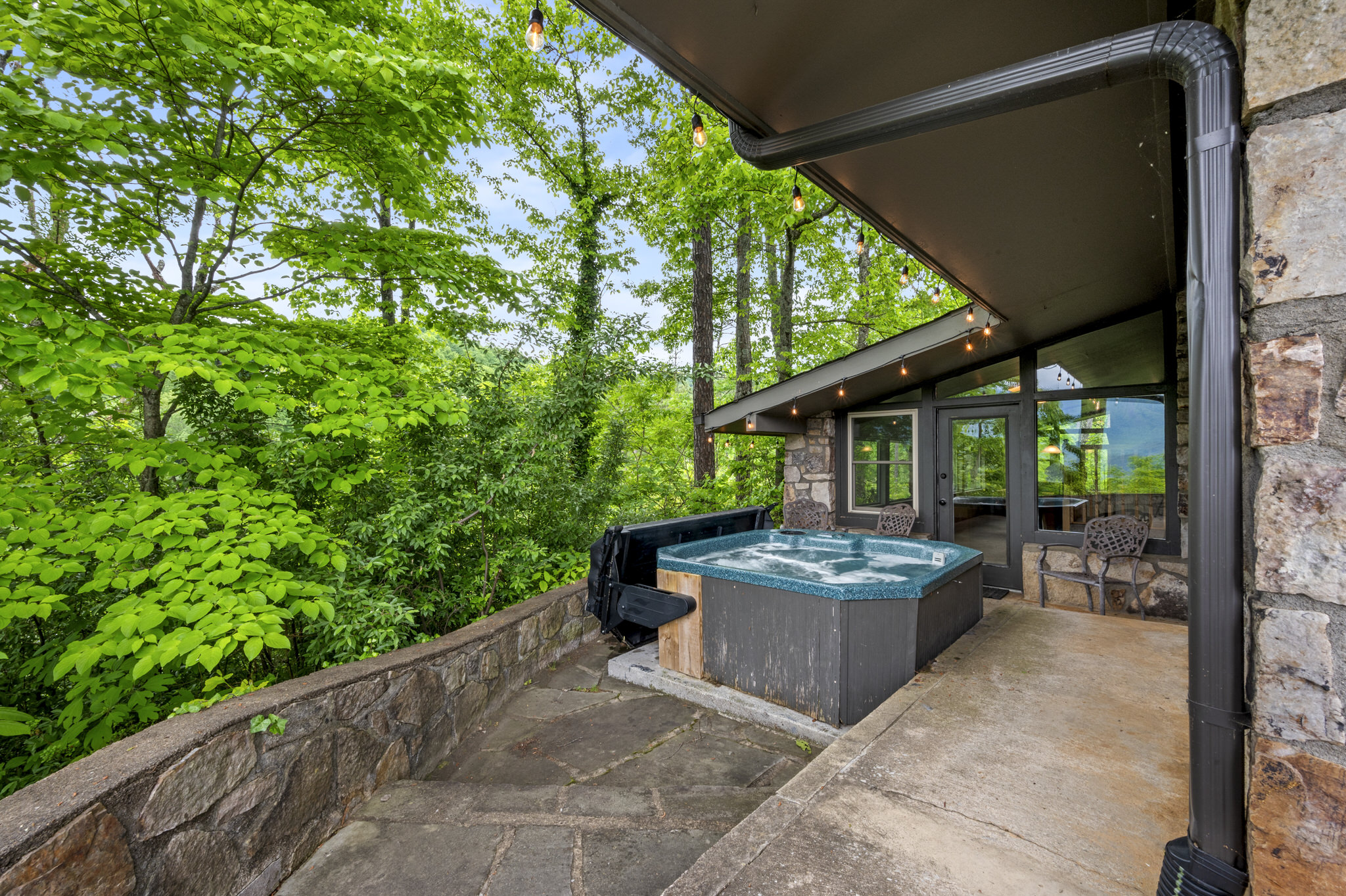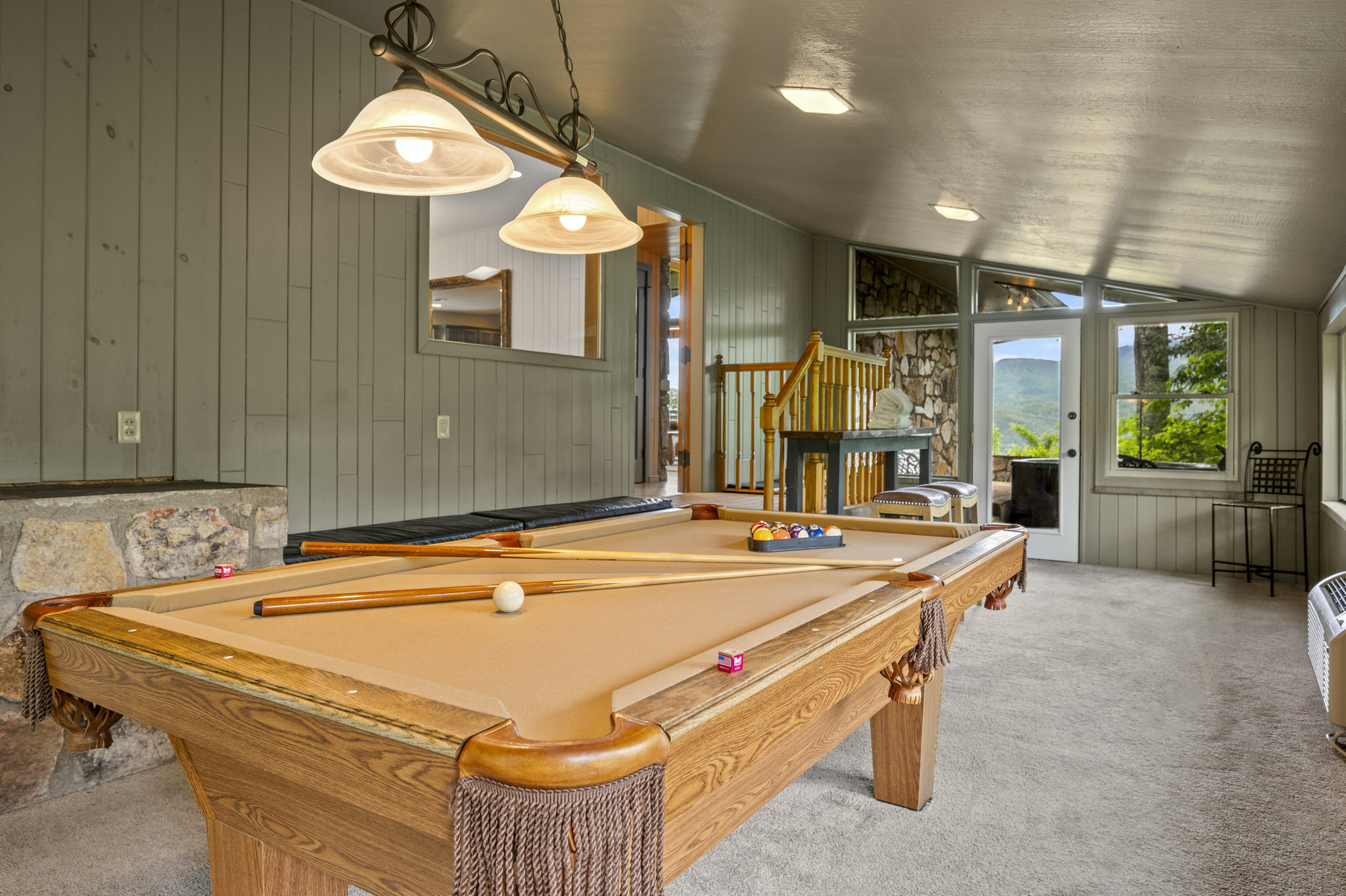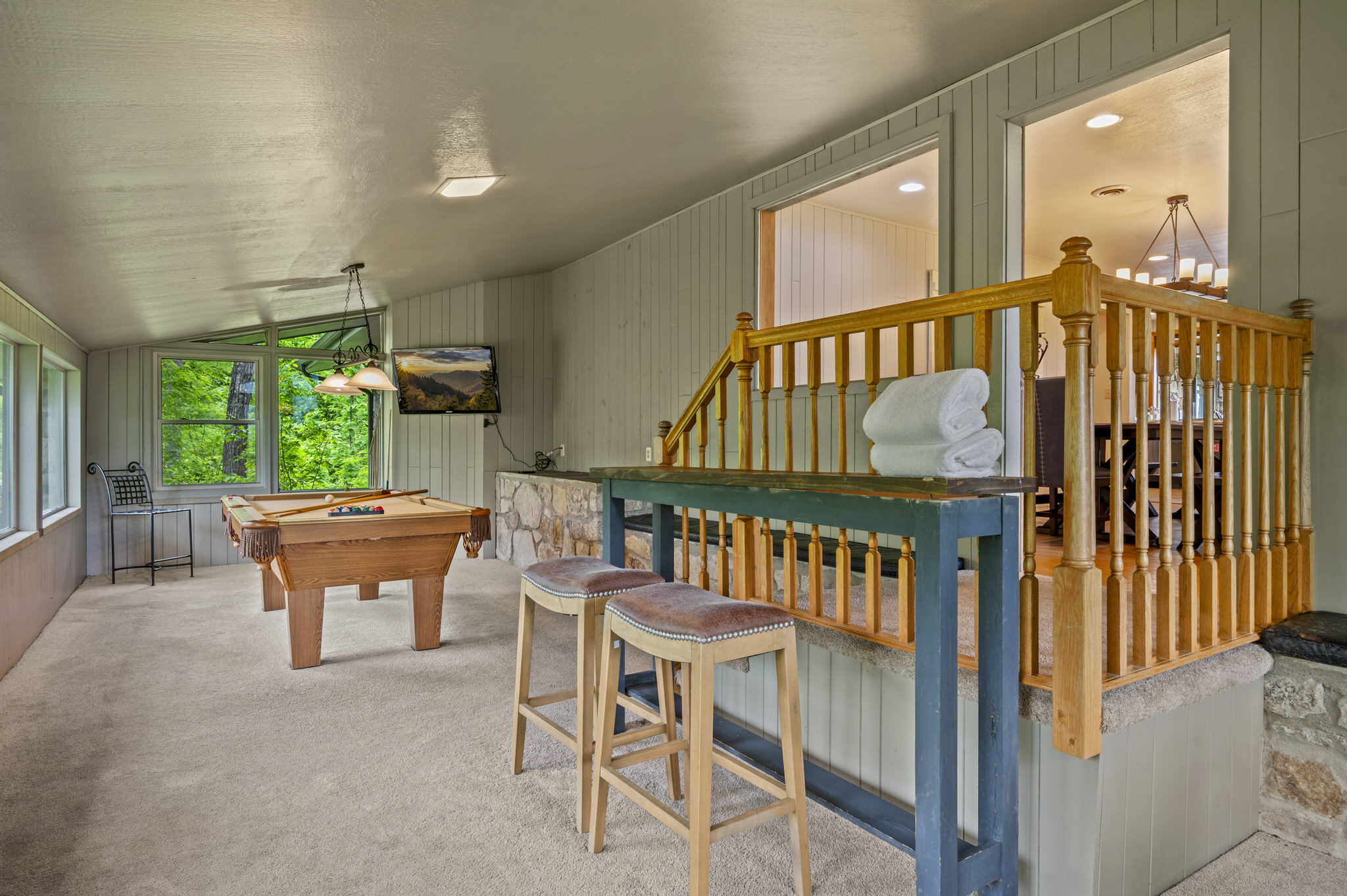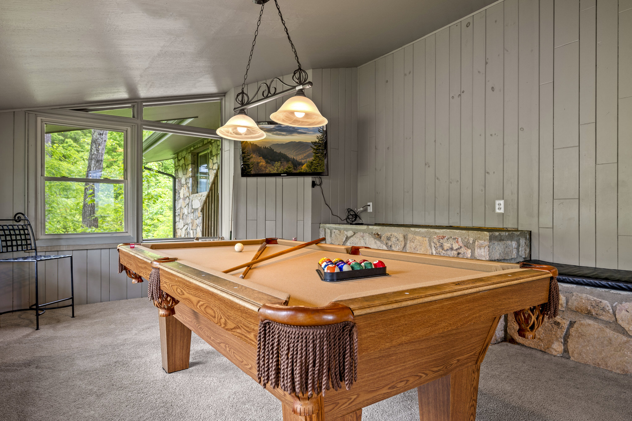 For added entertainment, a sunny game room awaits, complete with a pool table and access to the outdoor flagstone patio featuring a bubbling hot tub – the perfect spot to unwind and soak in the peaceful surroundings. Wraparound decking extends to the front of the home, featuring a row of inviting rocking chairs, inviting guests to linger and soak in the beauty of the Smokies.