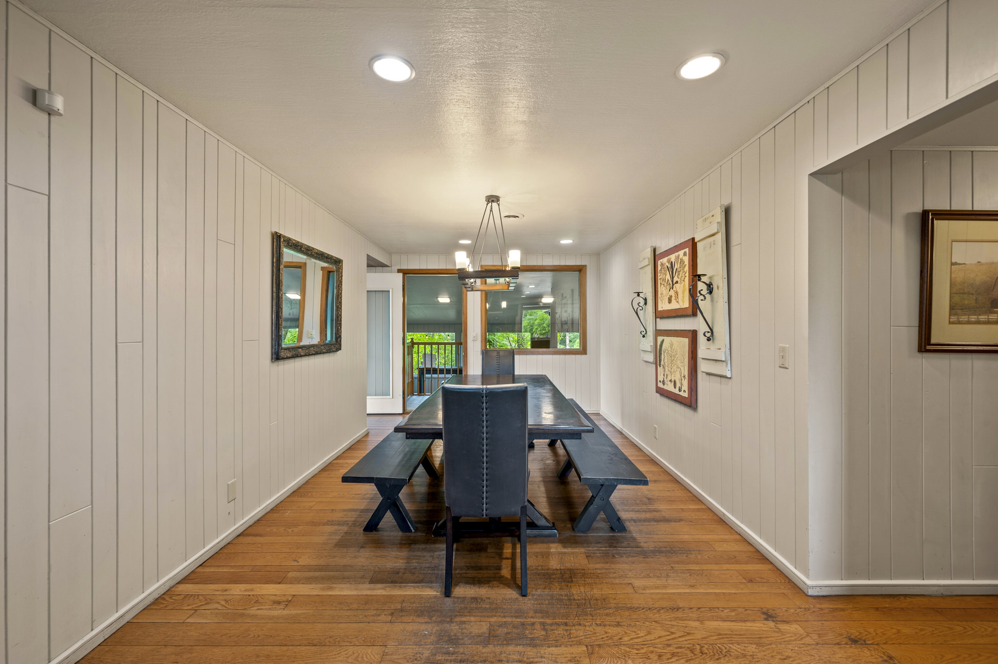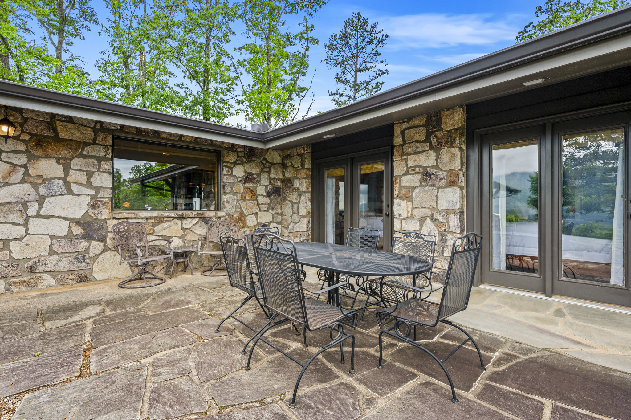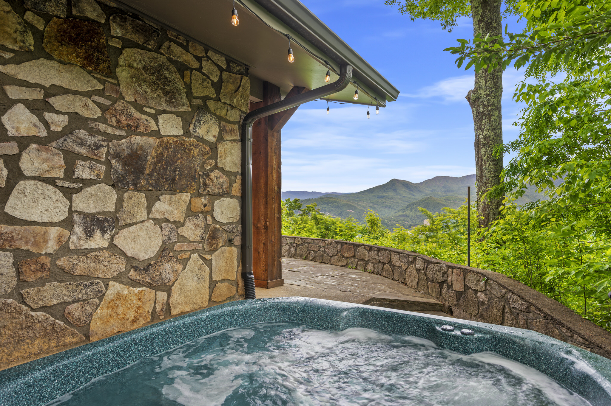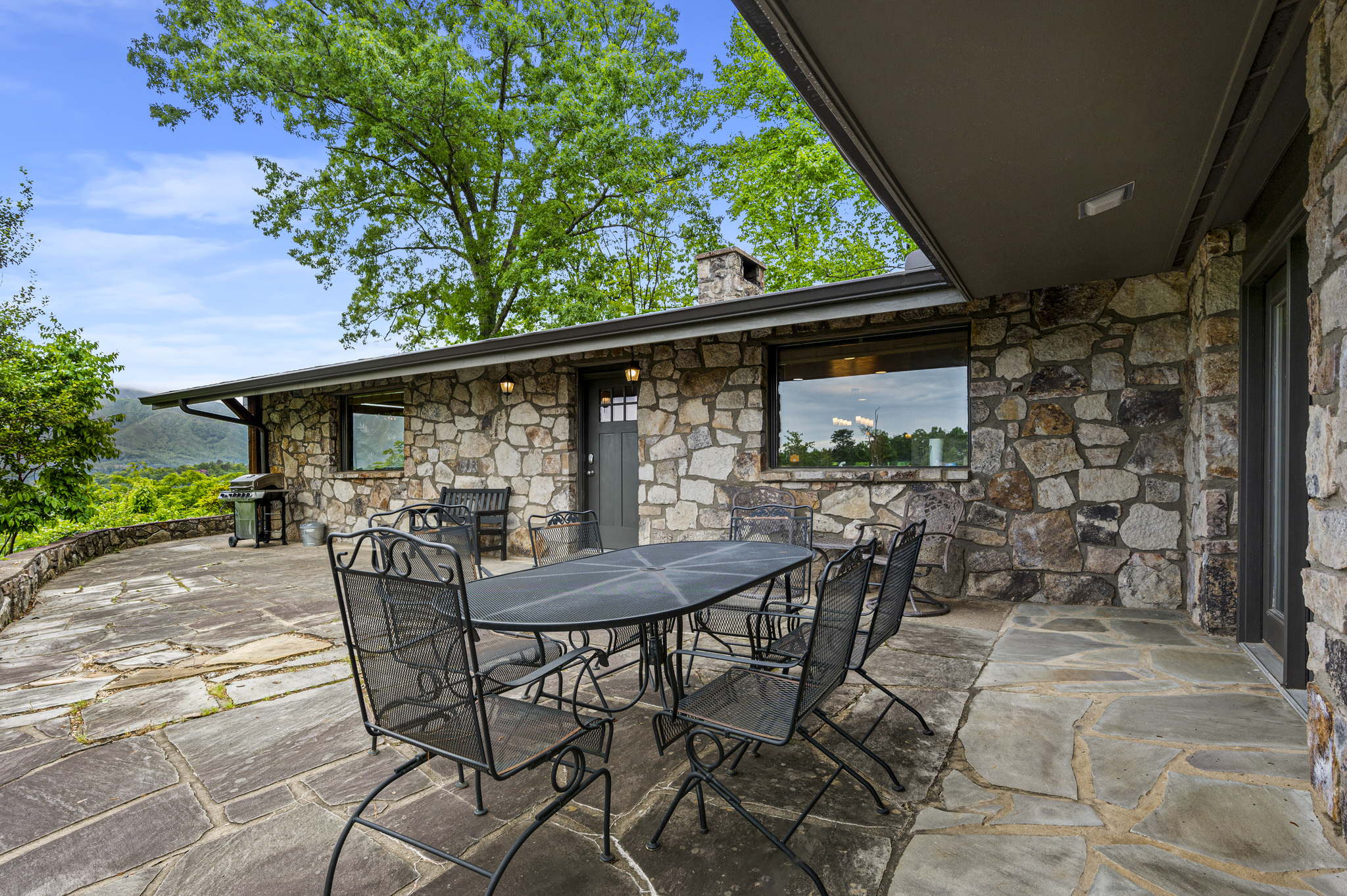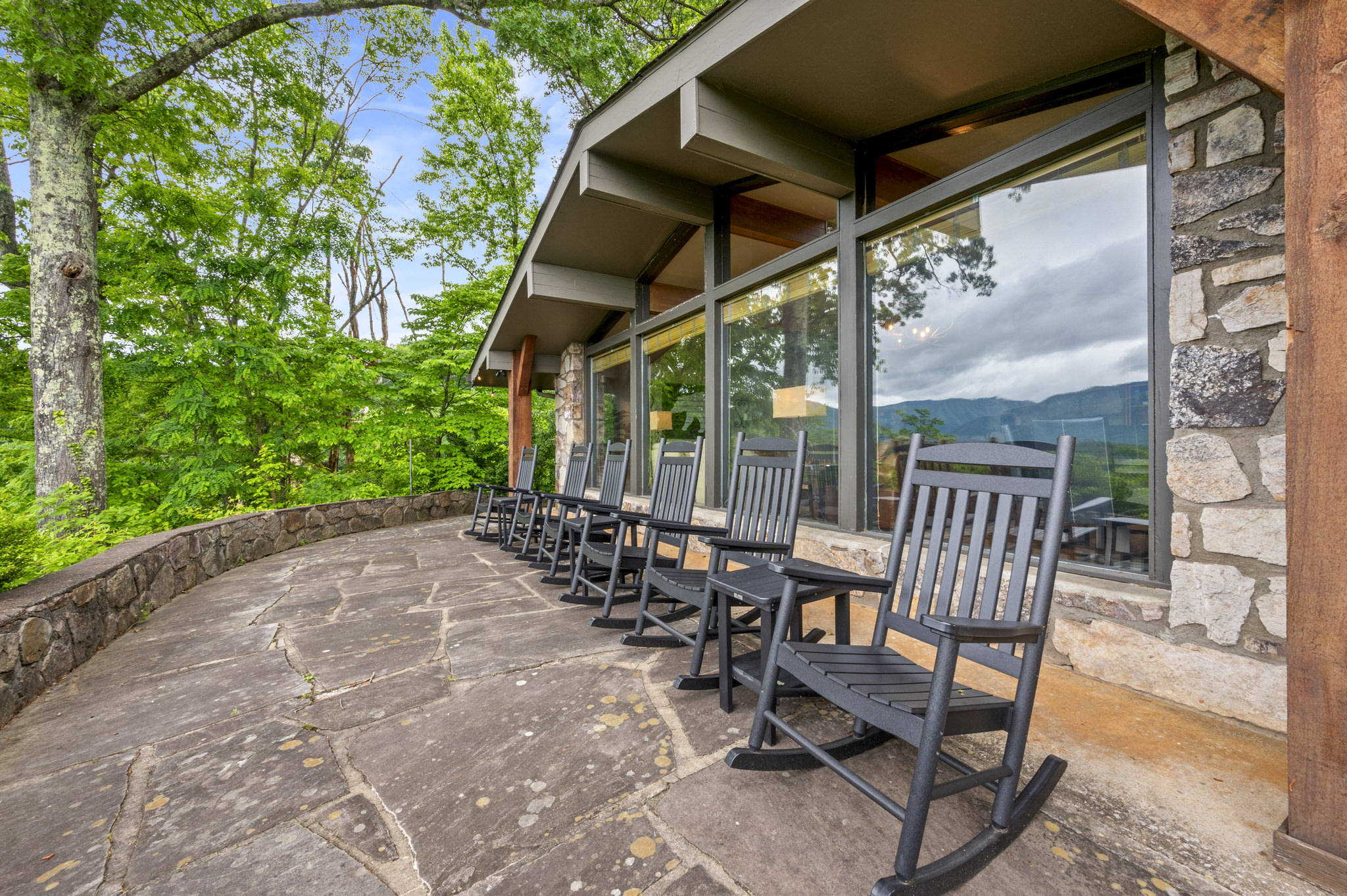 For added entertainment, a sunny game room awaits, complete with a pool table and access to the outdoor flagstone patio featuring a bubbling hot tub – the perfect spot to unwind and soak in the peaceful surroundings. Wraparound decking extends to the front of the home, featuring a row of inviting rocking chairs, inviting guests to linger and soak in the beauty of the Smokies.