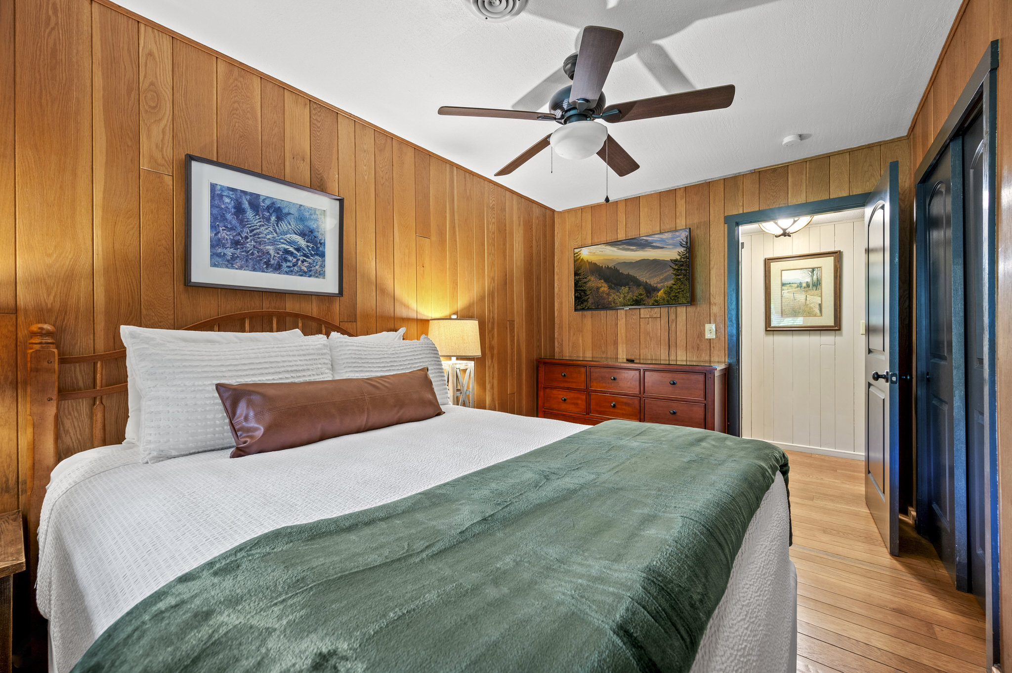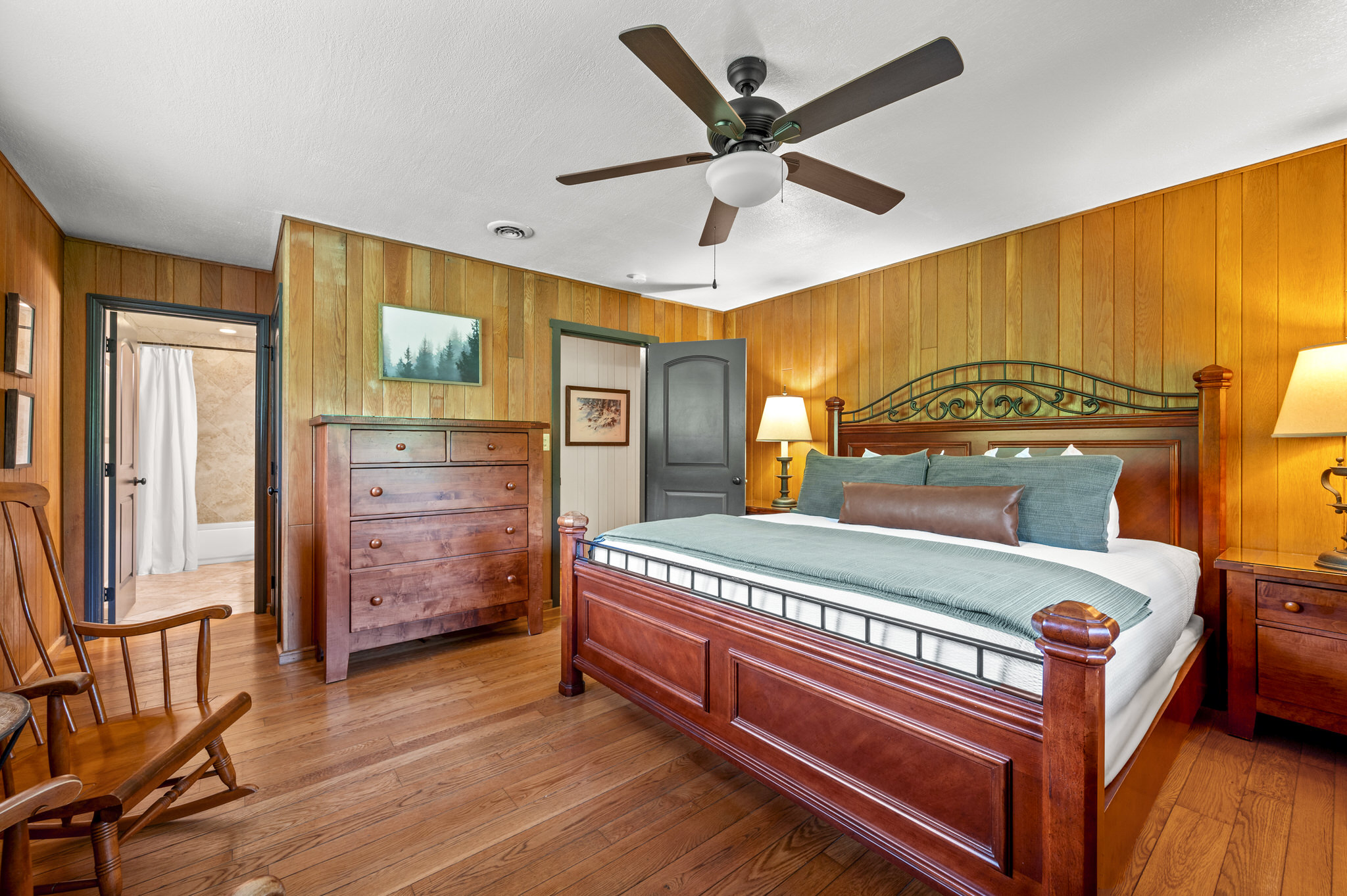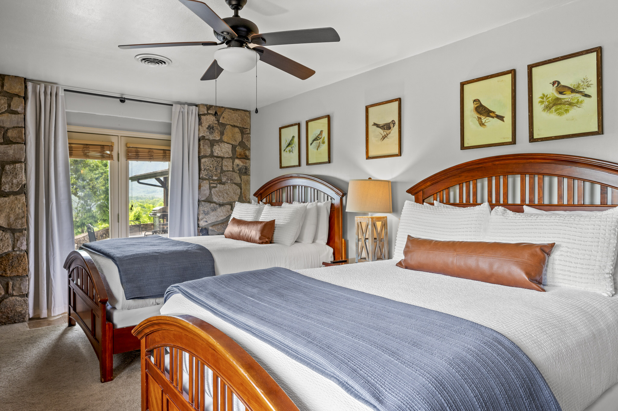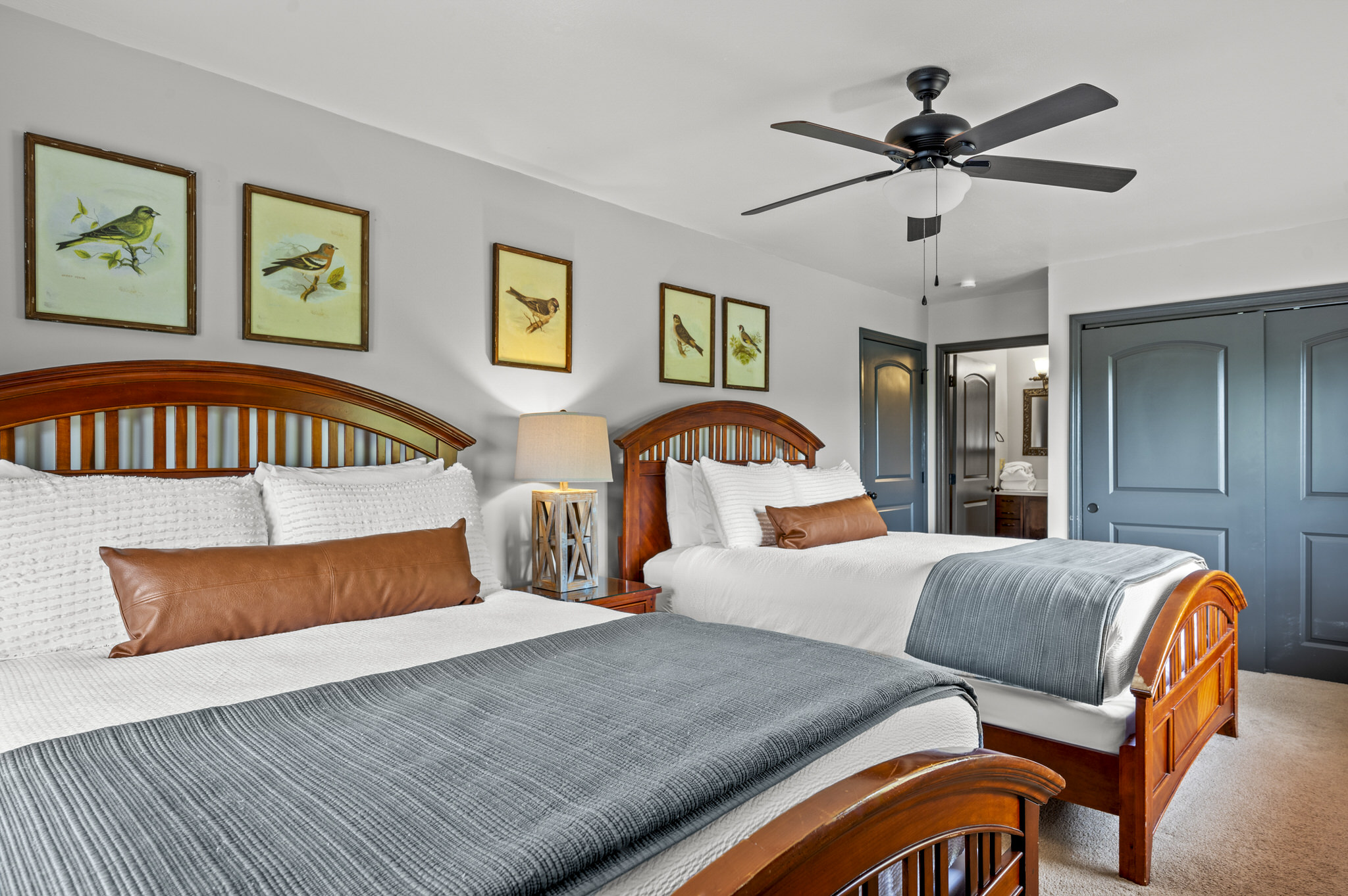Trillium Lodge offers five bedrooms, ensuring ample space and privacy for all. A king bedroom and a queen bedroom each have access to separate hallway bathrooms, while two additional king bedrooms boast ensuite bathrooms for added convenience. A final extra-large bedroom suite welcomes guests with two queen beds and a private bathroom, ensuring a restful night's sleep for all.