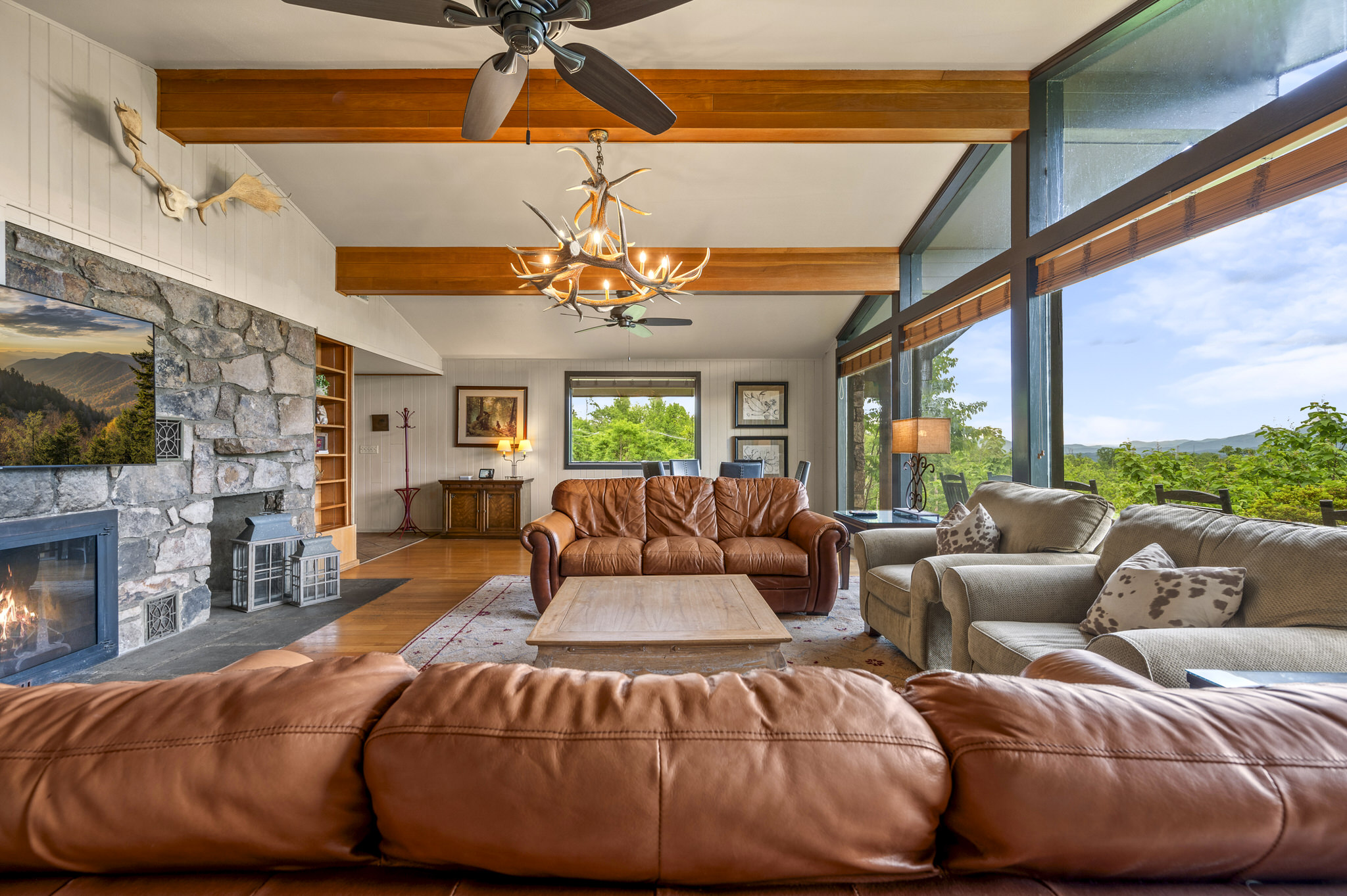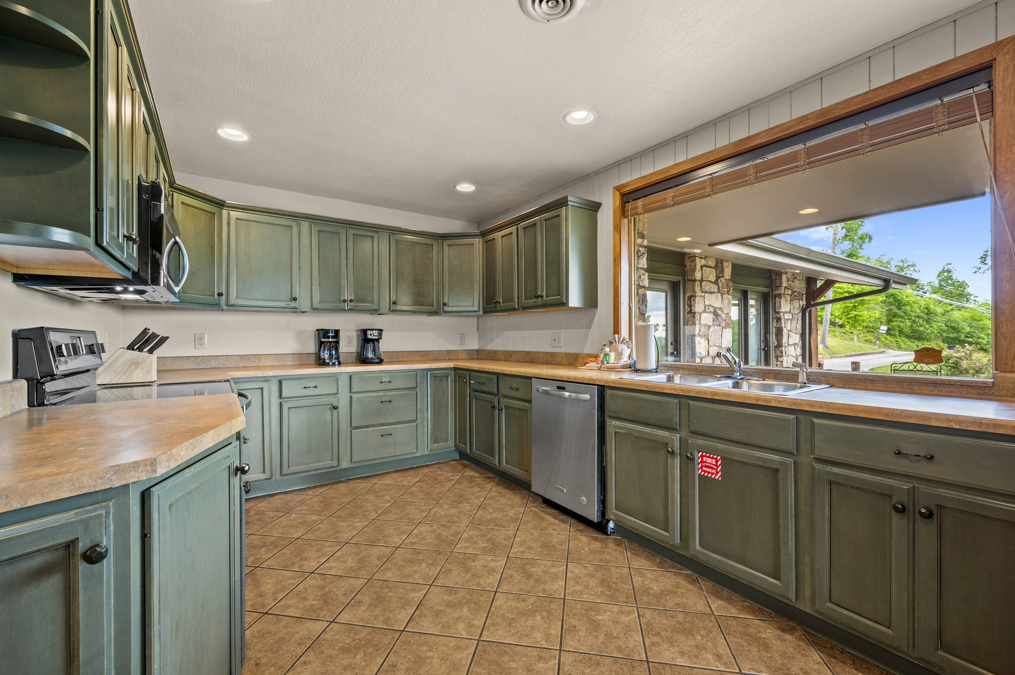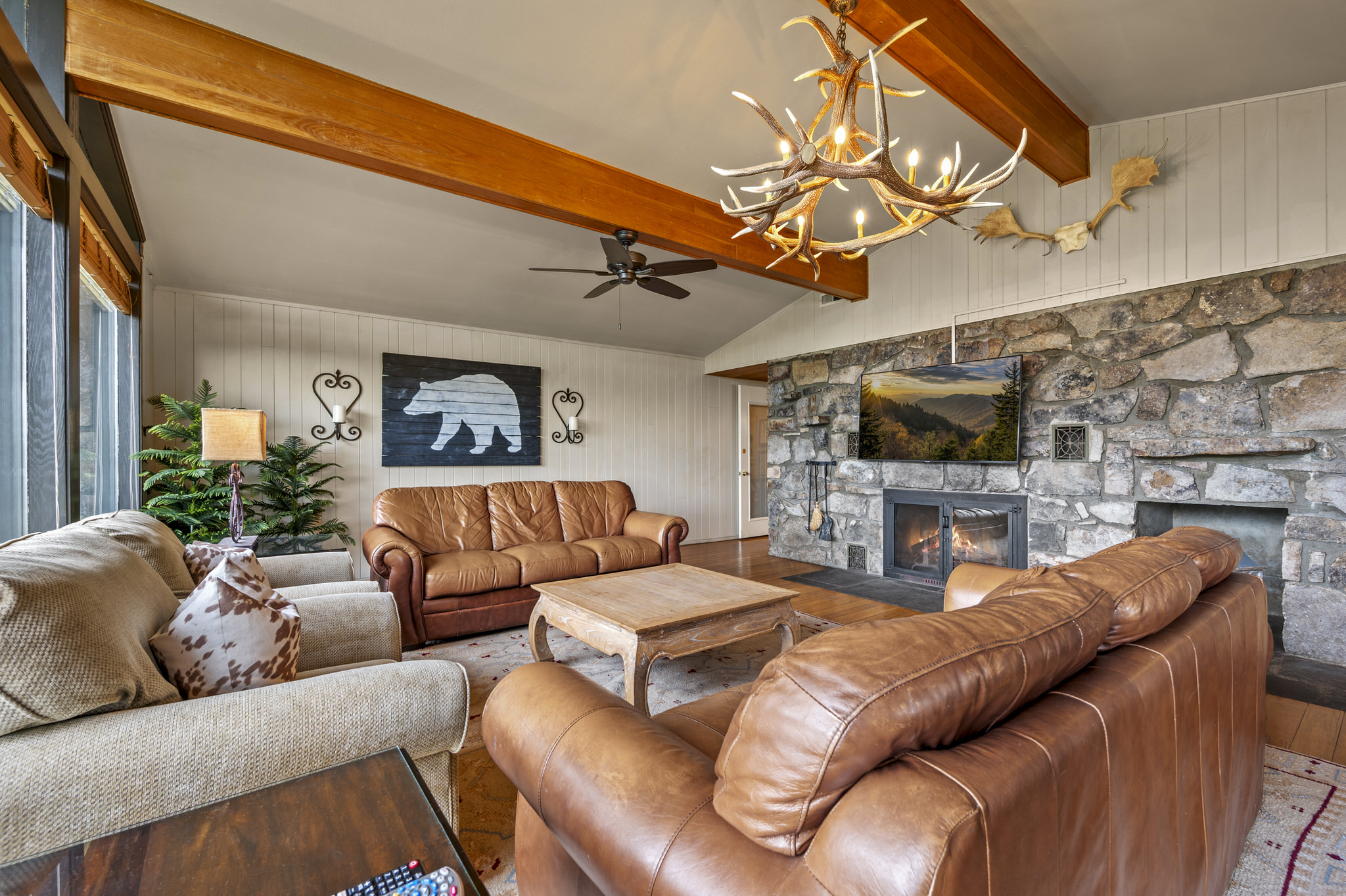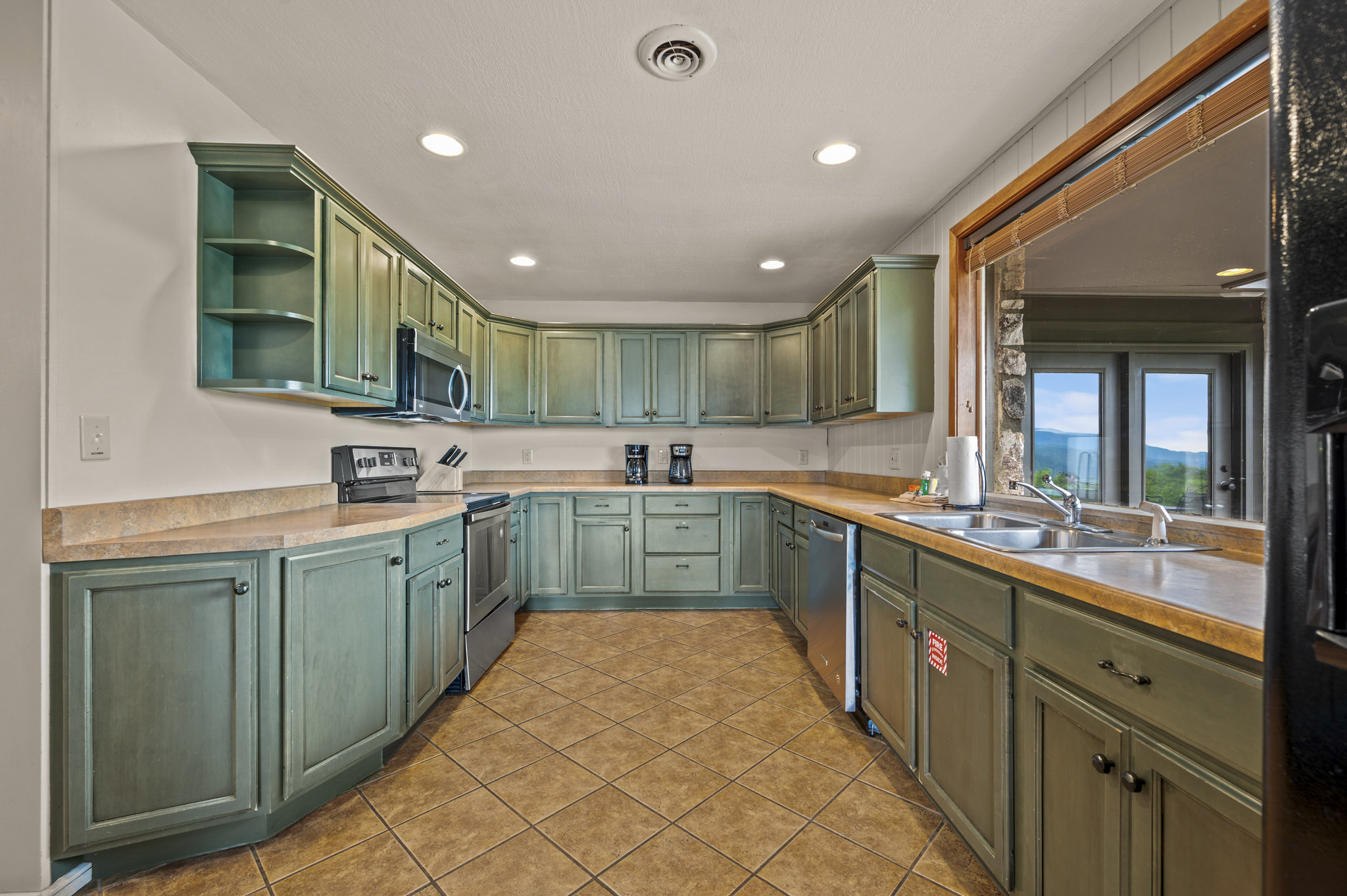 Step inside and discover a spacious kitchen, fully equipped to cater to the culinary aspirations of your group – just remember to bring along your favorite groceries. Adjacent to the kitchen, a generous dining area beckons for shared meals and lively game nights, while the expansive living room offers a den of comfort and relaxation. Sink into the plush furnishings, admire the mesmerizing views, and gather around the crackling fireplace for cozy movie nights.